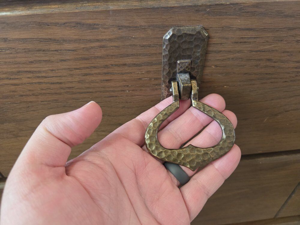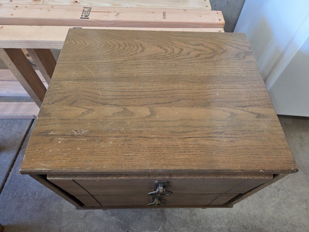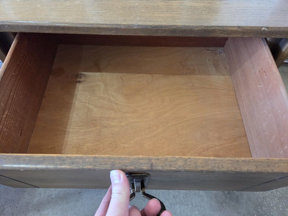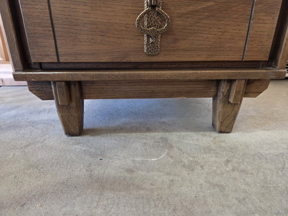 VenmoMCM wood bedside or end table with two spacious drawers. Unique detailing with hammered metal hardware.