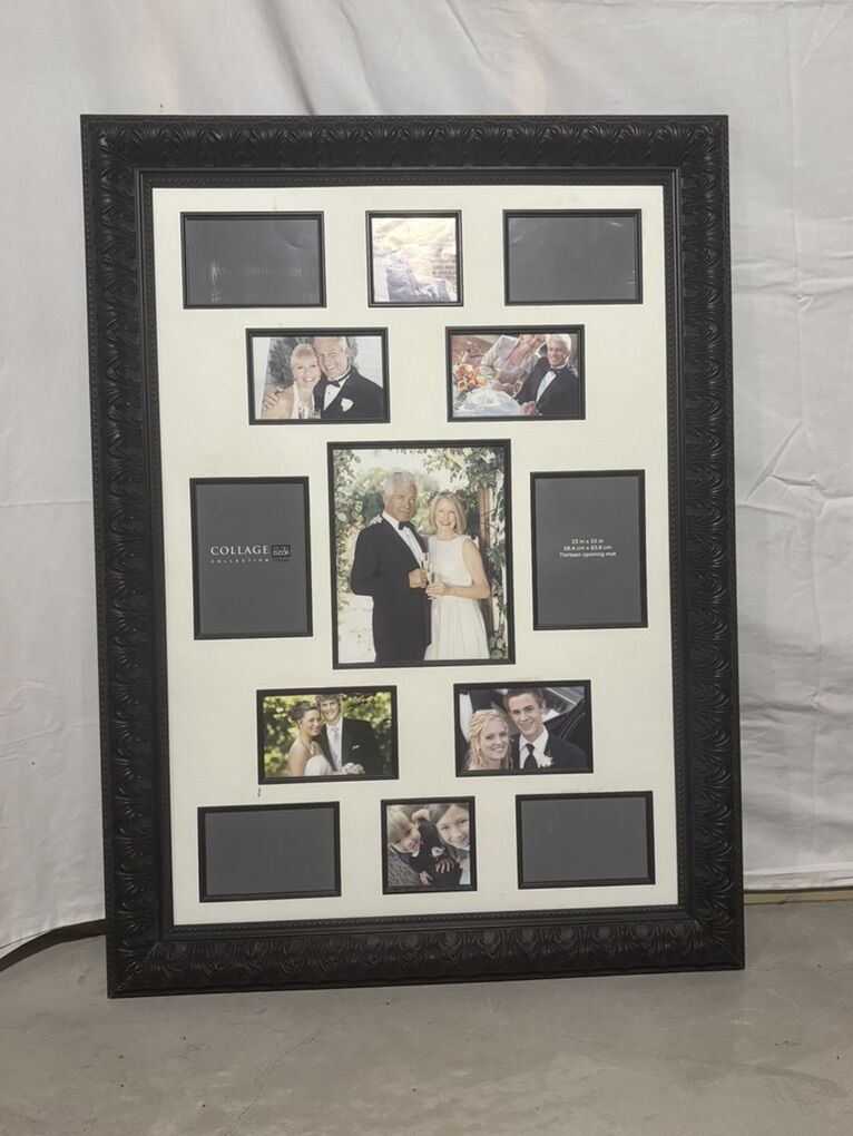Beautiful decorative collage frame with an ornate dark wood design. Fits 11 photos of various sizes (great for family portraits, weddings, or special memories). The frame itself measures approximately 25 in x 33 in with a thick decorative border that really makes it stand out.
