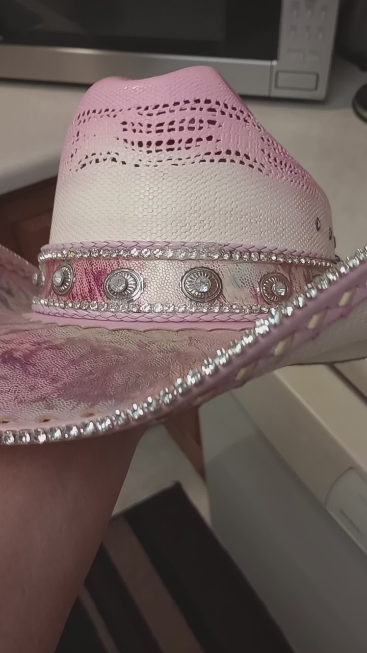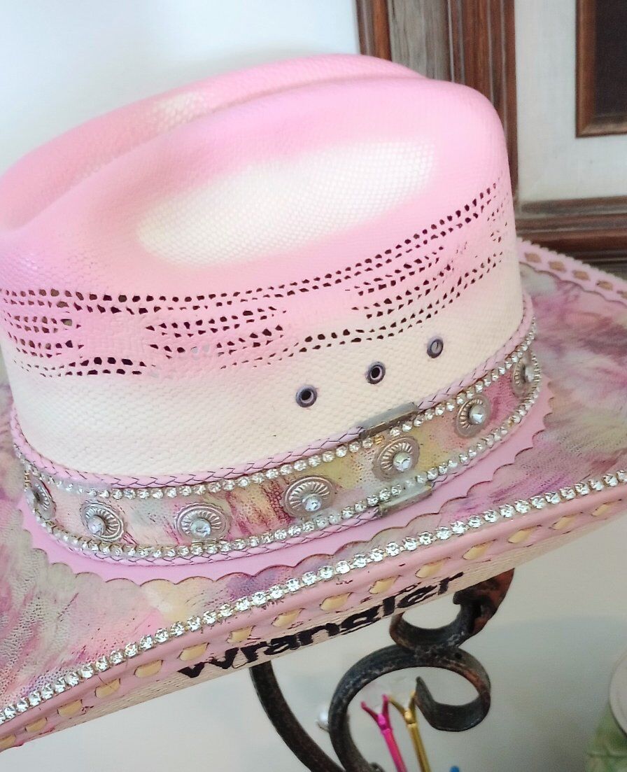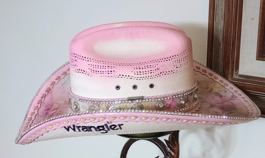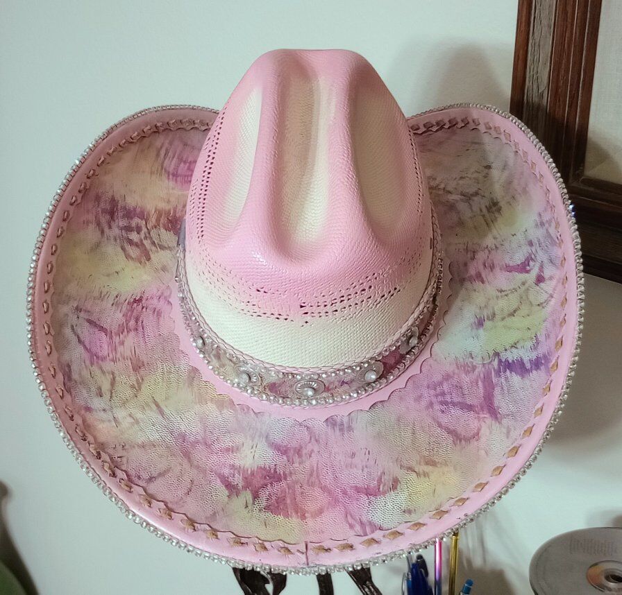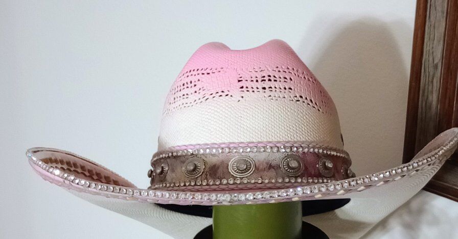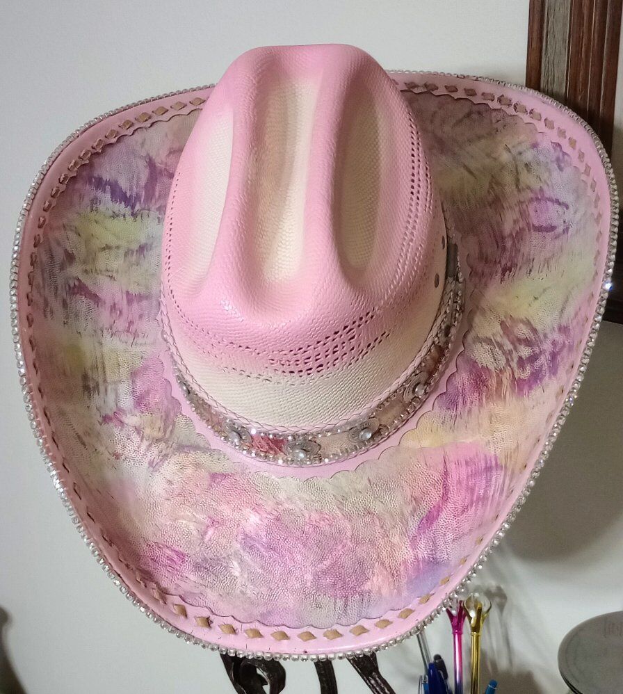 this is a totally custom hat made on a wrangler 20x straw. The top of the brim and hat bands are all leather and it is adorned with rhinestones on the edge of the brim, as well as on the hatband as well. This is a one of a kind, you will never see another like this. I am asking 260.00 for the hat and it is a size 7, if you would like to check it out, just shoot me a text to Steve at 801-623-1373 to schedule a time to drop by and see it! I only accept cash! And be sure to check out all my ads here in KSL, happy shopping!