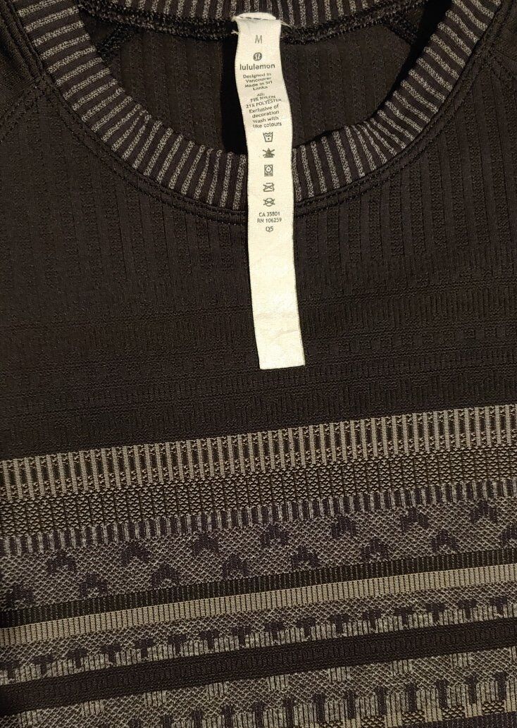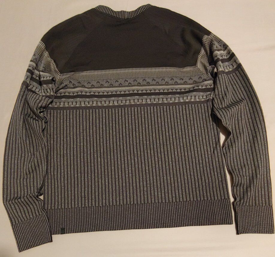 Ladies Lululemon Rest Less pullover top is the on-the-go top to wear from the great outdoors to the office and anywhere in between. One top for a variety of occasions - activewear, athleisure, casual, or business. The black/white/titanium (gray) combination color tones will match any color bottoms. The fair isle print is a classic one to have in your collection.
