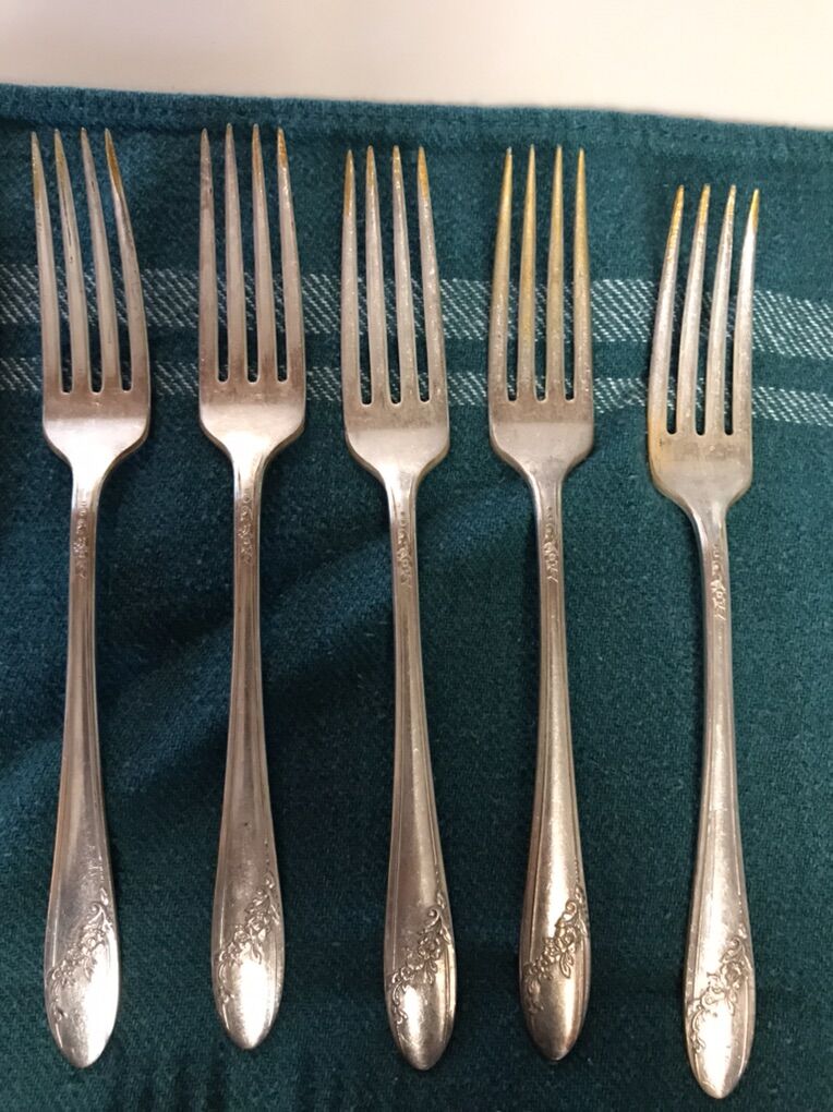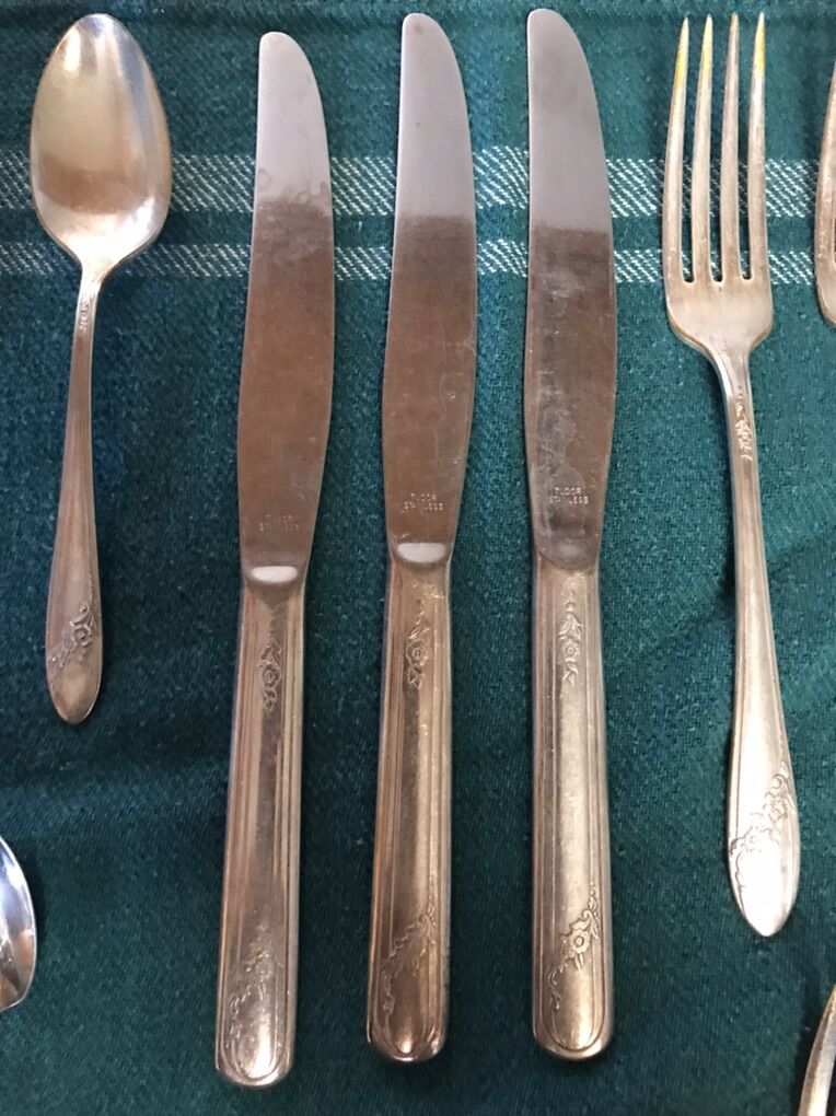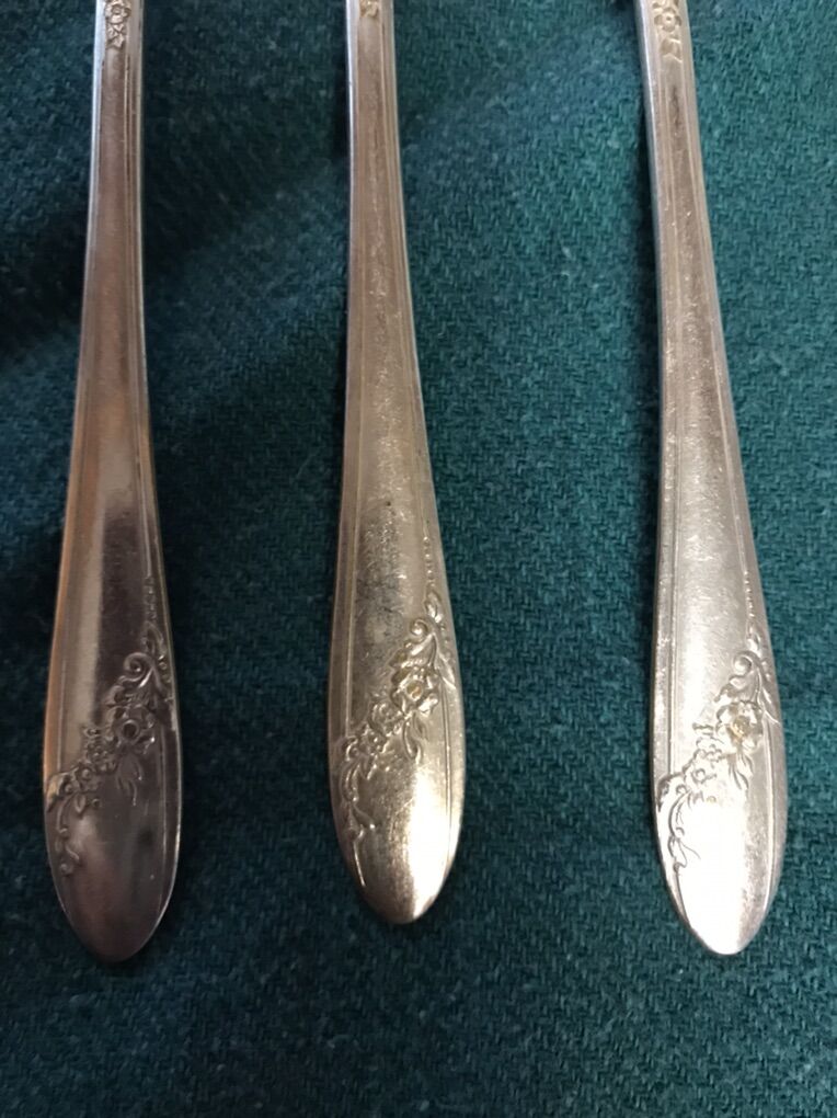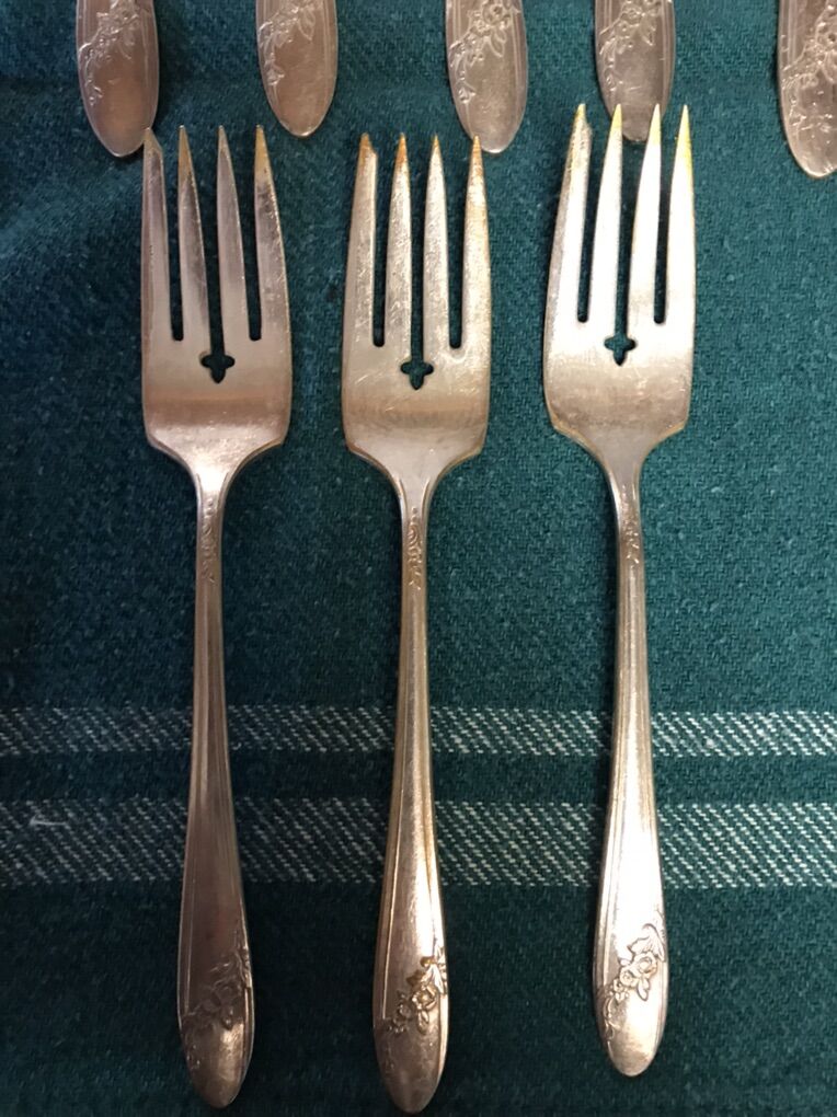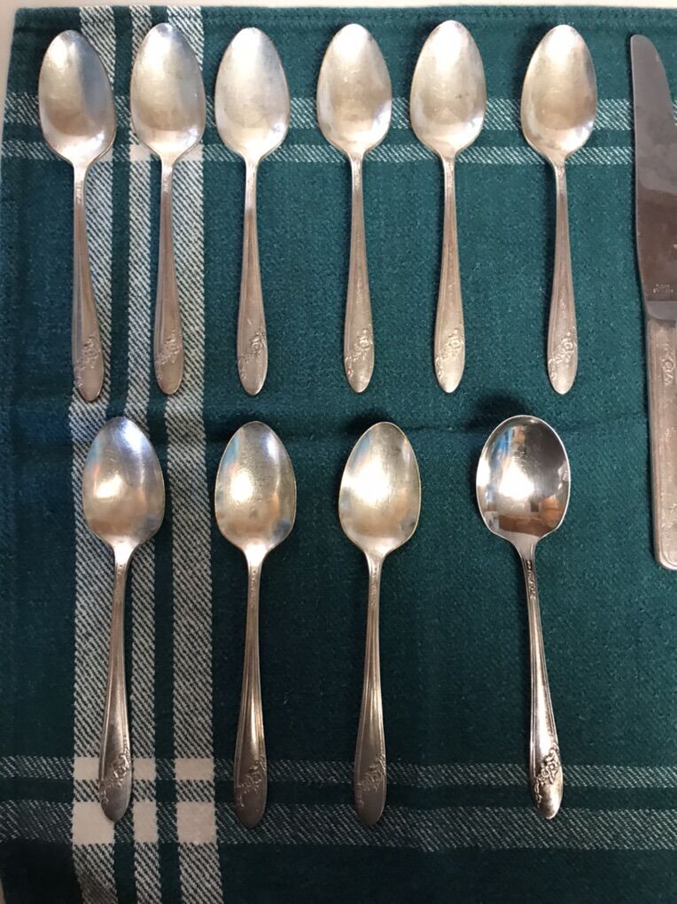 Vintage Oneida Community Tudor Plate -- Queen Bess. The Silverware pieces have been in the basement for many years and are old. They are used and need to be polished and cleaned. Some of the pieces look a bit tarnished. Please look at the pictures. 3 Butter Knives 9 Teaspoons 6 Dinner forks 3 Salad forks 1 Teaspoon 22 pieces in total Cash Only Text Chris 801-882-6881