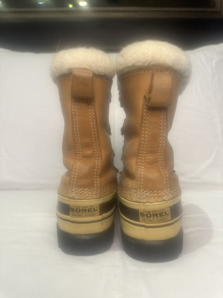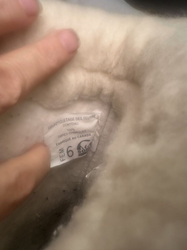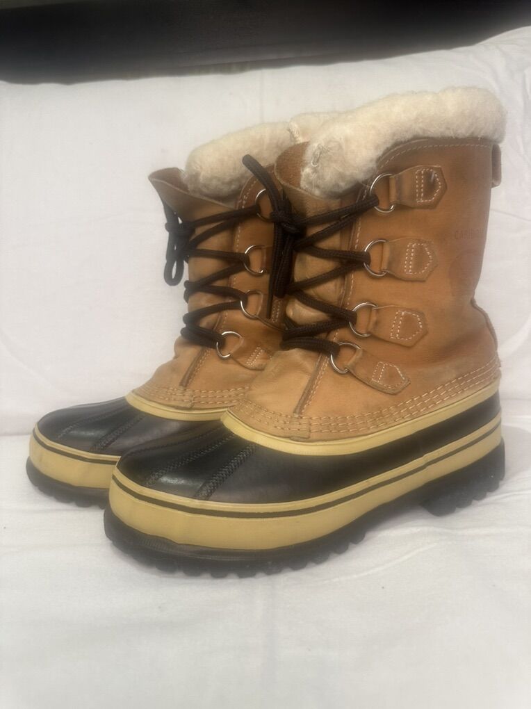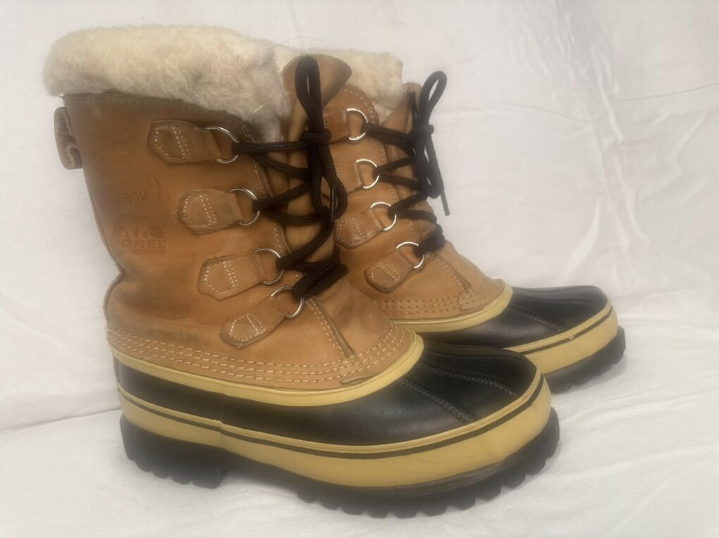 Sorel caribou women’s size 6 beige leather uppers with black rubber foot bed and removable wool liners with fur trim on top. These are waterproof and are in good condition. See photos for details. I take cash or Venmo, but cash is preferred. Text is best. 801-201-4446. Check out my other ads for additional sizes and styles.