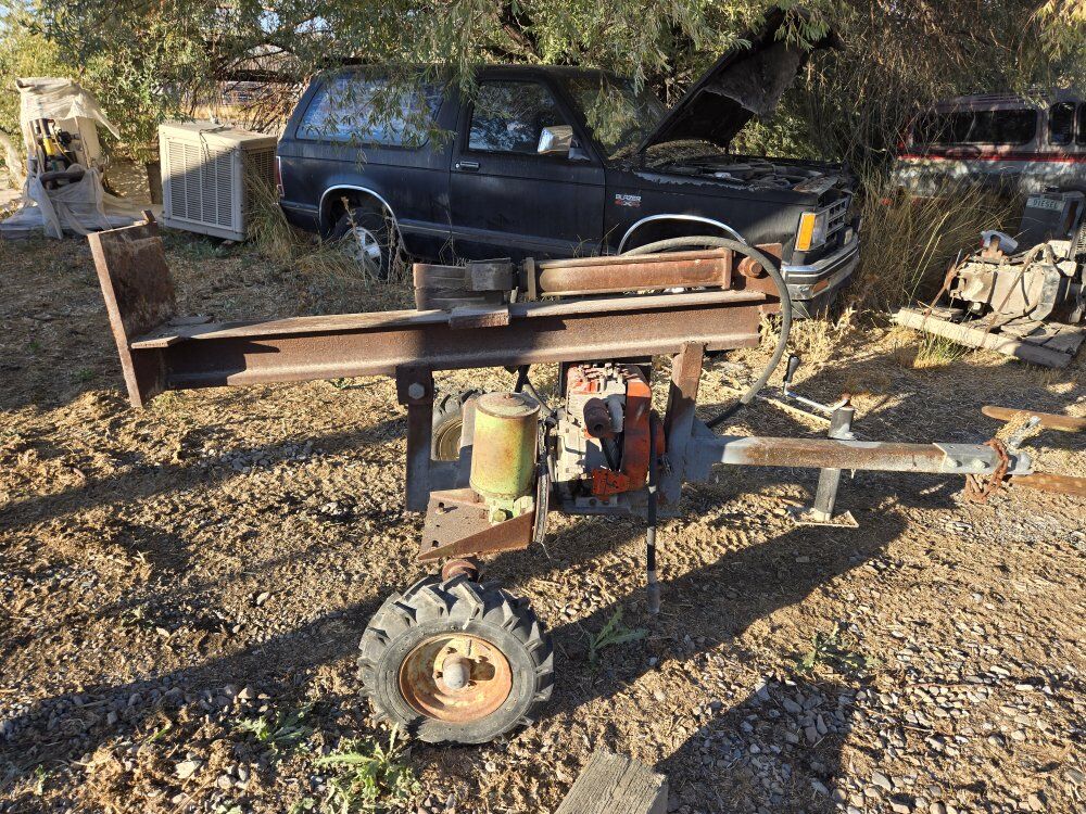 Homemade log splitter out of railroad track. It has flat hydraulic fittings on it to plug into a skid steer. Engine does not run. Has good tires & a 2" ball.. call Alan 801-420-4620 no text.