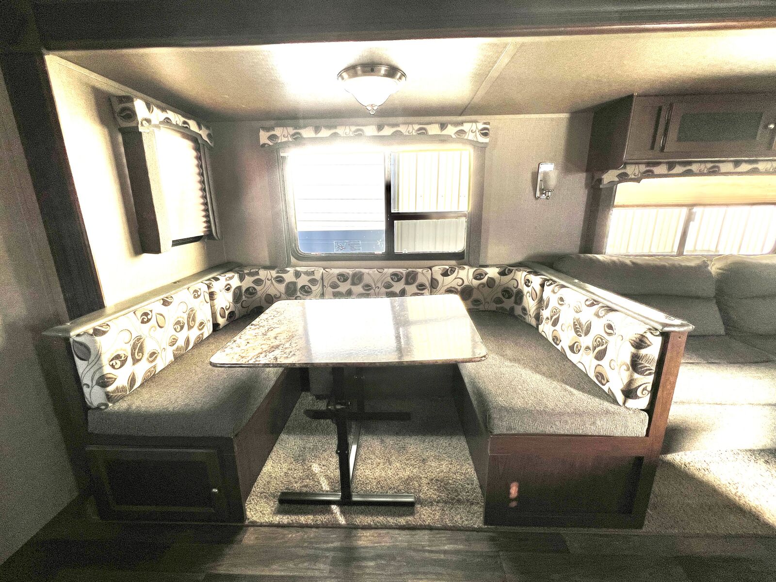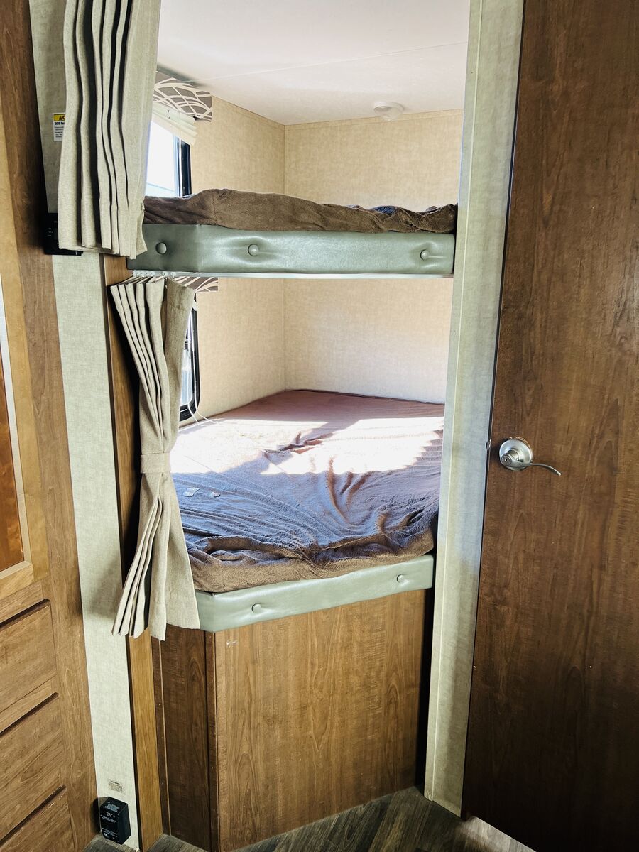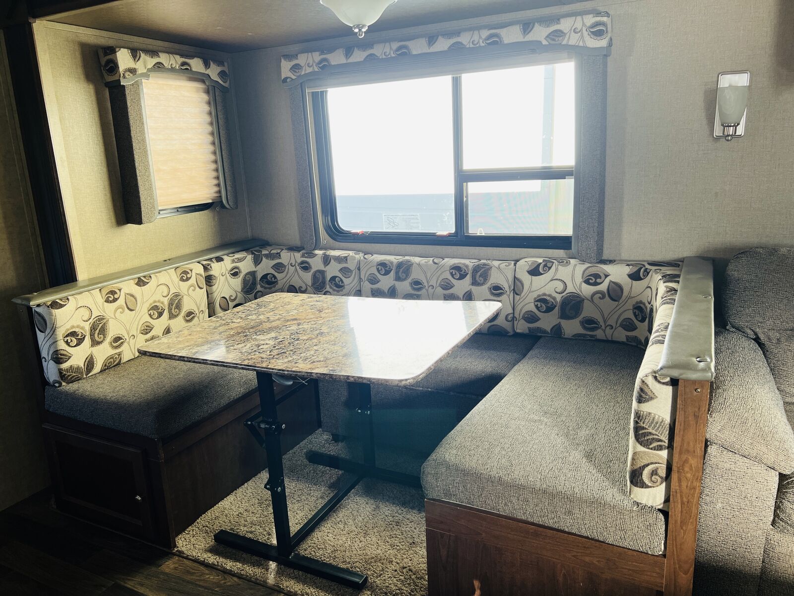 Family-Friendly LayoutPrivate front bedroom with queen bed and storage Double-over-double rear bunks for kids or guests Large U-shaped dinette and sofa for dining or lounging Sleeps up to 8 comfortably