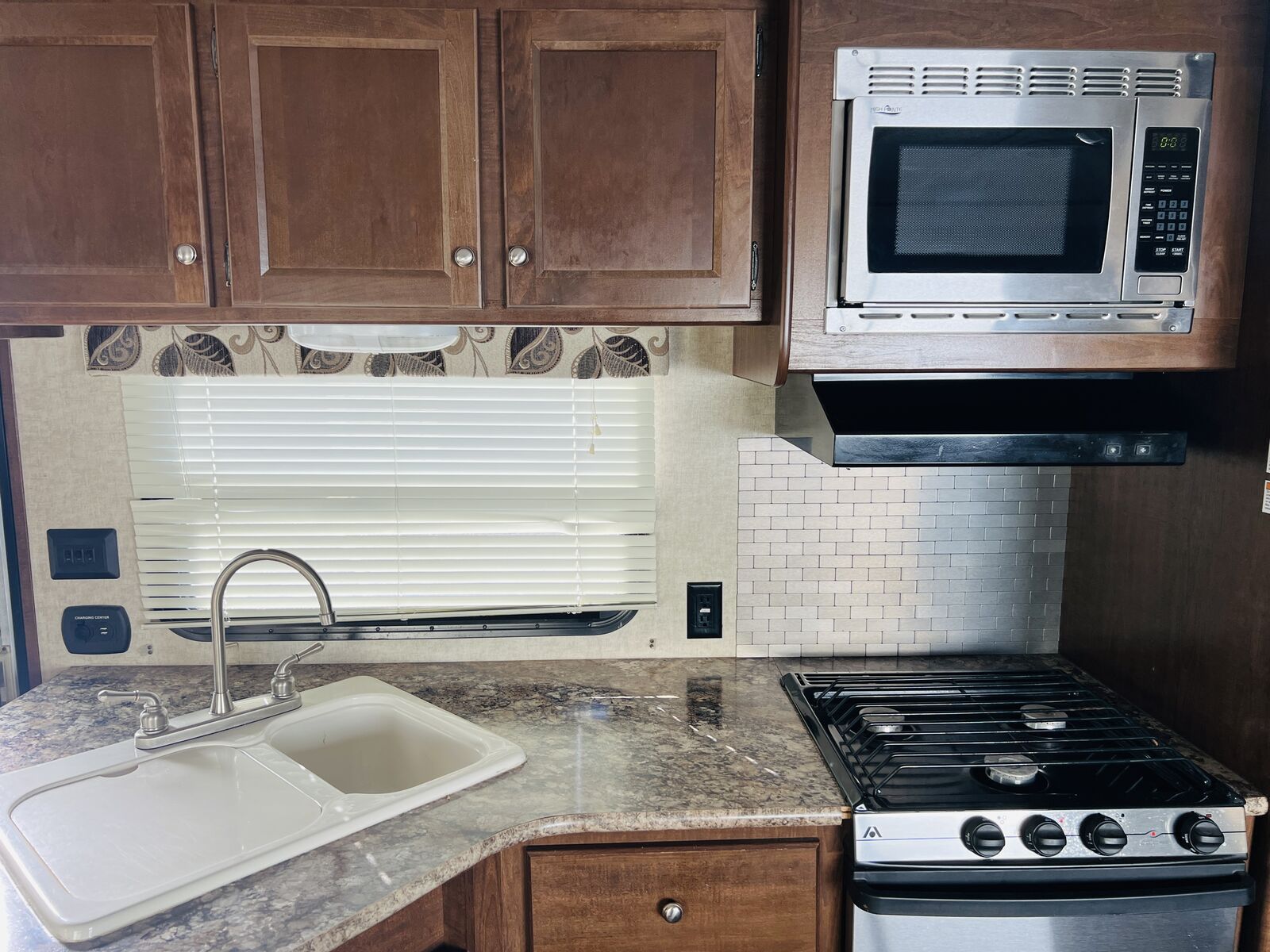 Fully Equipped Kitchen3-burner range with oven, microwave, and double sink Mid-size refrigerator to keep your food fresh Overhead cabinetry for all your essentials