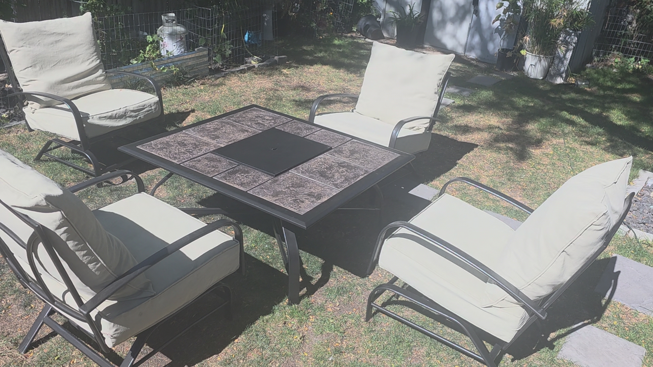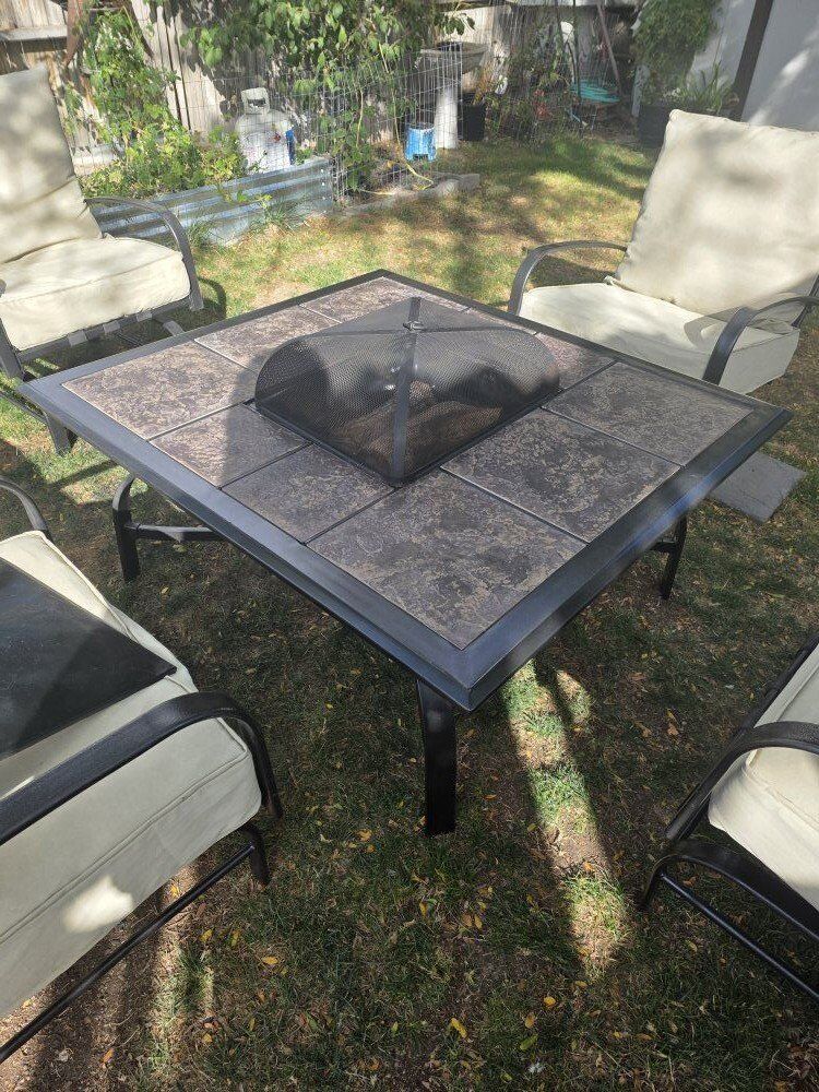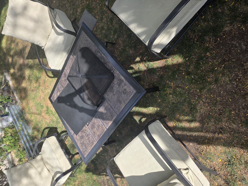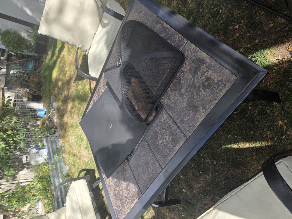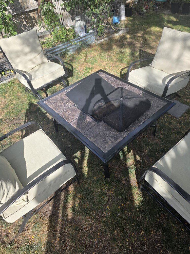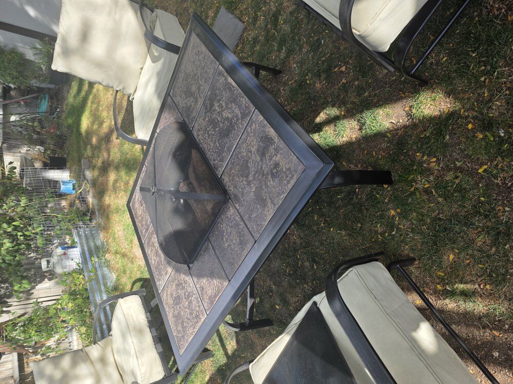 VenmoPre-loved and refinished outdoor wood burning fire pit table( o am including for free as I git a different one)and 4 deep seat rockers( not skinny chairs). Firepit is vintage but wood-burning option was never used. I refinished them but ended up getting new set all together. There are couple of blemishes on fabric(pictured) but you can recover them if you want as amazon has many optionsfor that. Cushions are original. I am giving the normal wear condition as fabric has few blemishes. chairs are much newer and metal frames are in great shape. firepit us included with chairs for free.