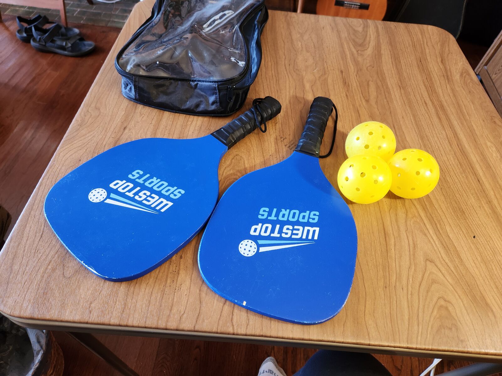 Westop Sports pickleball set, 2 paddles, 3 balls, and carrying case. No problems.