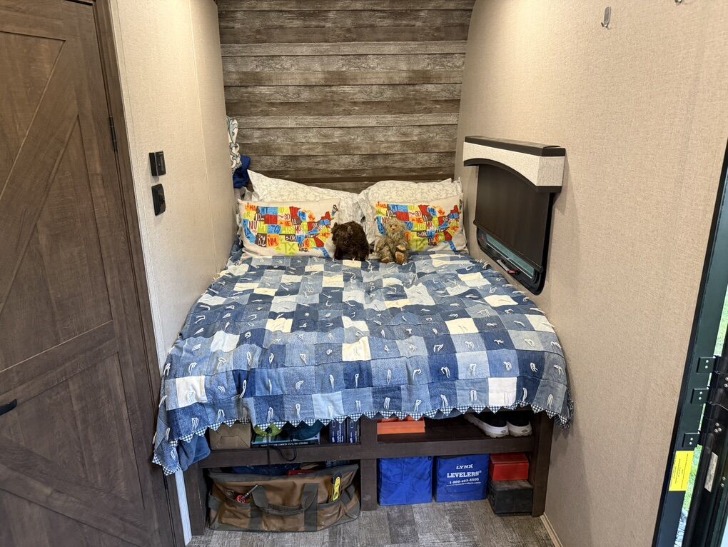 The 2217 is a half-ton towable toy hauler ready to boon dock with an on-board Onan-Cummins generator and holds 17 ft of garage space. The garage is narrow though. If you have multiple adventure bikes, or 2 four wheelers, then this is hauler for your base camp. The only side-by-sides that fit are 50 inch trail models, like the Can Am Maverick Trail, Polaris 900 trail, and the CF Moto. We fit a CanAm Outlander 450 and a Maverick trail behind it. You could bunk 6, and add two more cots for 8 camp buddies.
