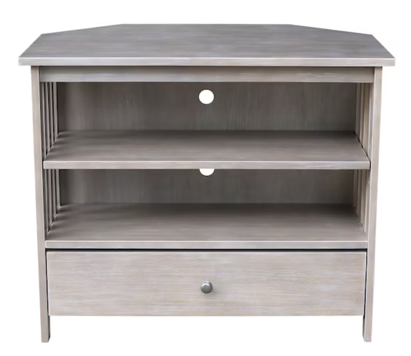 Product Overview Upgrade your living space with this durable and stylish Mission-style corner TV stand. Crafted from solid wood, this unit is designed to maximize space in smaller rooms while providing a sturdy foundation for your entertainment setup. The Washed Gray Taupe finish offers a modern, neutral look that fits any decor.