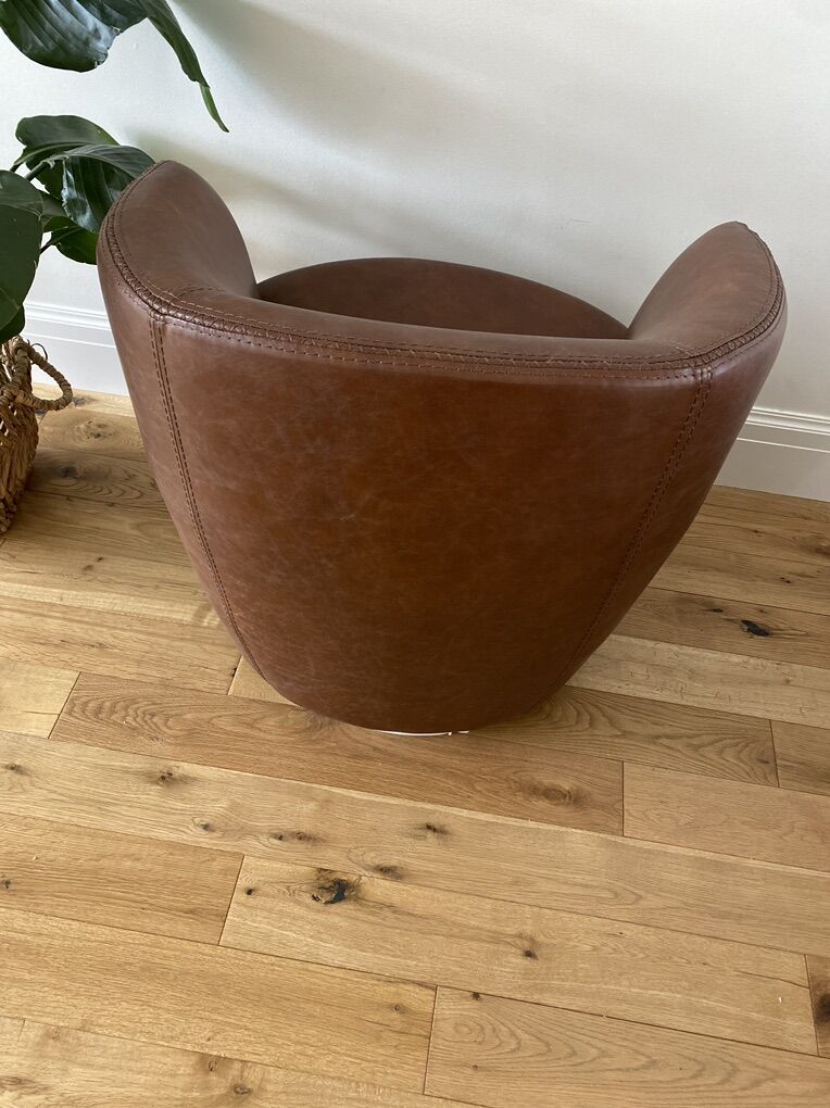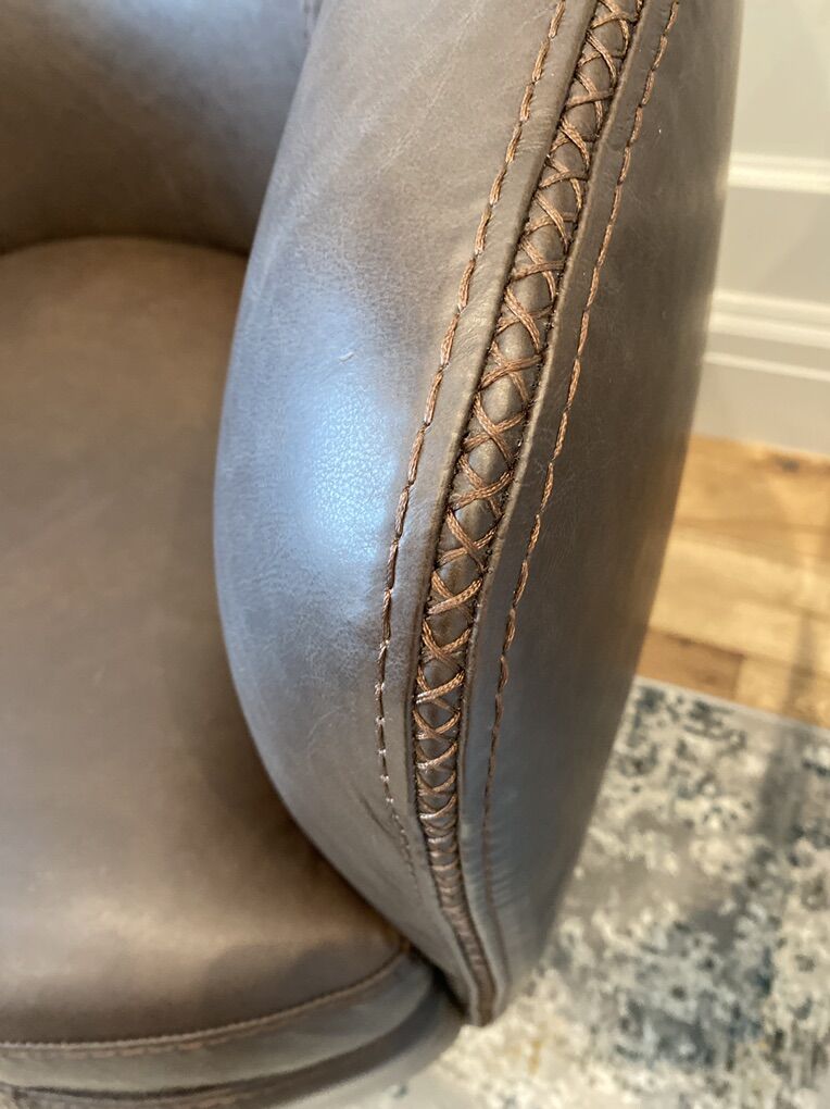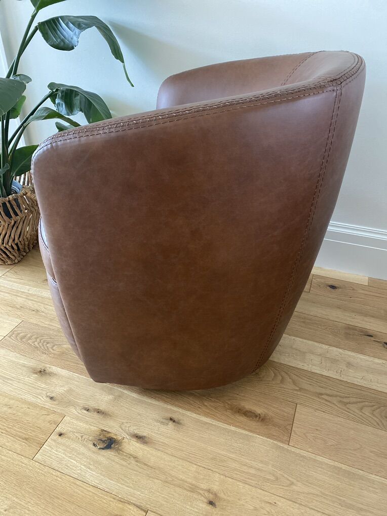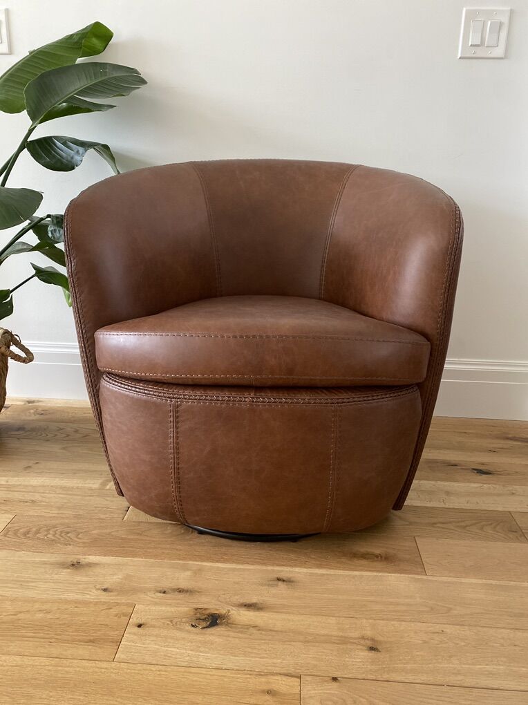 New in box. Low profile barrel chair. Wrapped in soft leather. 360-degree swivel action. Decorative stitching. Available in 3 colors. Price is for each chair. 4 available