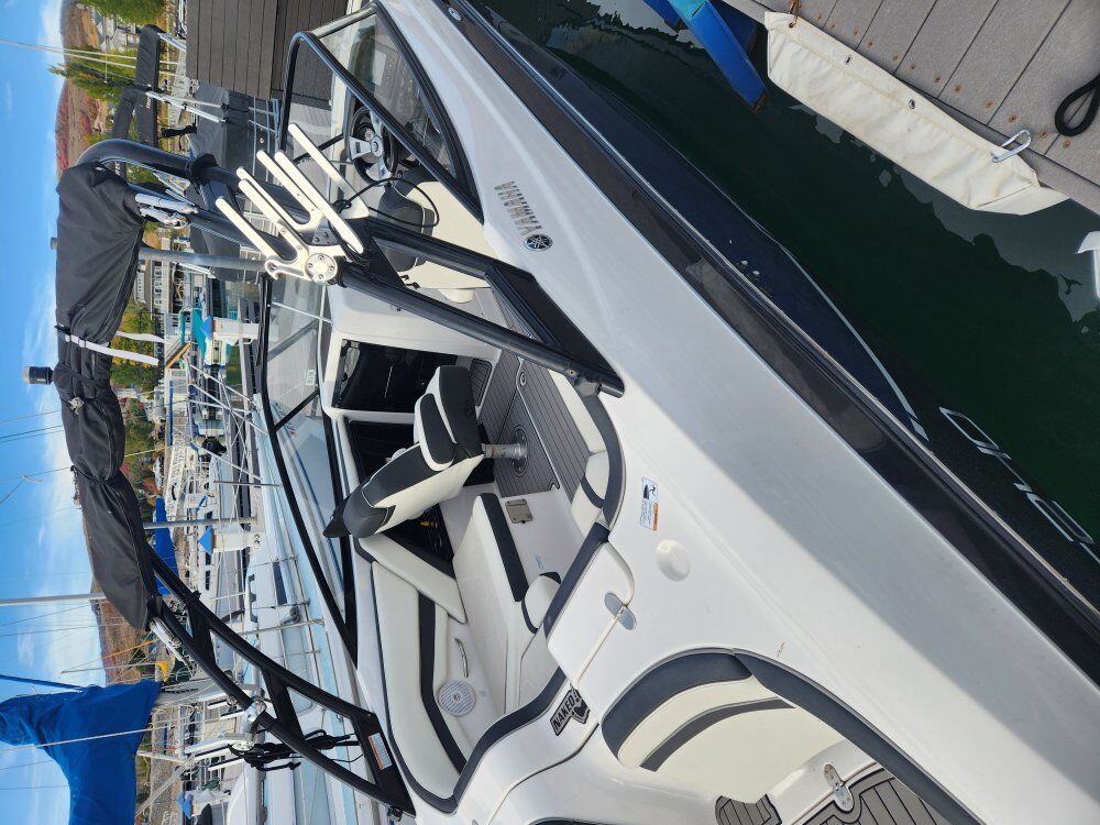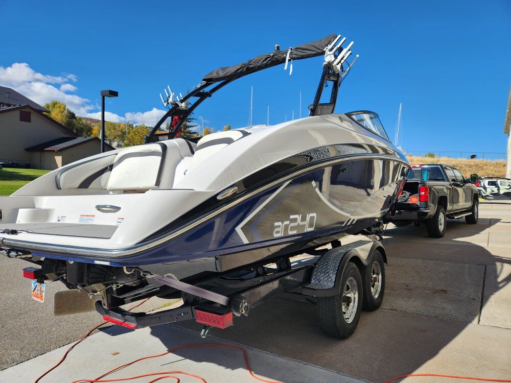 2016 Yamaha AR240. Twin high output 1800cc (180 hp each) engines for 360 HP. Less than 300 hrs each. 24 ft with stock 2 axle trailer. Seats 12, unique and great seating area on back. 2 captain chairs. Marine mat installed throughout. Wake booster and 800 lb fatsac included for surfing. Pretty much stock boat. Great for surfing, boarding, tubing, floating, jumping off, etc.. lots of storage to get everything out of the way. Located in Bear Lake Marina through October. Stored in Garden City Utah (bear lake). Owned for 5 years with no issues, easy maintenence. Title in hand. $45000/offer