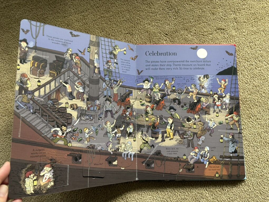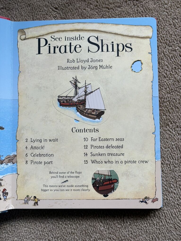 An Usborne flap book: See Inside Pirate Ships. With over 70 flaps to lift. All flaps in good working order (a couple slightly bent). Very good condition. One corner slightly bumped (see photos). Text only. Cash or Venmo. Discount on multiple items.