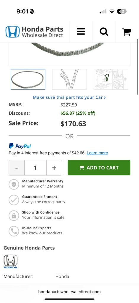 VenmoNew Genuine Honda part, timing chain, part number 14401-R40-A01. For Civic, Crosstour, and CRV. 2002-2015. Retails for $170, asking $80, two available. Cash or Venmo, call or text Scott at 603-558-5759.