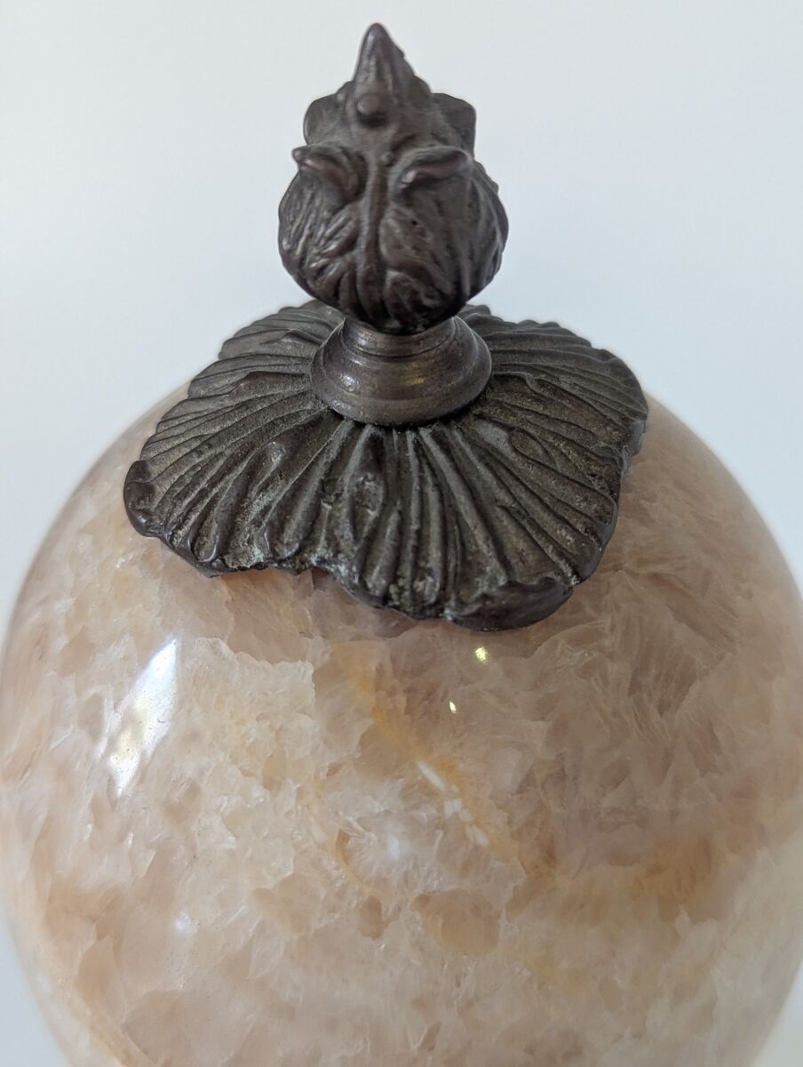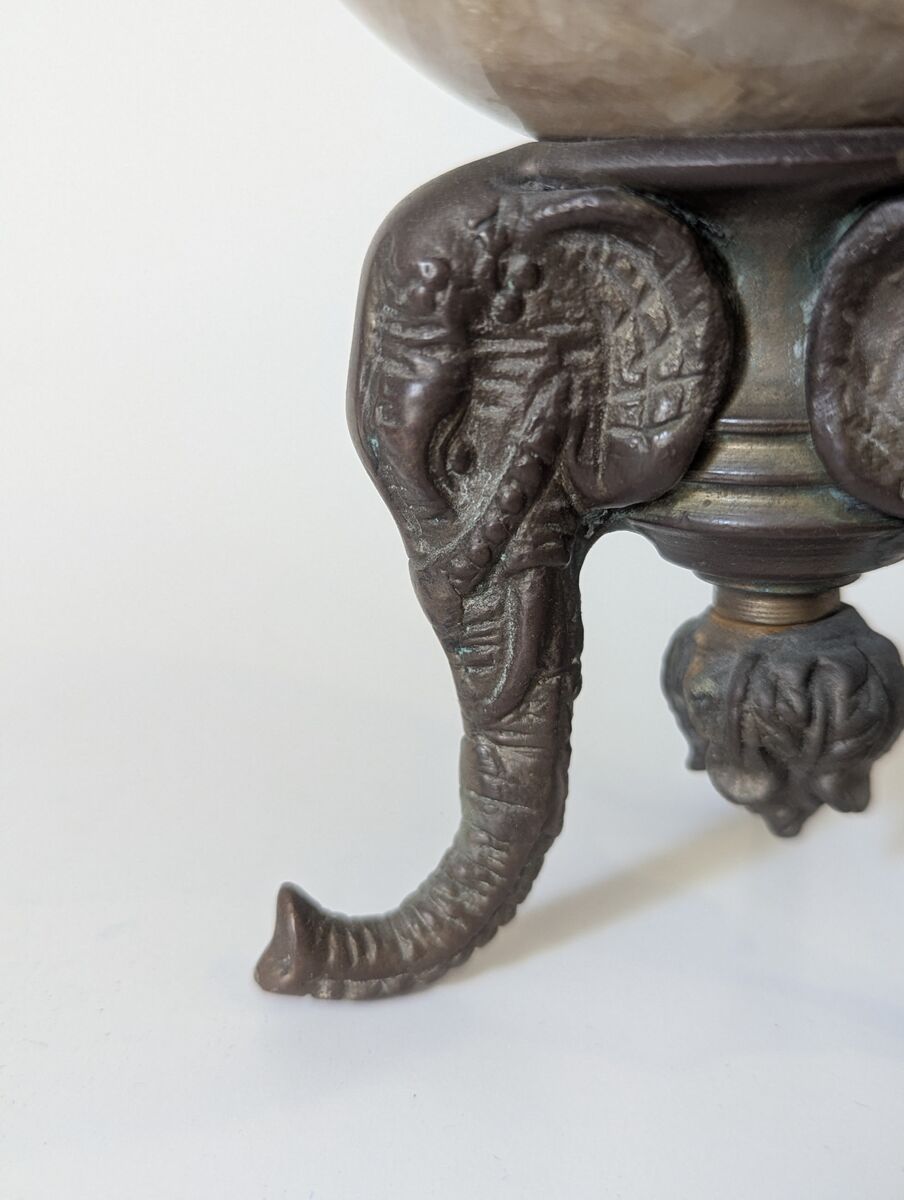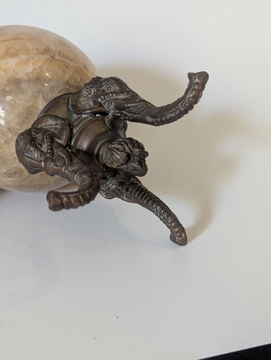 PayPalThis vintage ALABASTER EGG on Three Legged Brass Elephant Stand with Brass Finial is a large, polished marble/alabaster sculpture with a marbled pattern. Standing at over 9" tall and showcasing intricate details, this piece is perfect for all occasions and is sure to make a statement in any space. The elegant combination of alabaster and brass materials adds a touch of sophistication, making it a unique and eye-catching decorative collectible.Pre owned and heavy - weighs 5 lbs 4 oz.