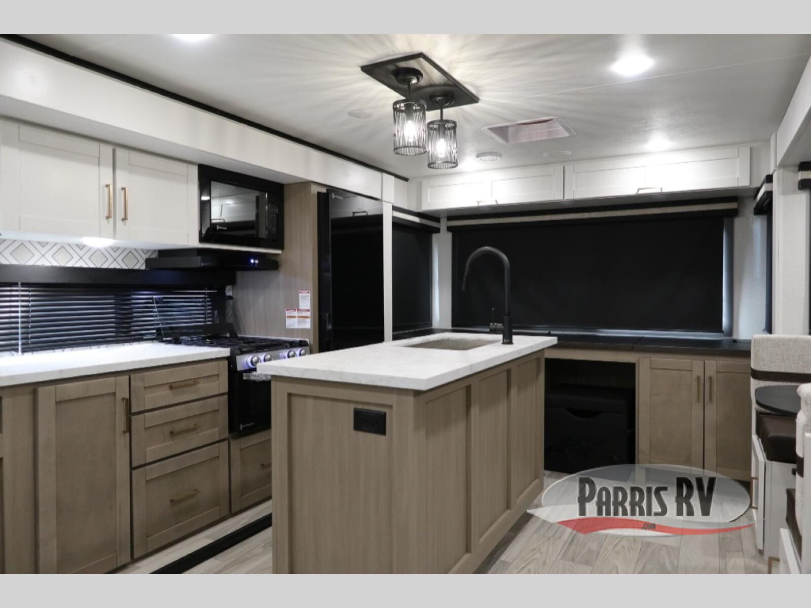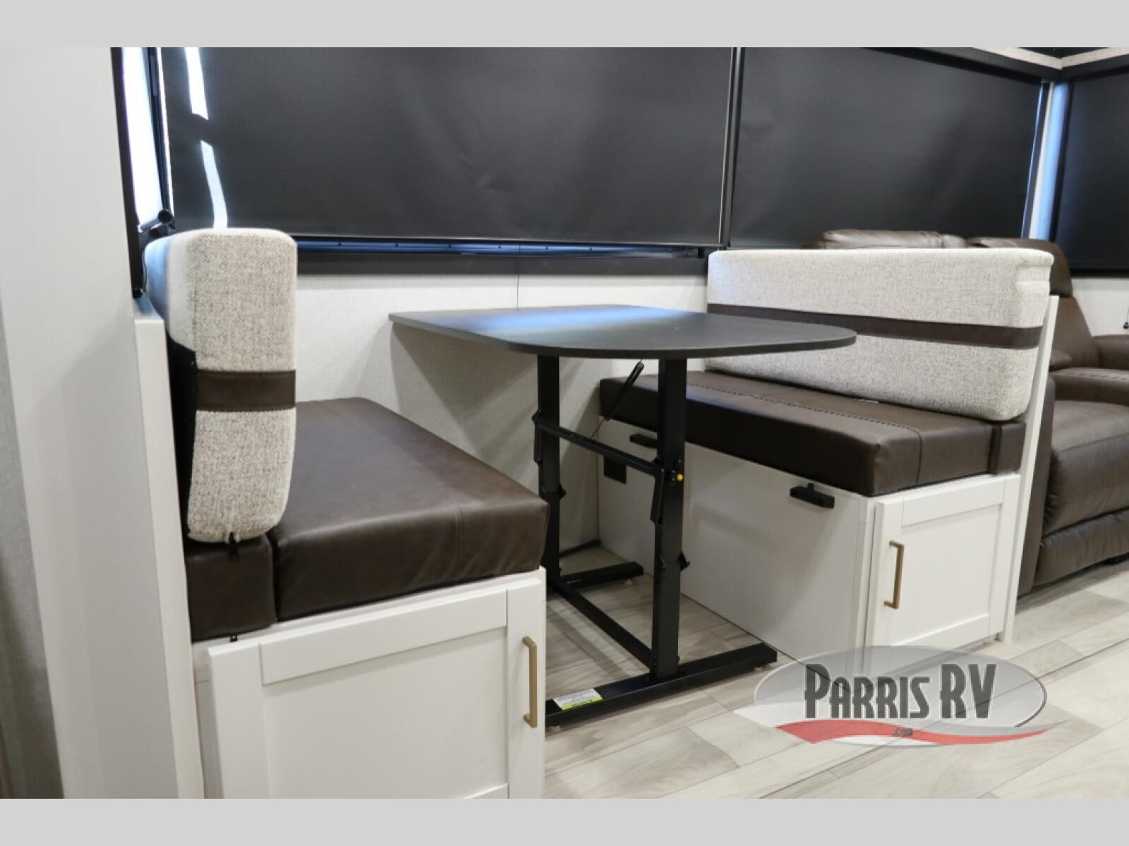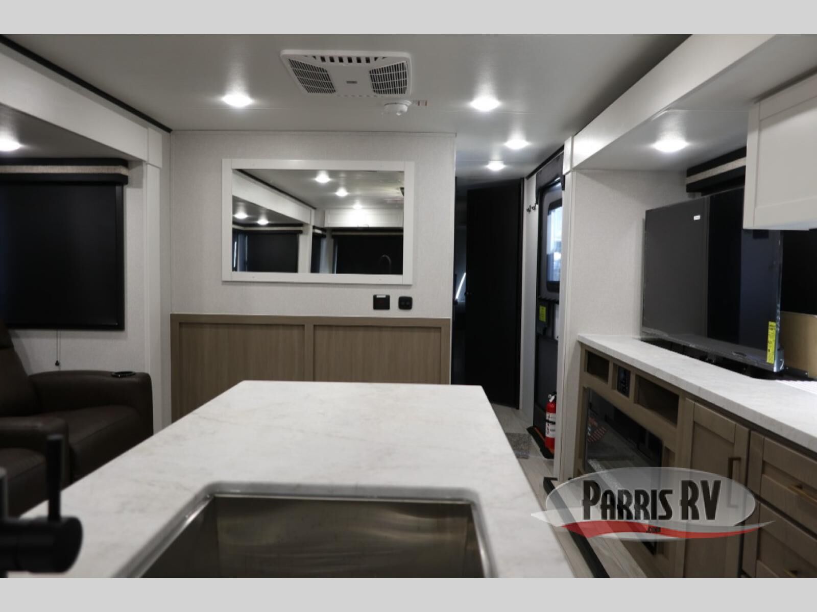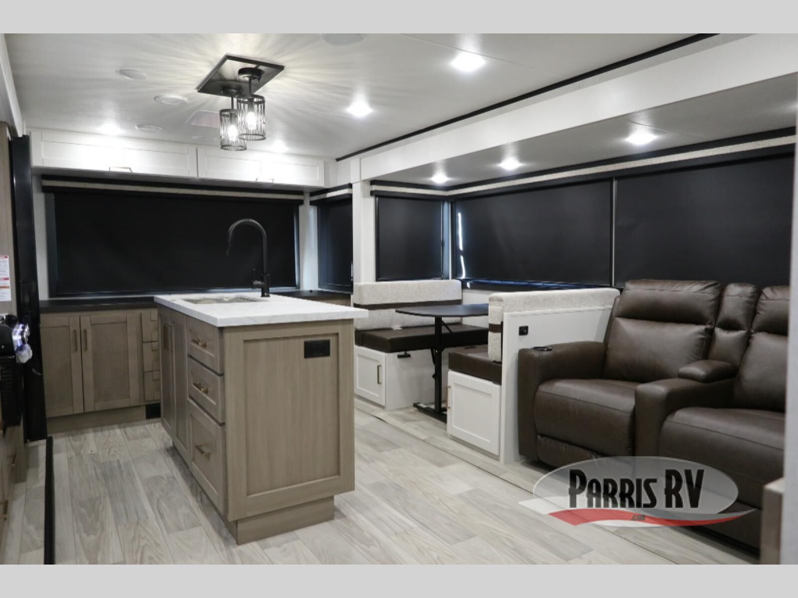 At the front, you'll find a private bedroom featuring a spacious 60" x 80" queen bed, in between nightstands on each side and overhead cabinets for convenient storage of your essentials. Moving down the hall, the full bathroom offers a 30" x 36" shower, a linen closet, and a medicine cabinet, perfect for keeping towels and skincare neatly organized. In the center of the space lies the kitchen and living area, enhanced by dual opposing slides that significantly open up the room for added comfort and functionality. One slide houses a 40" x 70" dinette ideal for meals or game nights, while a 60" tri-fold sofa provides a cozy lounging area, with both converting into additional sleeping space when needed. Centrally located, the kitchen island includes a sleek stainless-steel sink, while the opposing slide features a fully equipped kitchen with a three-burner cooktop, microwave, seamless countertops, and overhead cabinets for ample storage. For entertainment, a pop-up TV in the entertainment center ensures you can enjoy movie nights from the comfort of the sofa. At the rear, a dedicated desk with an ottoman creates a perfect nook for studying or working from home.