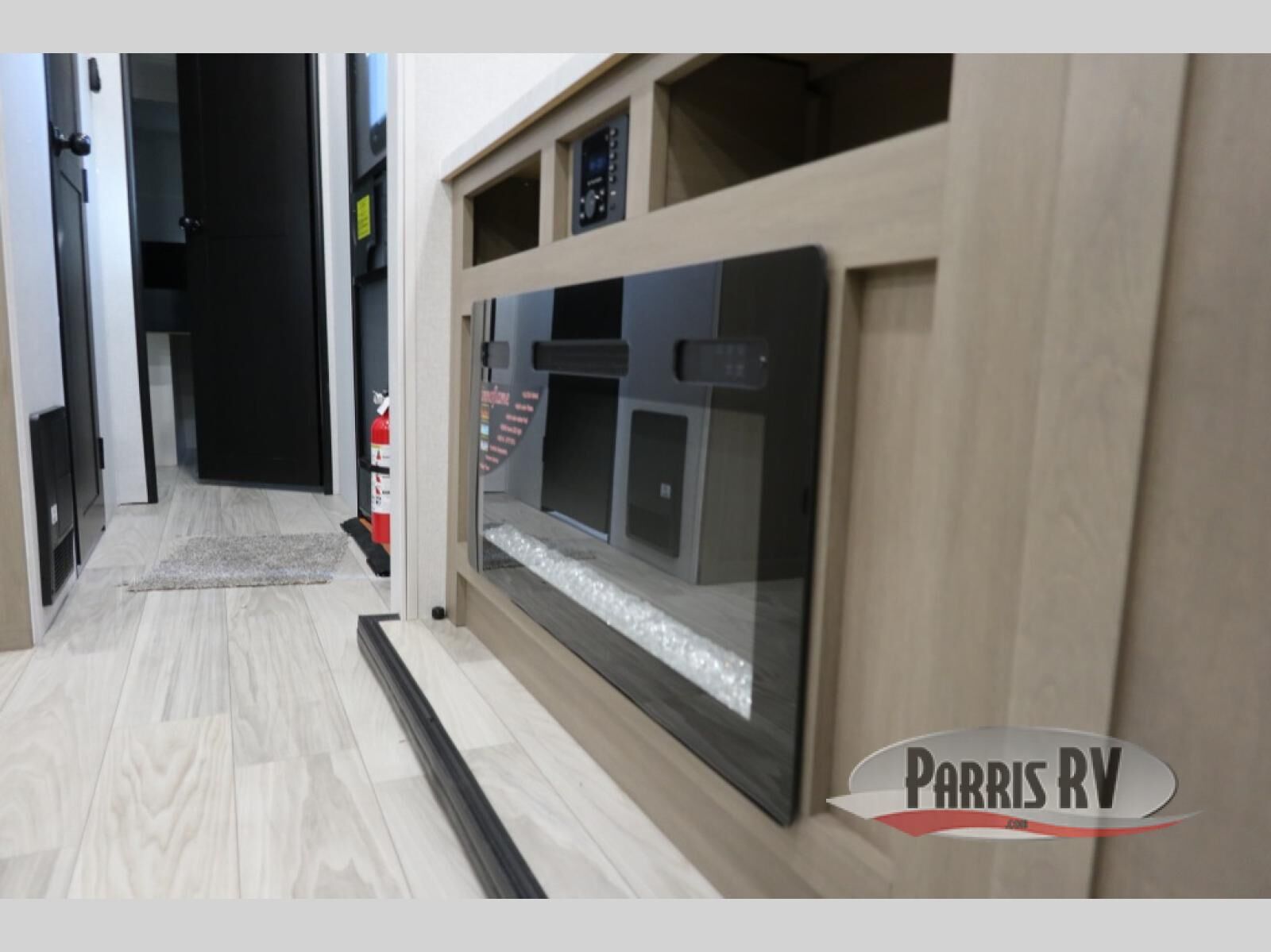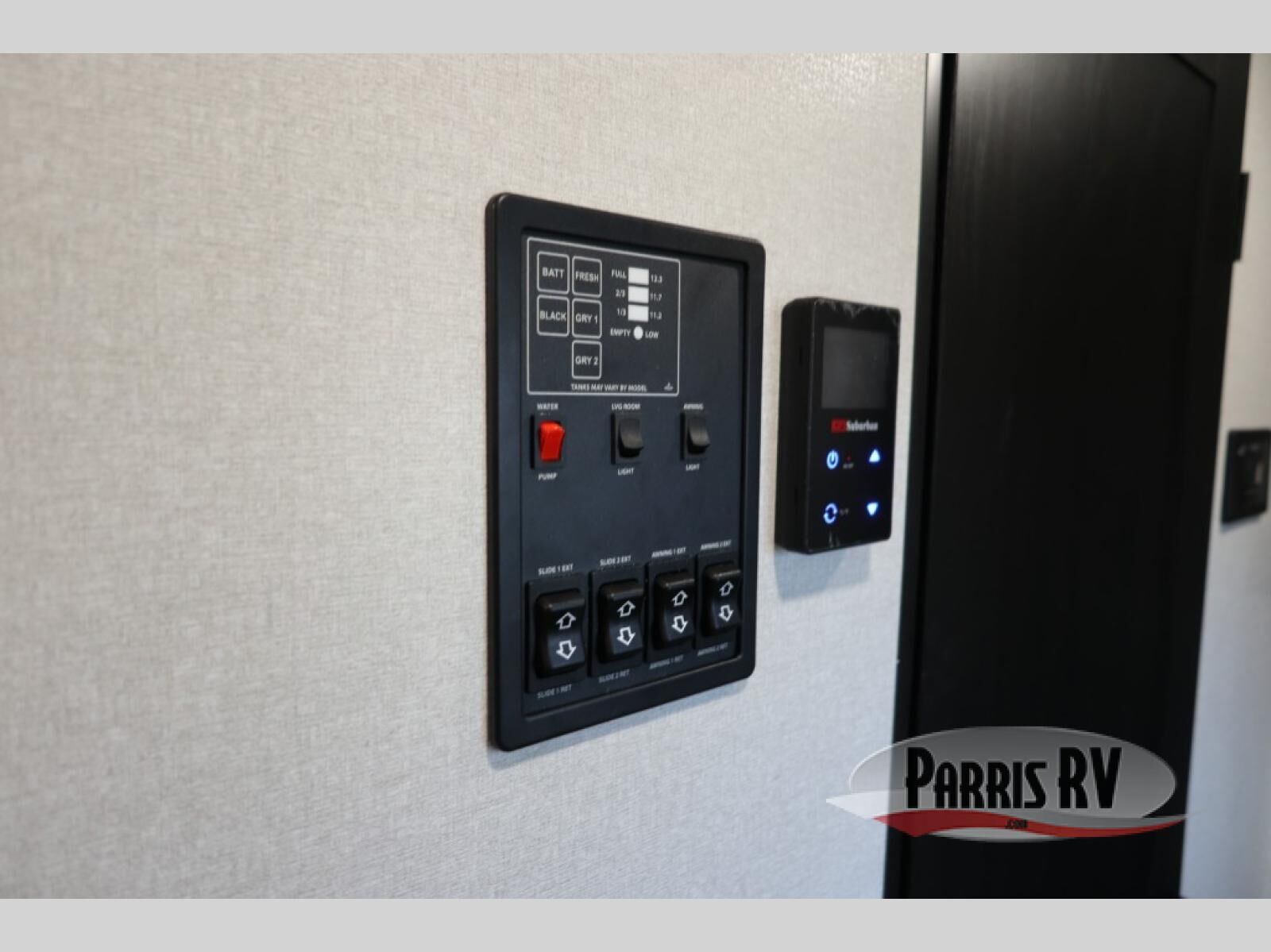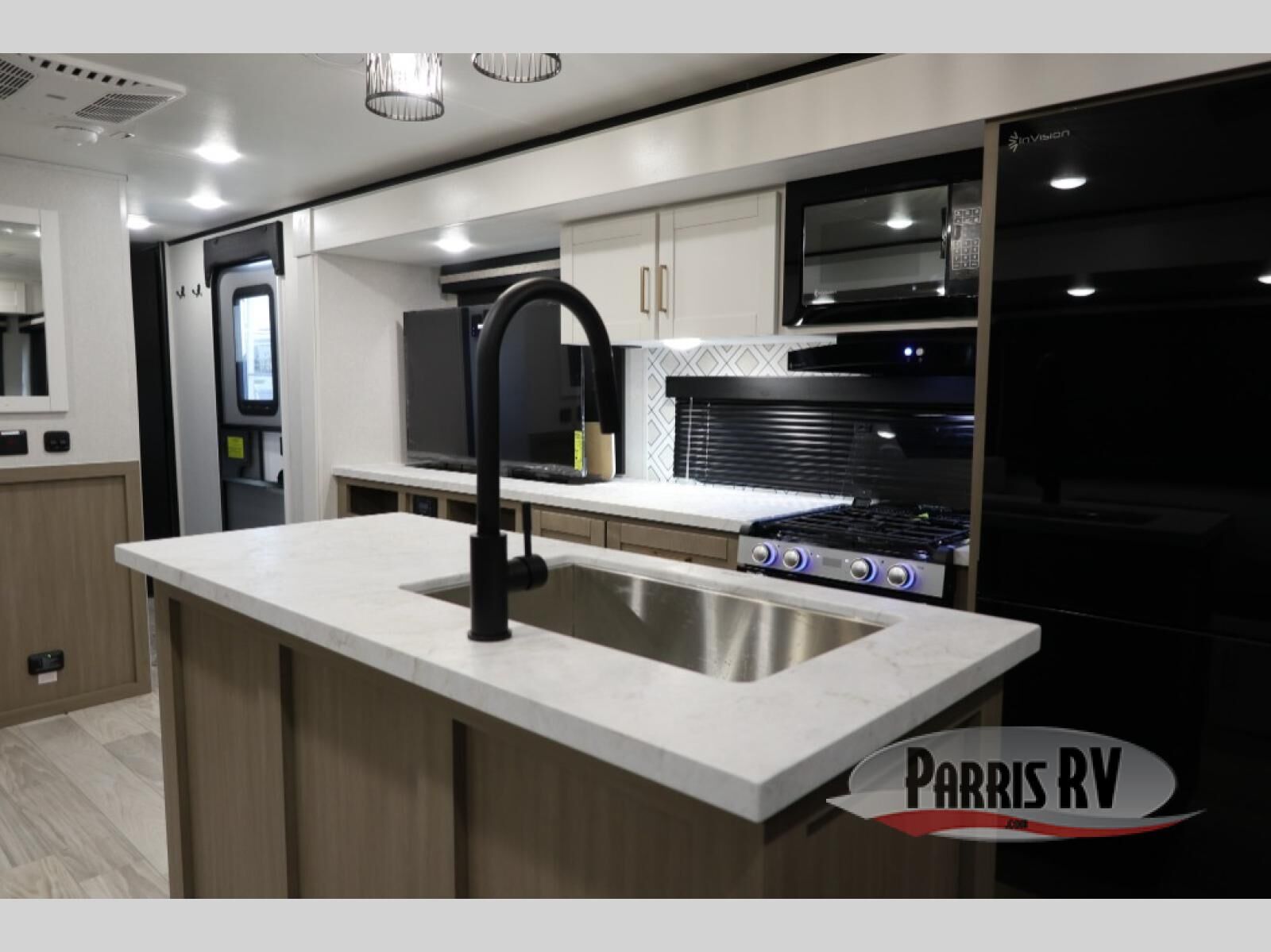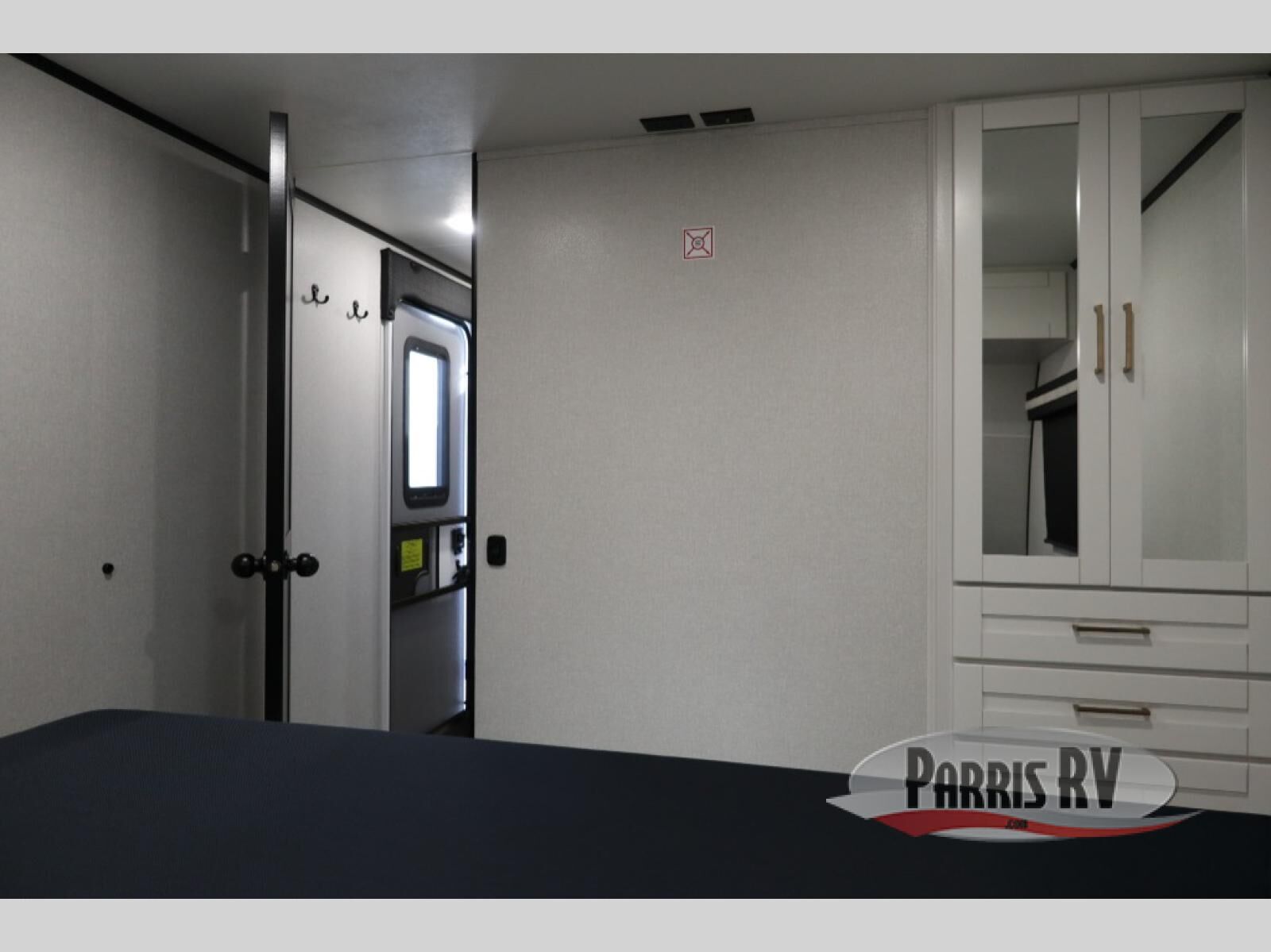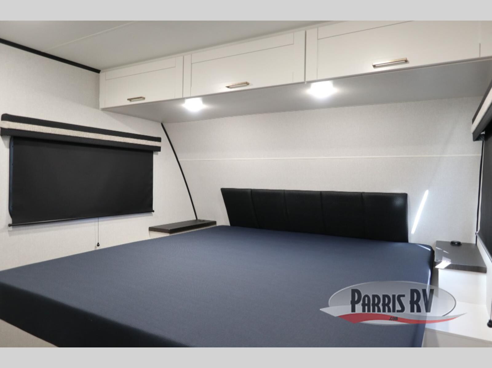 At the front, you'll find a private bedroom featuring a spacious 60" x 80" queen bed, in between nightstands on each side and overhead cabinets for convenient storage of your essentials. Moving down the hall, the full bathroom offers a 30" x 36" shower, a linen closet, and a medicine cabinet, perfect for keeping towels and skincare neatly organized. In the center of the space lies the kitchen and living area, enhanced by dual opposing slides that significantly open up the room for added comfort and functionality. One slide houses a 40" x 70" dinette ideal for meals or game nights, while a 60" tri-fold sofa provides a cozy lounging area, with both converting into additional sleeping space when needed. Centrally located, the kitchen island includes a sleek stainless-steel sink, while the opposing slide features a fully equipped kitchen with a three-burner cooktop, microwave, seamless countertops, and overhead cabinets for ample storage. For entertainment, a pop-up TV in the entertainment center ensures you can enjoy movie nights from the comfort of the sofa. At the rear, a dedicated desk with an ottoman creates a perfect nook for studying or working from home.