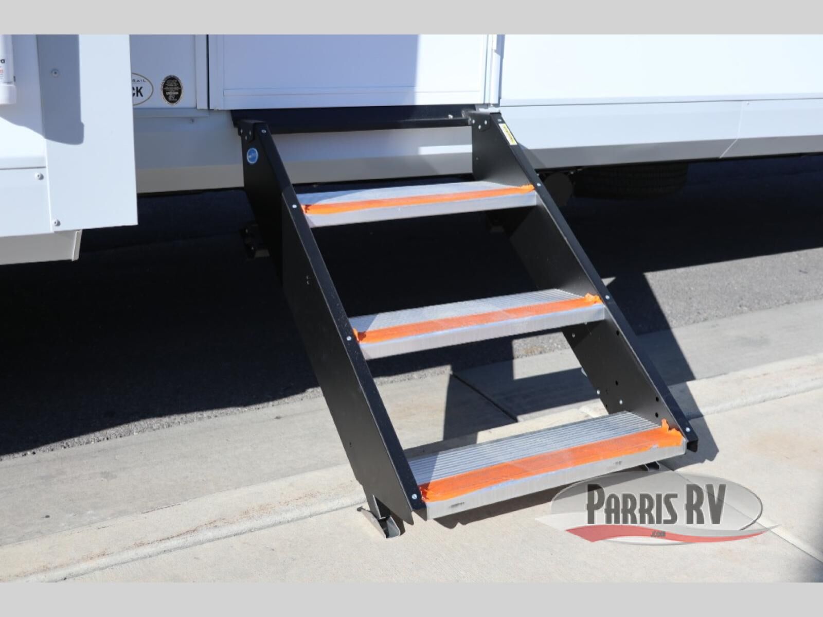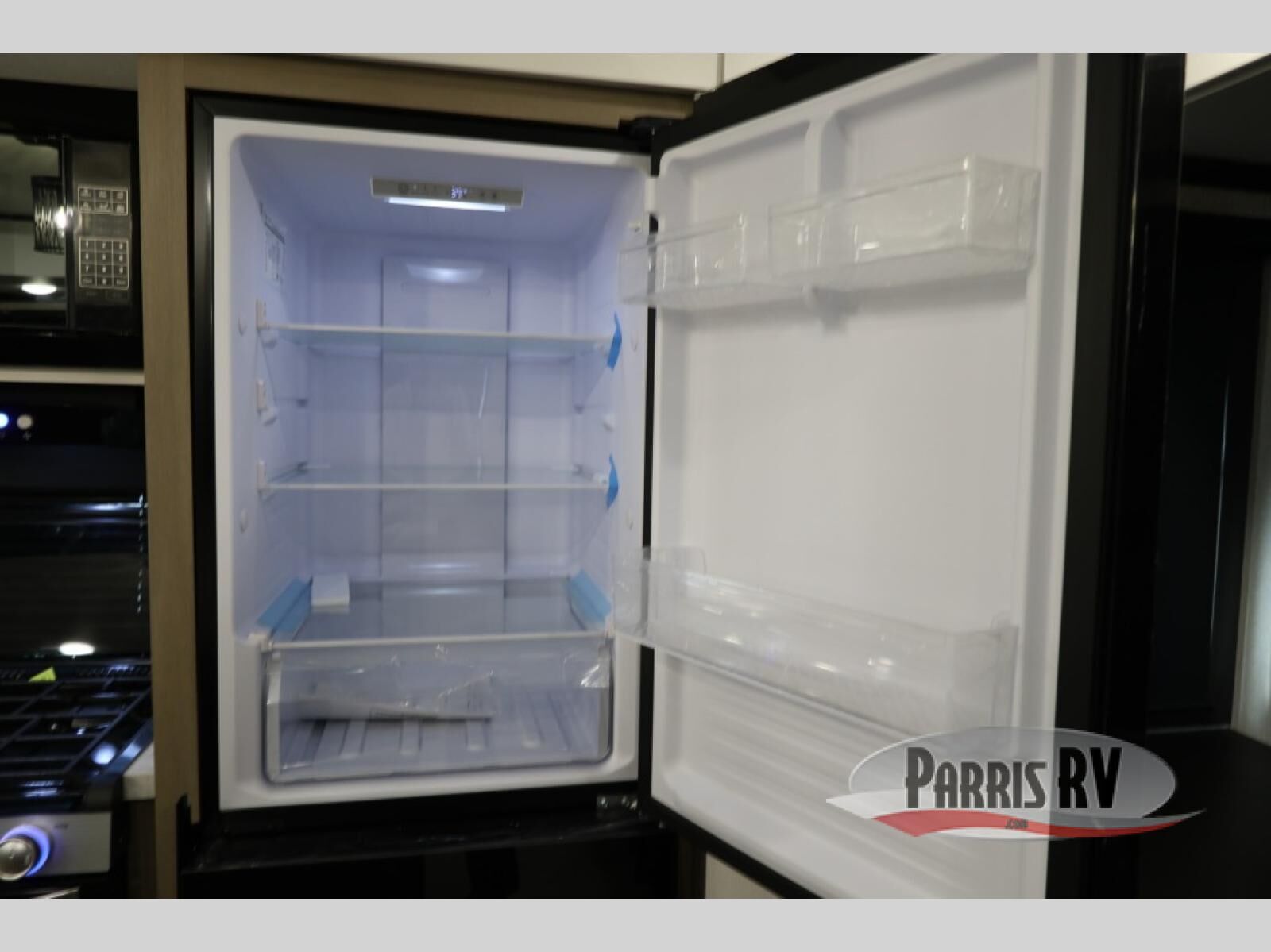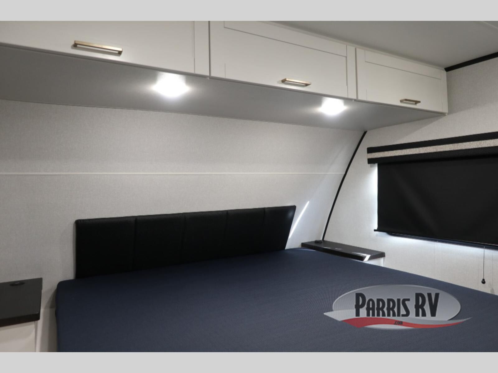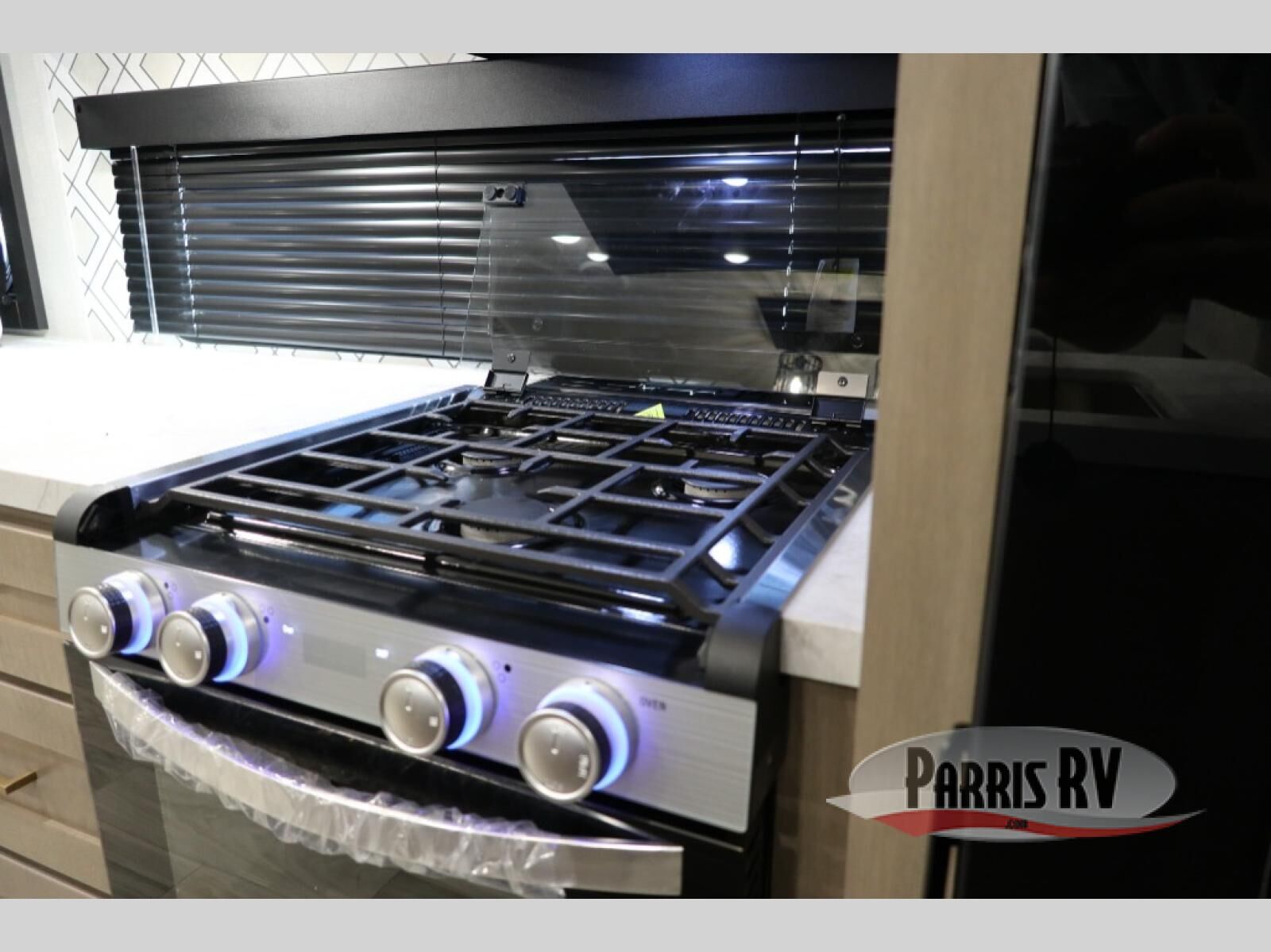 At the front, you'll find a private bedroom featuring a spacious 60" x 80" queen bed, in between nightstands on each side and overhead cabinets for convenient storage of your essentials. Moving down the hall, the full bathroom offers a 30" x 36" shower, a linen closet, and a medicine cabinet, perfect for keeping towels and skincare neatly organized. In the center of the space lies the kitchen and living area, enhanced by dual opposing slides that significantly open up the room for added comfort and functionality. One slide houses a 40" x 70" dinette ideal for meals or game nights, while a 60" tri-fold sofa provides a cozy lounging area, with both converting into additional sleeping space when needed. Centrally located, the kitchen island includes a sleek stainless-steel sink, while the opposing slide features a fully equipped kitchen with a three-burner cooktop, microwave, seamless countertops, and overhead cabinets for ample storage. For entertainment, a pop-up TV in the entertainment center ensures you can enjoy movie nights from the comfort of the sofa. At the rear, a dedicated desk with an ottoman creates a perfect nook for studying or working from home.