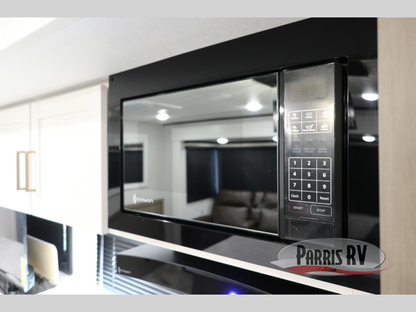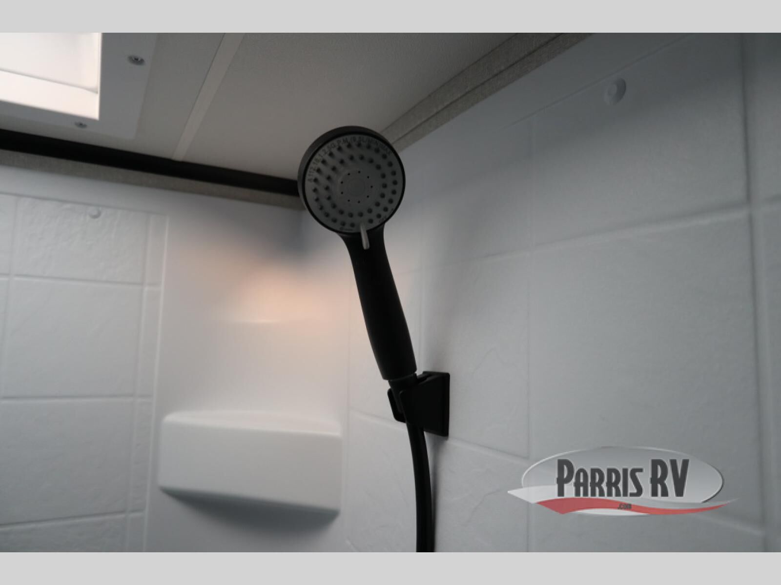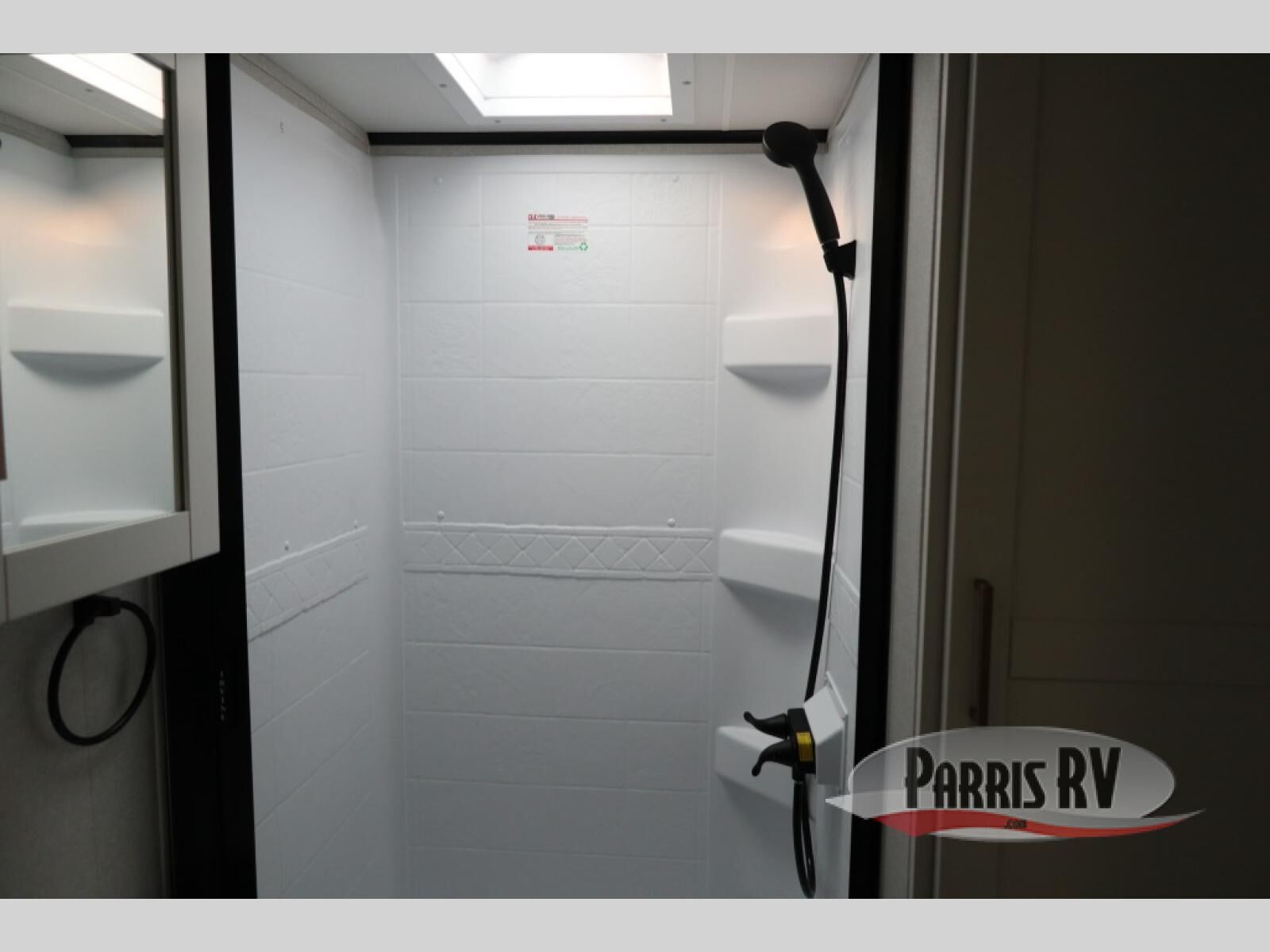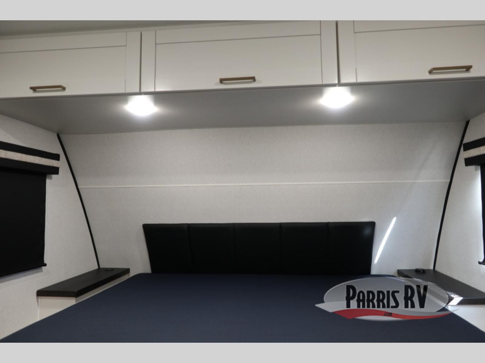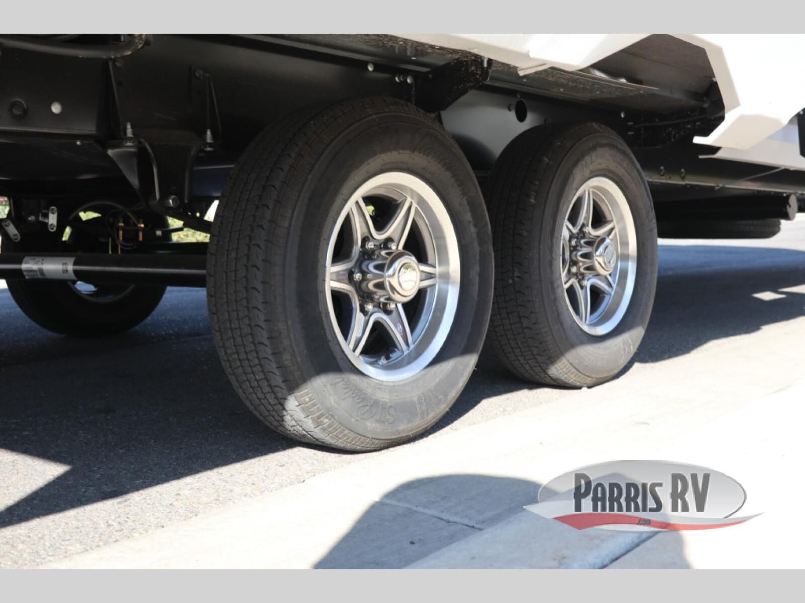 At the front, you'll find a private bedroom featuring a spacious 60" x 80" queen bed, in between nightstands on each side and overhead cabinets for convenient storage of your essentials. Moving down the hall, the full bathroom offers a 30" x 36" shower, a linen closet, and a medicine cabinet, perfect for keeping towels and skincare neatly organized. In the center of the space lies the kitchen and living area, enhanced by dual opposing slides that significantly open up the room for added comfort and functionality. One slide houses a 40" x 70" dinette ideal for meals or game nights, while a 60" tri-fold sofa provides a cozy lounging area, with both converting into additional sleeping space when needed. Centrally located, the kitchen island includes a sleek stainless-steel sink, while the opposing slide features a fully equipped kitchen with a three-burner cooktop, microwave, seamless countertops, and overhead cabinets for ample storage. For entertainment, a pop-up TV in the entertainment center ensures you can enjoy movie nights from the comfort of the sofa. At the rear, a dedicated desk with an ottoman creates a perfect nook for studying or working from home.