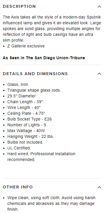 VenmoNEW in box - Axis Chandelier purchased from ZGallerie. I'm a designer and chandelier was no longer needed by client. Is brand new, still in box! This chandelier is still listed on ZGallerie's site for $478.