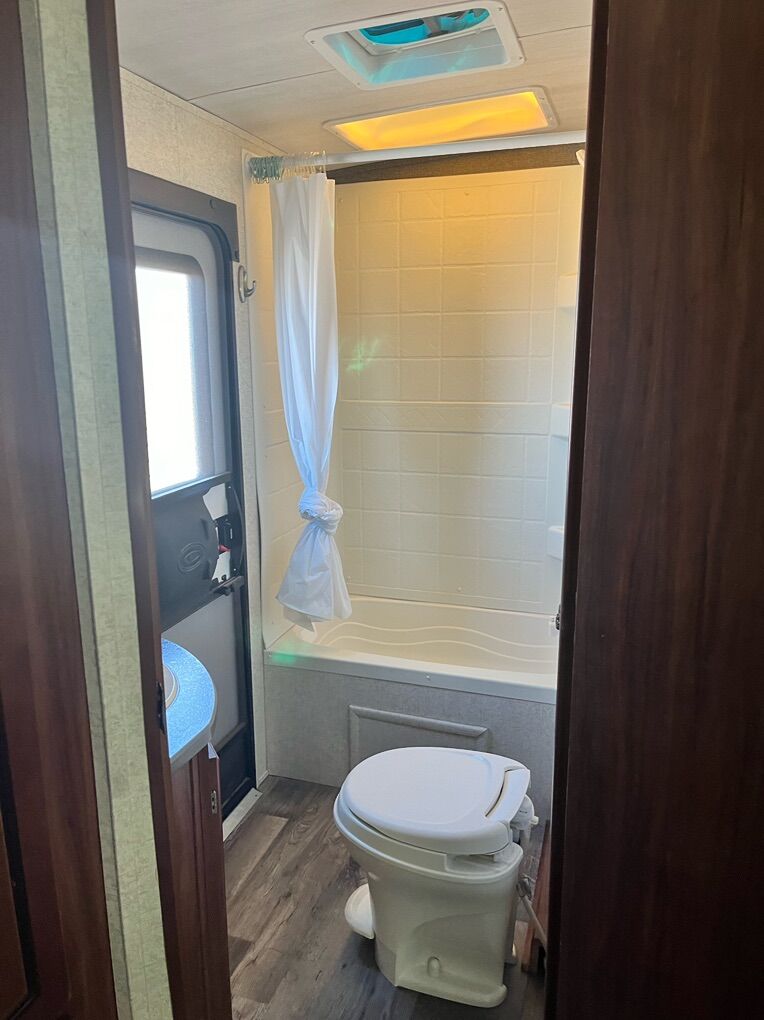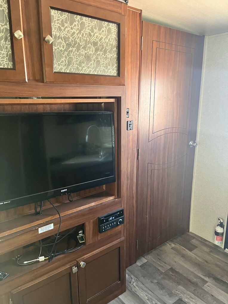 This trailer has been awesome. Some great features are it has two gray tanks, central vac, dvd/radio/bluetooth, electric awning, electric stabilizer jacks, and 2 entrances. The tires are only a year old. Everything works great.
