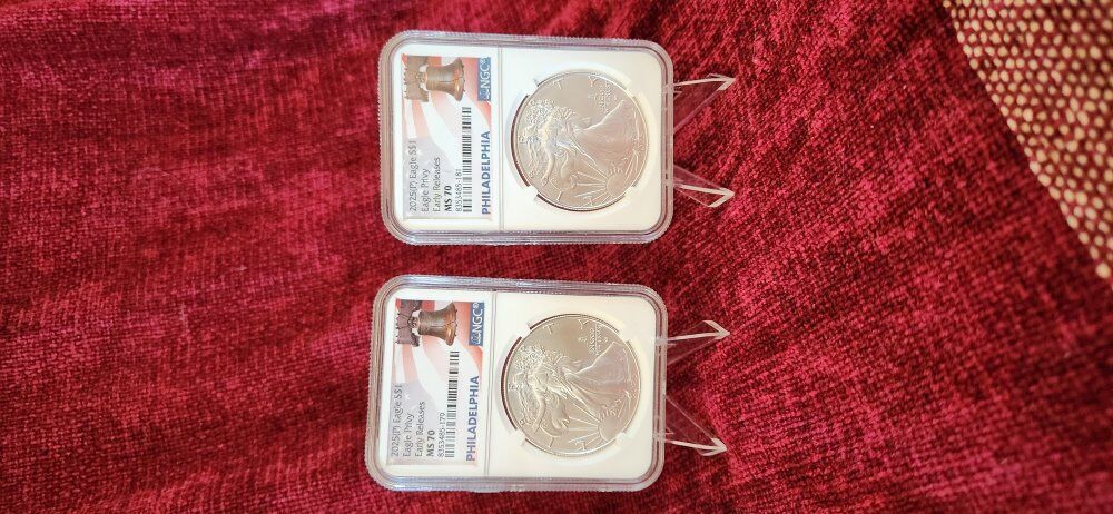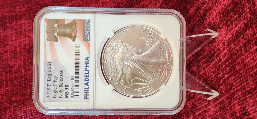 Venmo2025 (P) US Silver Eagle Dollar $1 Mint State Graded MS70! Eagle Privy first year! Early Release! 2025 is the first year with the Eagle Privy above "IN GOD WE TRUST"! The 2025 Eagle Privy has made this Silver Eagle one of the most collectible mintage of the Silver Eagle series! A great piece of US nusmismatic history. Beautifully preserved and graded uncirculated Mint State MS70 by NGC. Comes with the case stand. I have two of these identical. If you want to buy both, let's make a deal! $275. KSL Messenger or txt. 8016414771 KSL Messenger is best