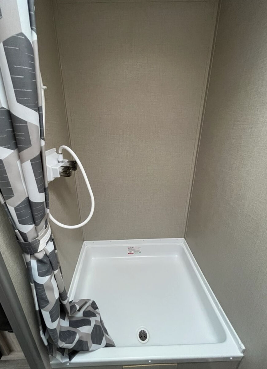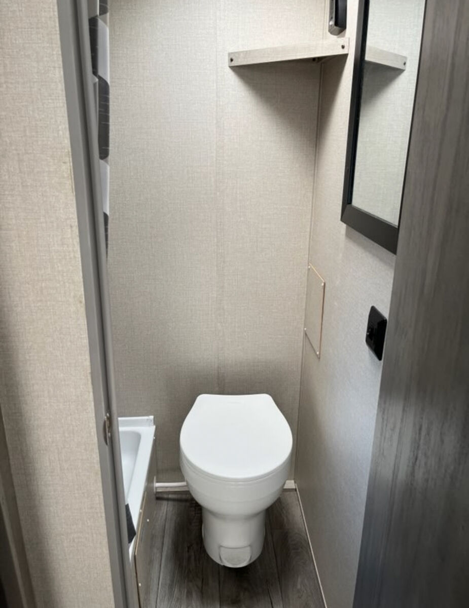 Bathroom ConvenienceFull bathroom with shower, toilet, and vanity sink Skylight in shower for added headroom and natural light