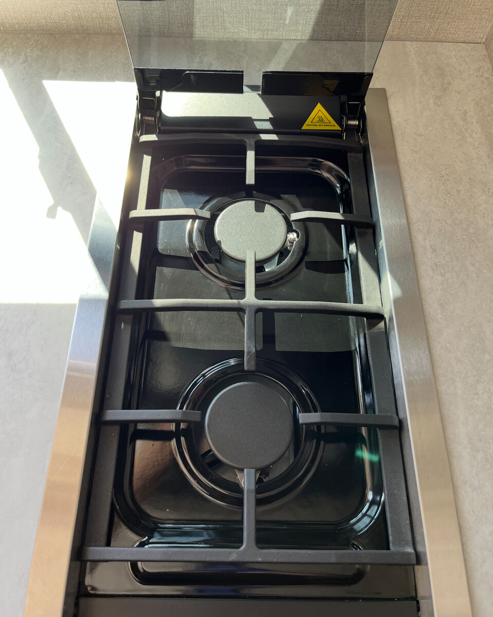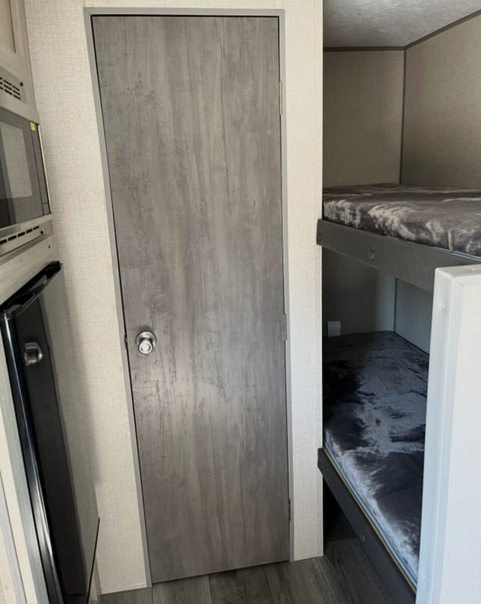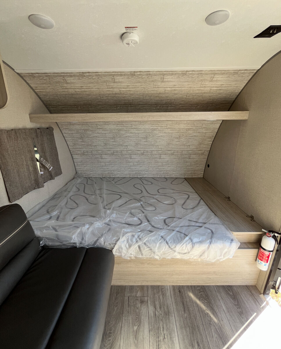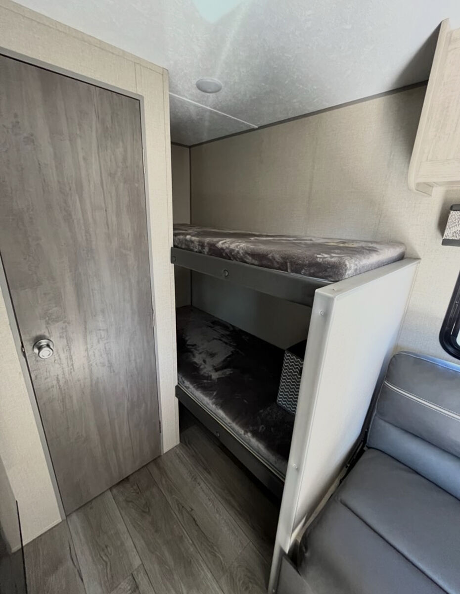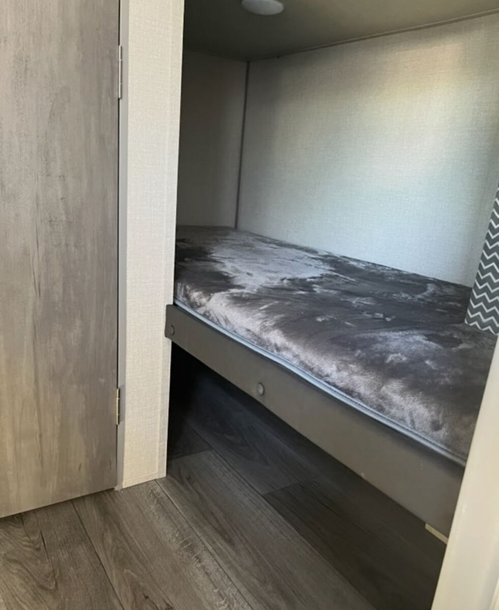 Interior ComfortsSpacious floorplans with modern décor and finishes Private front bedroom with queen bed and storage Convertible dinette and sofa PLUS bunks for extra sleeping space Entertainment center with Bluetooth® stereo and TV hookup Efficient heating and cooling for all-season camping