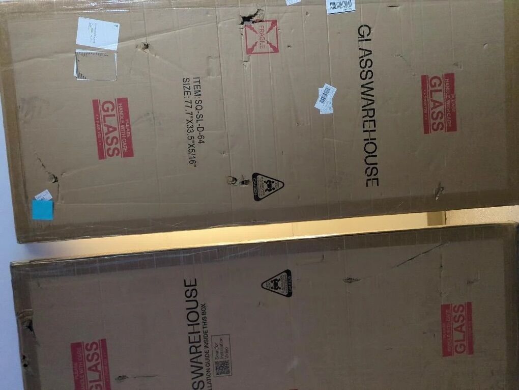 Glass doors only, no hinges or hardware!! This listing features a set of two glass shower doors from Glass Warehouse. Each door measures 77 inches in height, 35 inches in width, and 5/16 inches in thickness. The doors are packaged securely in boxes labeled with handling instructions, indicating that they are fragile and should be handled with care. An installation guide is included inside each box for easy setup. Ideal for enhancing your bathroom's aesthetic, these glass shower doors offer a modern touch and are designed for durability and style.