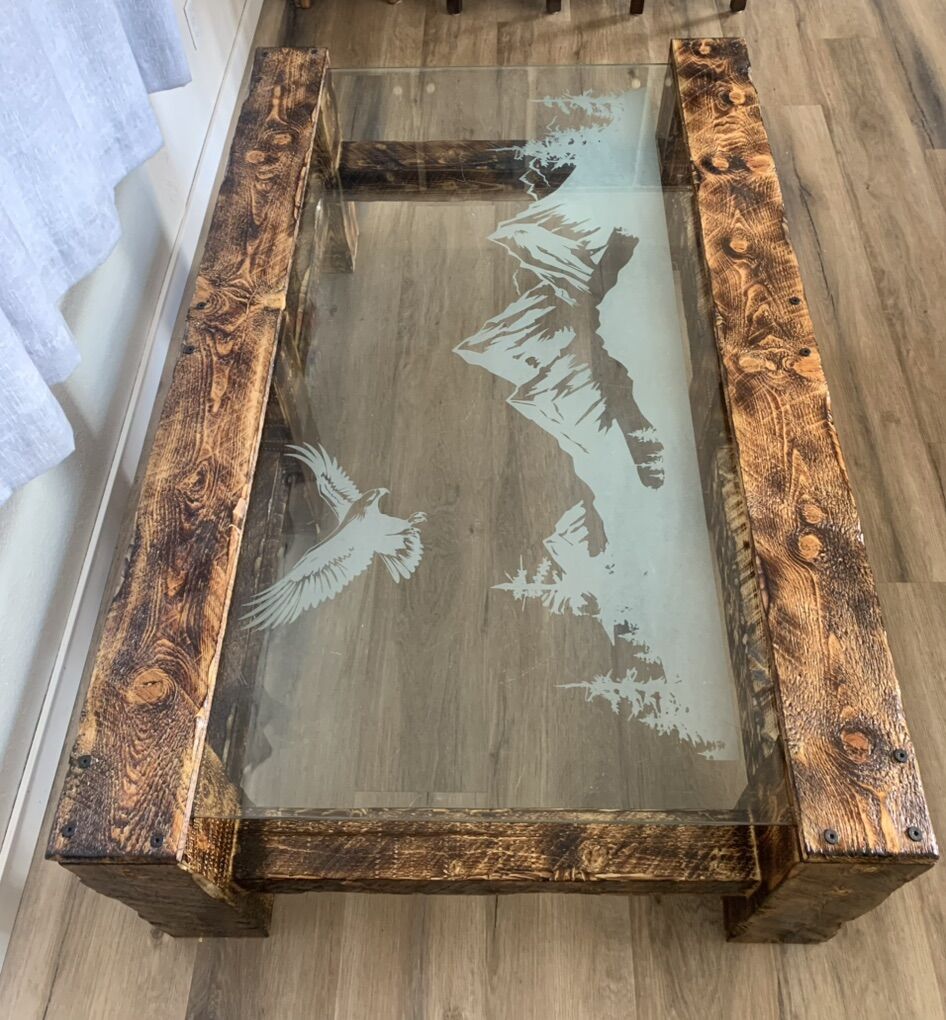VenmoBrand new coffee table. Glass is laser engraved and secured in beautiful wooden frame. Table is 3x5 feet. Can deliver for a fee.