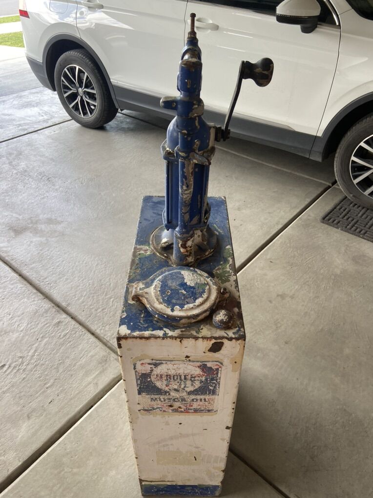 VenmoVintage oil pump lubester from the fifties. Pump works great and the tank is solid. No leaks or cracks. Great for a man cave or someone wanting to restore it.