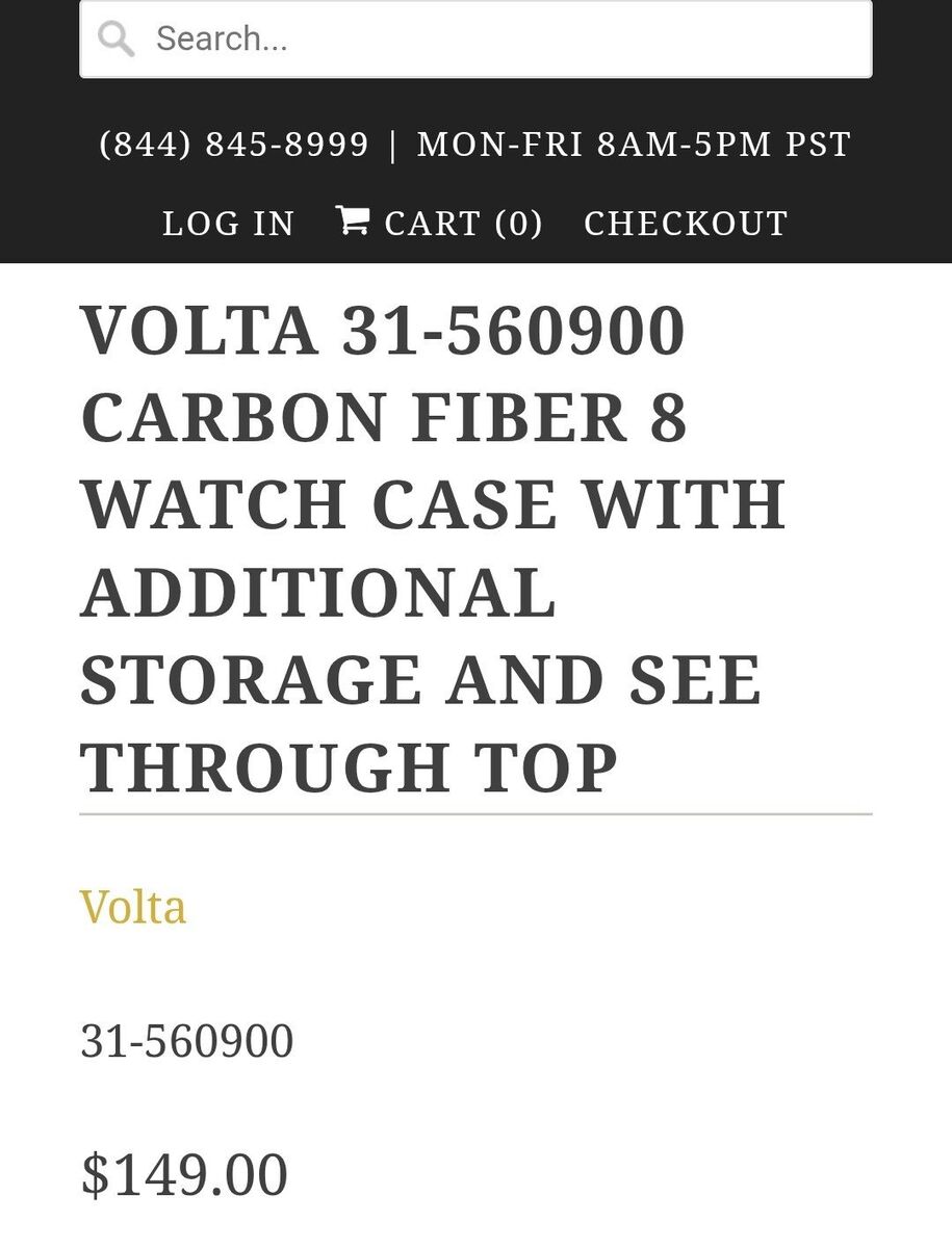 Volta 31-560900 Carbon Fiber. Does have a small knick on the lid, see photo. Price reflects that. Product description: This Volta eight watch case 31-560900 features a matte carbon fiber finish and a rich black leather interior. With this watch case, you will be able to store 8 of your finest timepieces. The watch case also feautres a see through glass window with beautifully showcases the watches inside. Underneath the watch storage area, you will find an empty drawer which allows you to also store your jewelry or other watches. The watch portion of the watch case can also be locked using the supplied key which will ensure that your expensive timepieces are safe and secure.