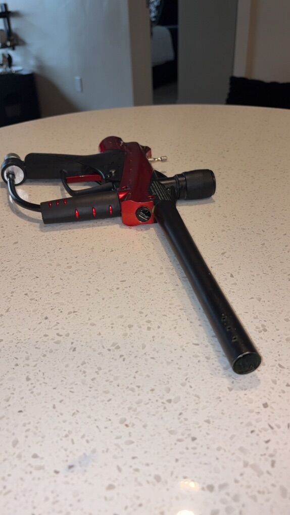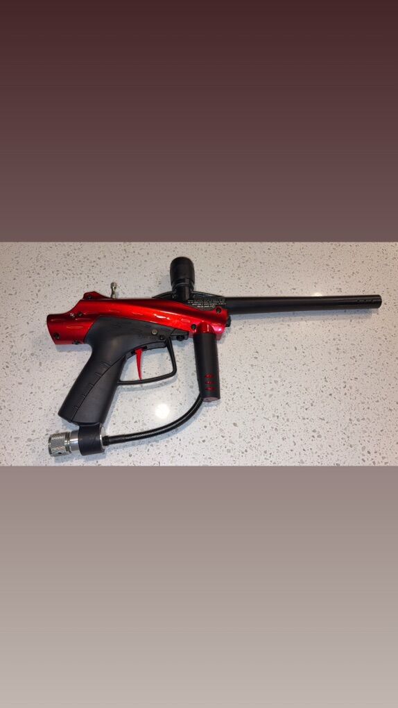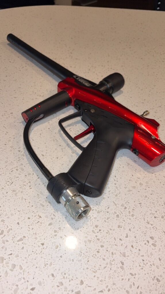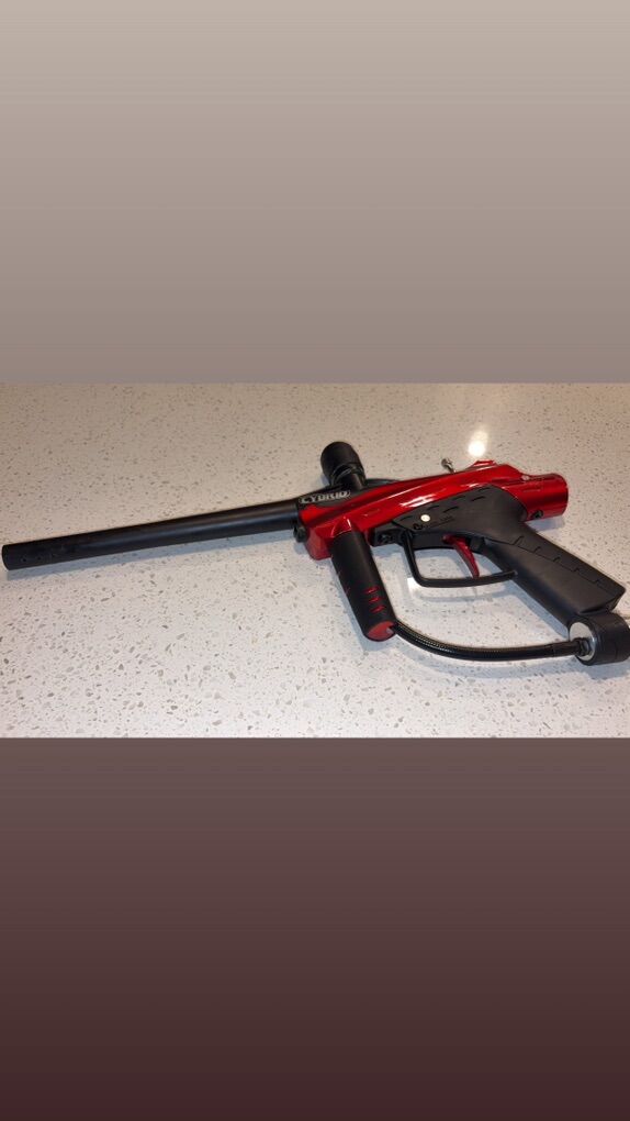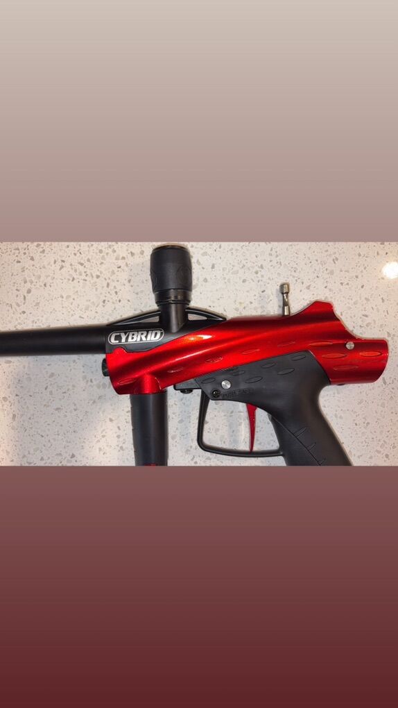 •Red anodized aluminum body with “CYBRID” badge on the receiver •Threaded barrel, vented at the tip •Bottom-line macroline hose to an ASA (air fitting) — standard HPA/CO₂ hookup •Rubberized ergonomic grip frame and single-finger trigger (red) •Just have/selling the marker (what’s in the pics), no extra stuff, just the paintball gun itself
