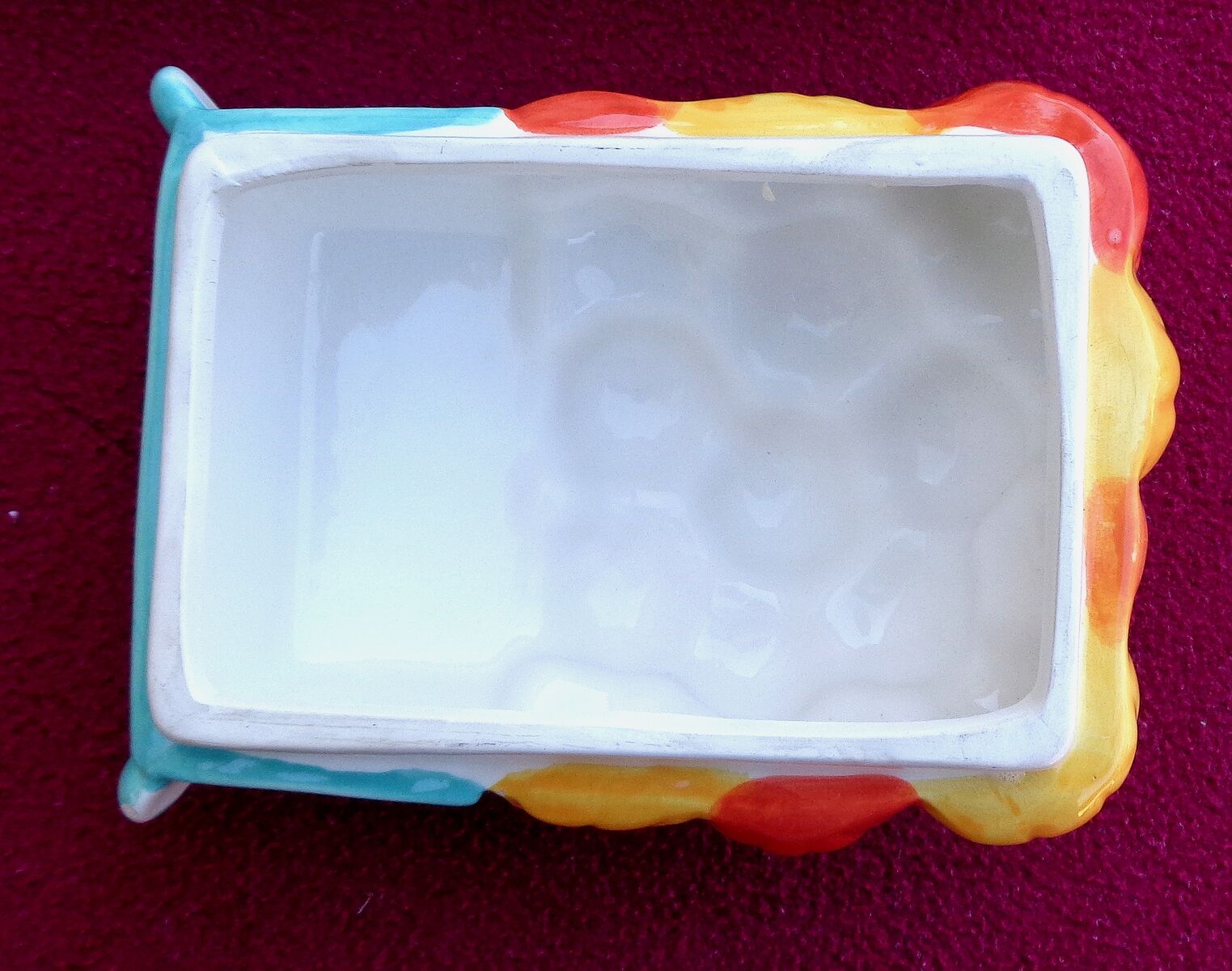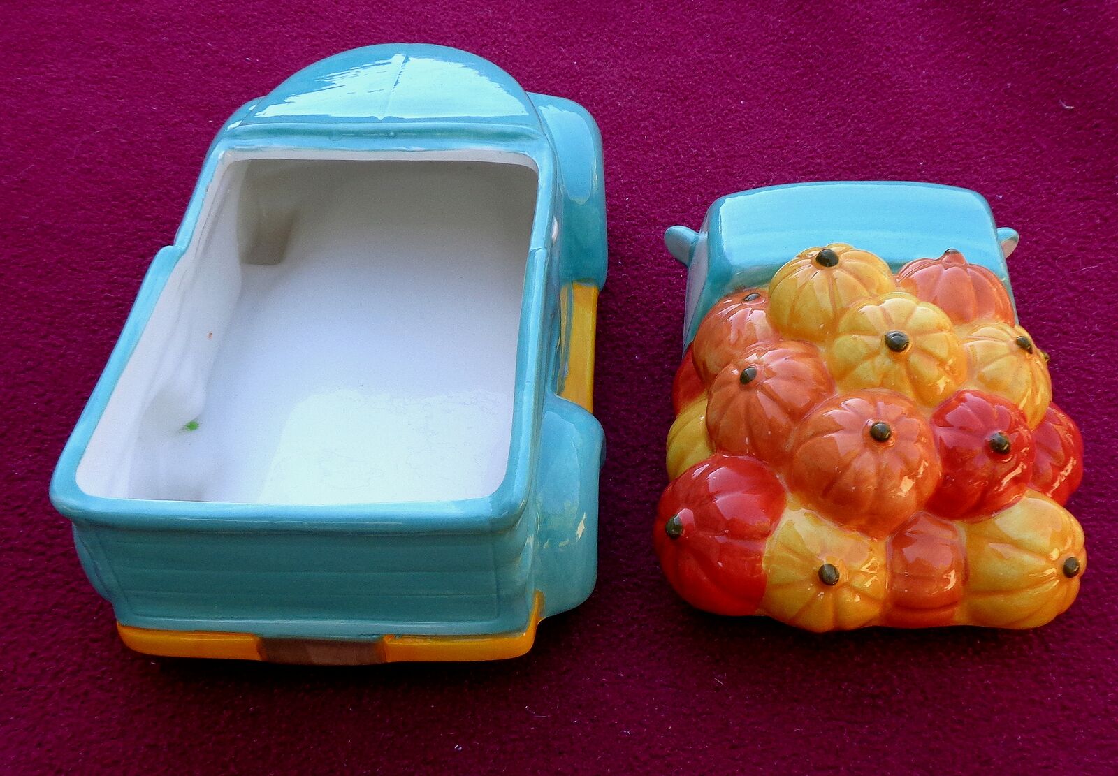 This product is a very nice fall-themed truck hauling pumpkins cookie jar, made by earthenware. It is a unique and decorative accessory truck, perfect for adding a festive touch to your home during the fall season. This item has never been used and is a great addition to your home for a fun and functional pumpkin-themed accessory.