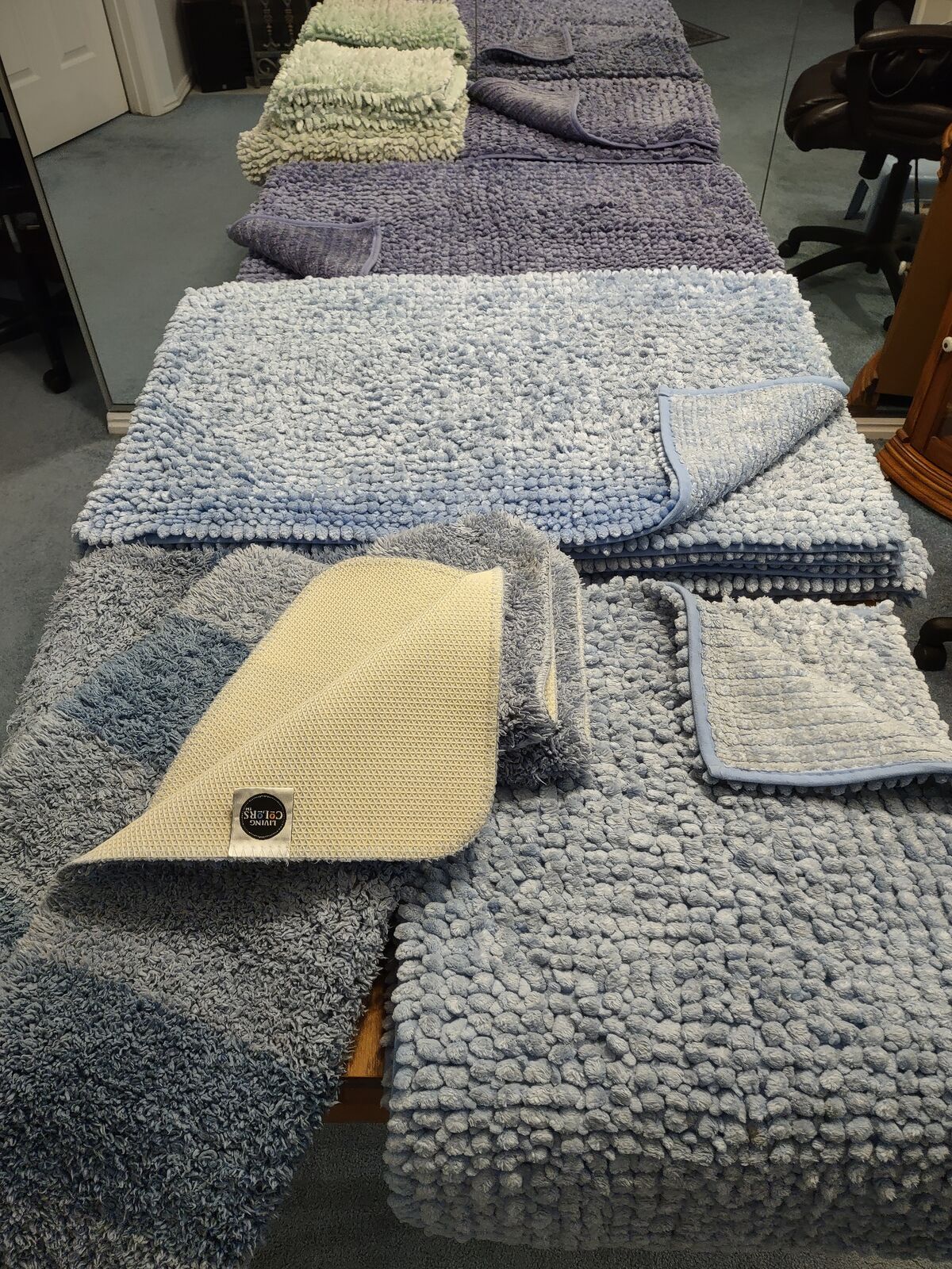 Venmo19 TOTAL RUGS. 9 SMALL RUGS = 17" x 24", $2 each. 10 LARGE RUGS = 20" x 32", $2.50 each. Light Blue Color of 6 small and 7 large sizes. Medium Blue Color of 2 Small and 2 Large sizes. Mint Green Color of 1 small and 1 large. All are Machine Washable/Dry. Only the striped rugs are rubber-backed(SOLD). Rest are same fabric as top fabric. All in Excellent Condition. No Rips, Stains or Tears. BUY ALL 19 Rugs for $30 and SAVE. Cash/Venmo. In Sandy. 801-201-5350. See both photos for more details.