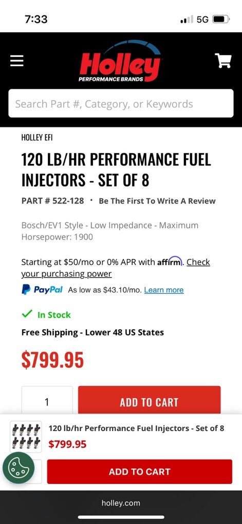 PayPalHolley 120 LB/HR Fuel Injectors. Bosch/EV1 style, Low Impedance fuel injectors. Used for five seasons with pump 91 and race gas. Worked perfectly when removed in the spring, just upgraded the 160 LB/HR Injectors. Cleaned and flowed before the last season of use. 375 obo wont work with Terminator X