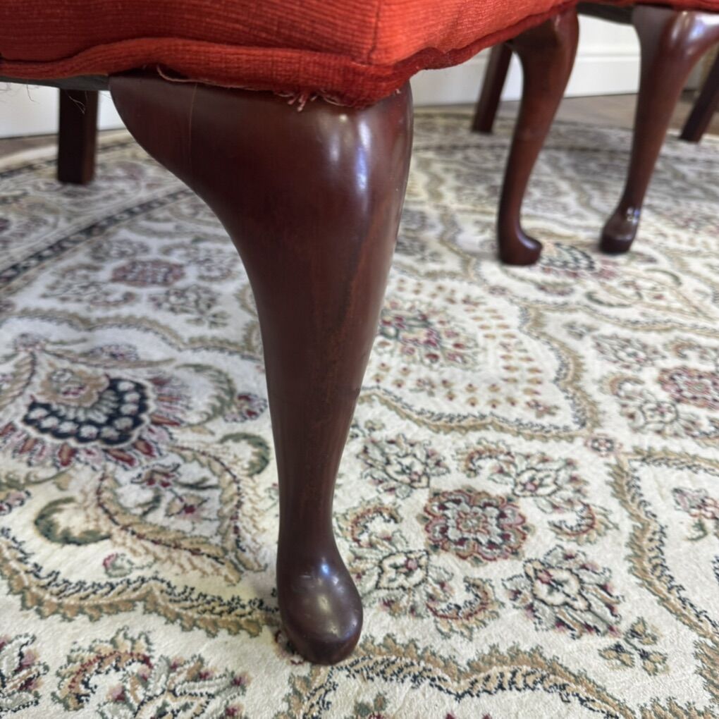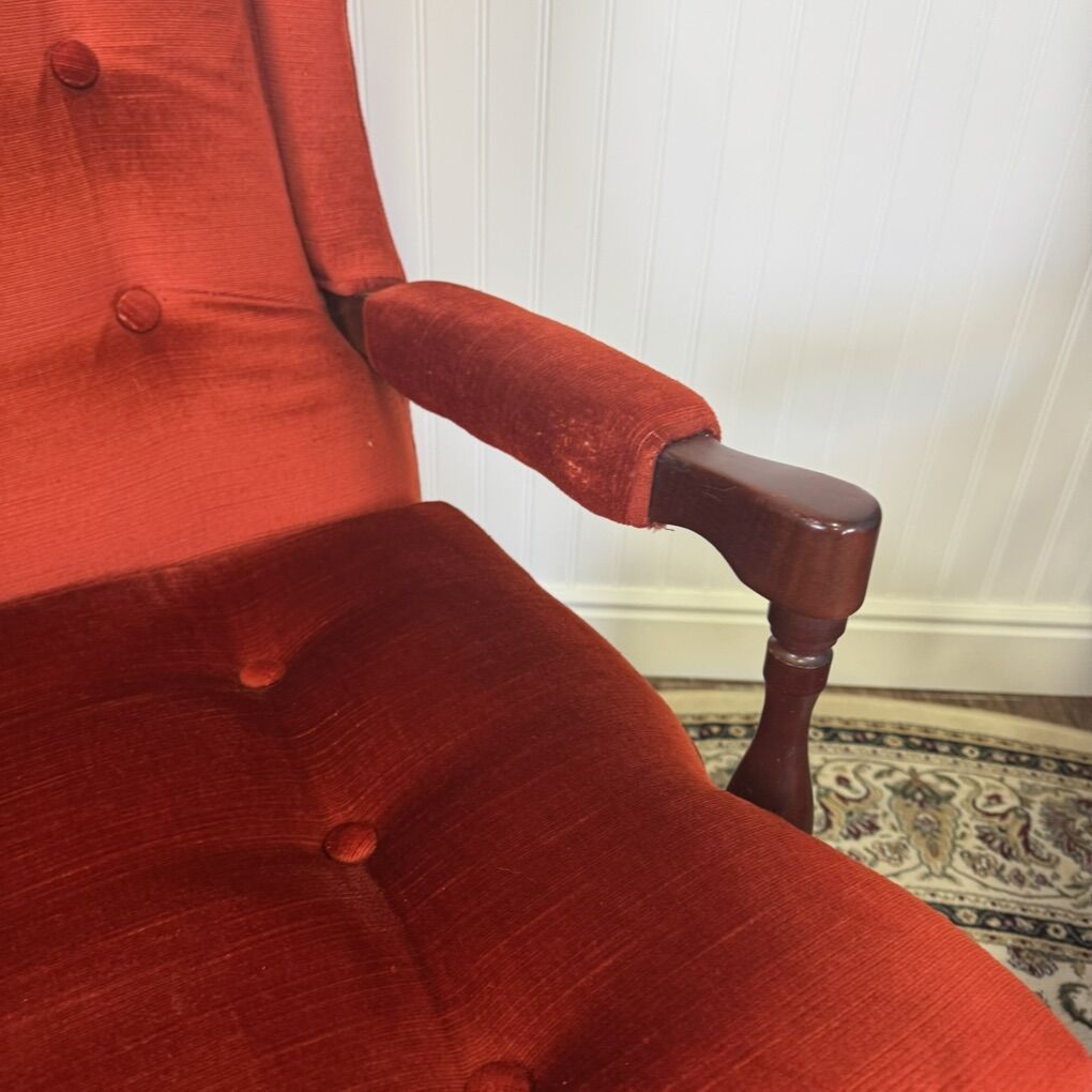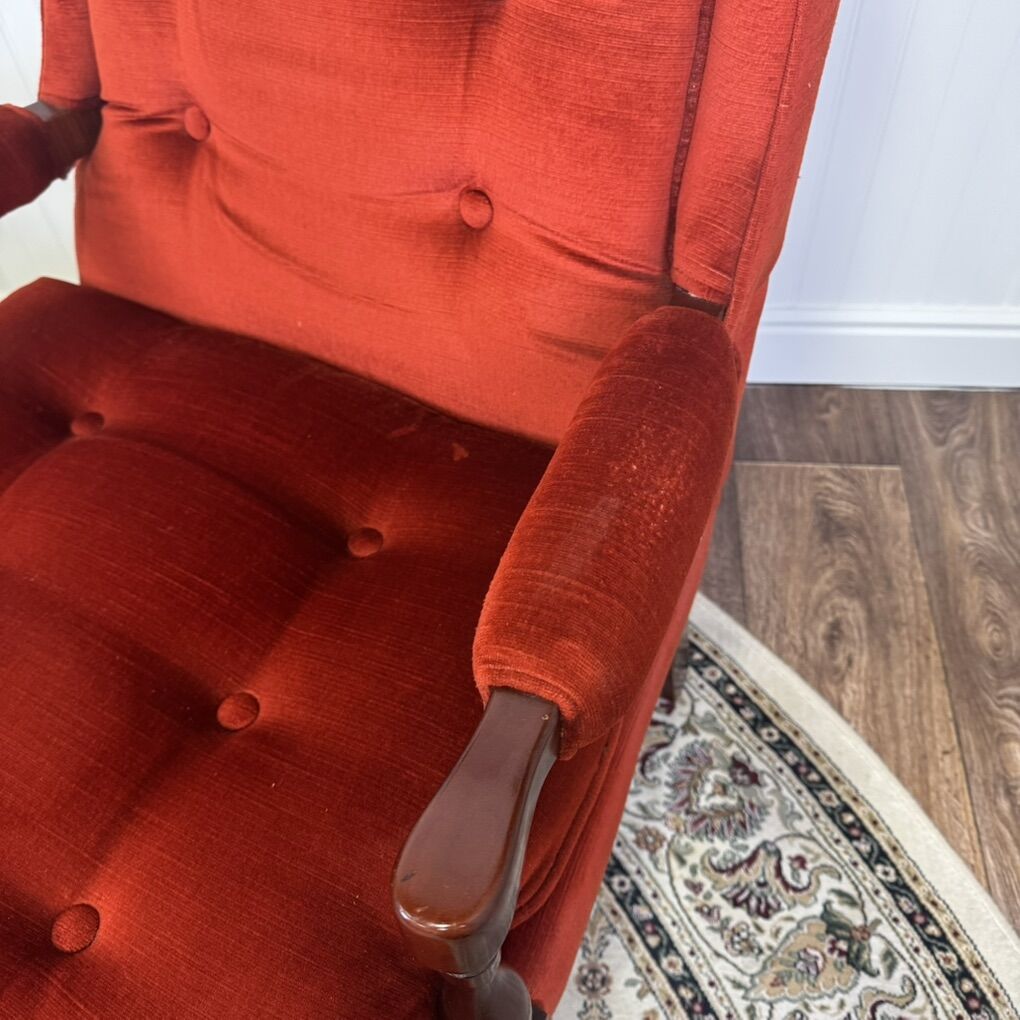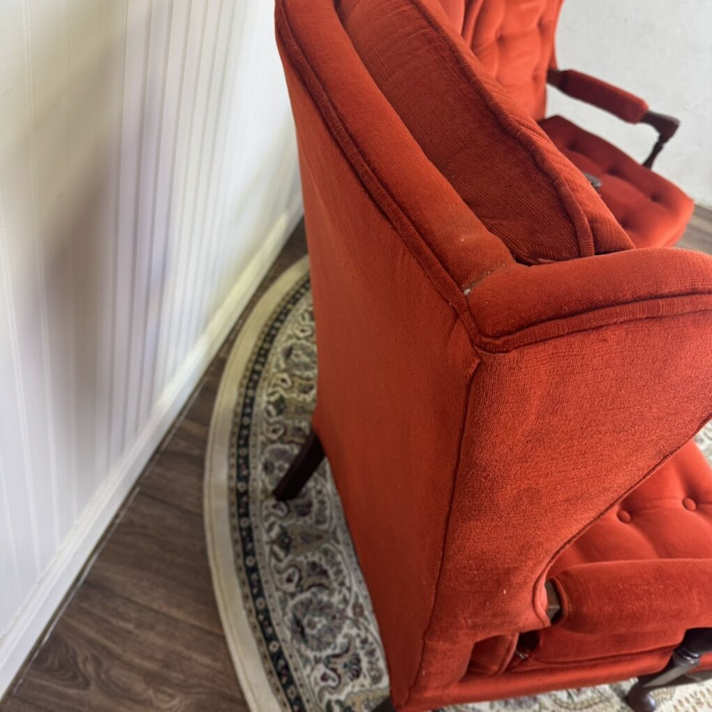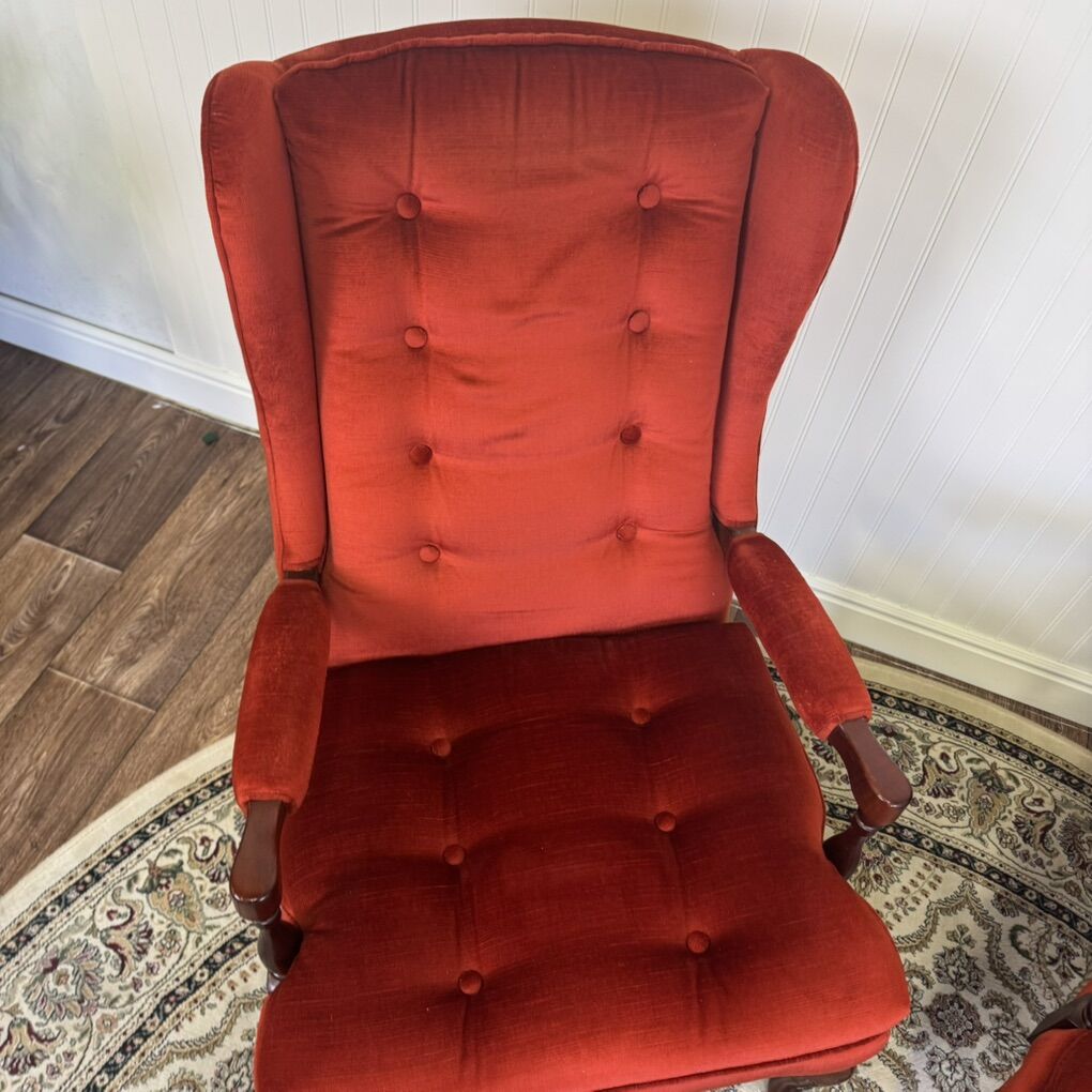 ApplePayGorgeous pair of vintage Laine Furniture wingback armchairs. Upholstered in a vibrant red velvet with deep tufting, these chairs feature classic Queen Anne–style legs and carved wood arm supports. Some light age-appropriate wear: a couple small spots of fabric wear on the arms and minor scratches on the wood (see photos). Perfect for a living room, library, or statement seating in any space. Sold as a pair.