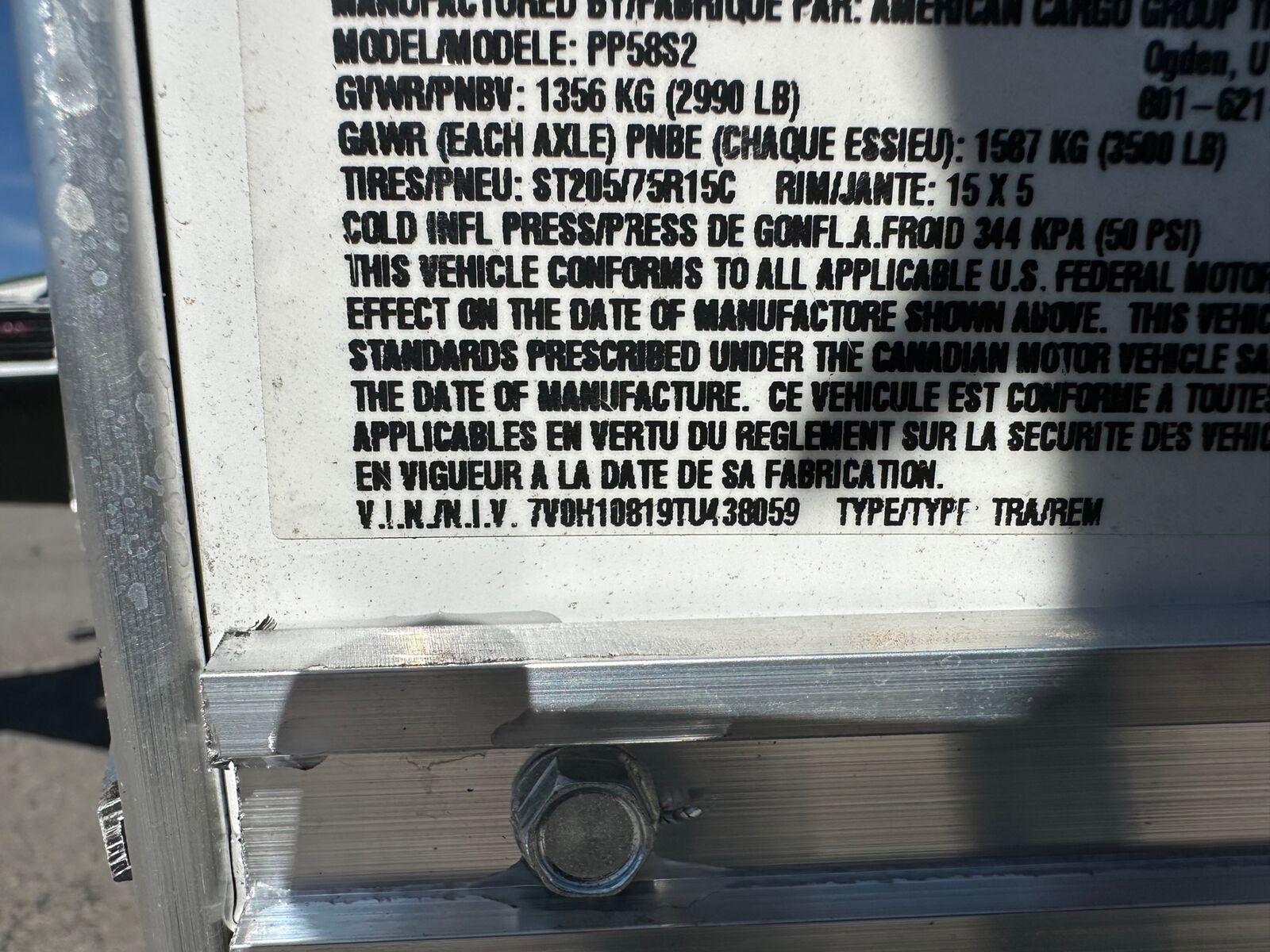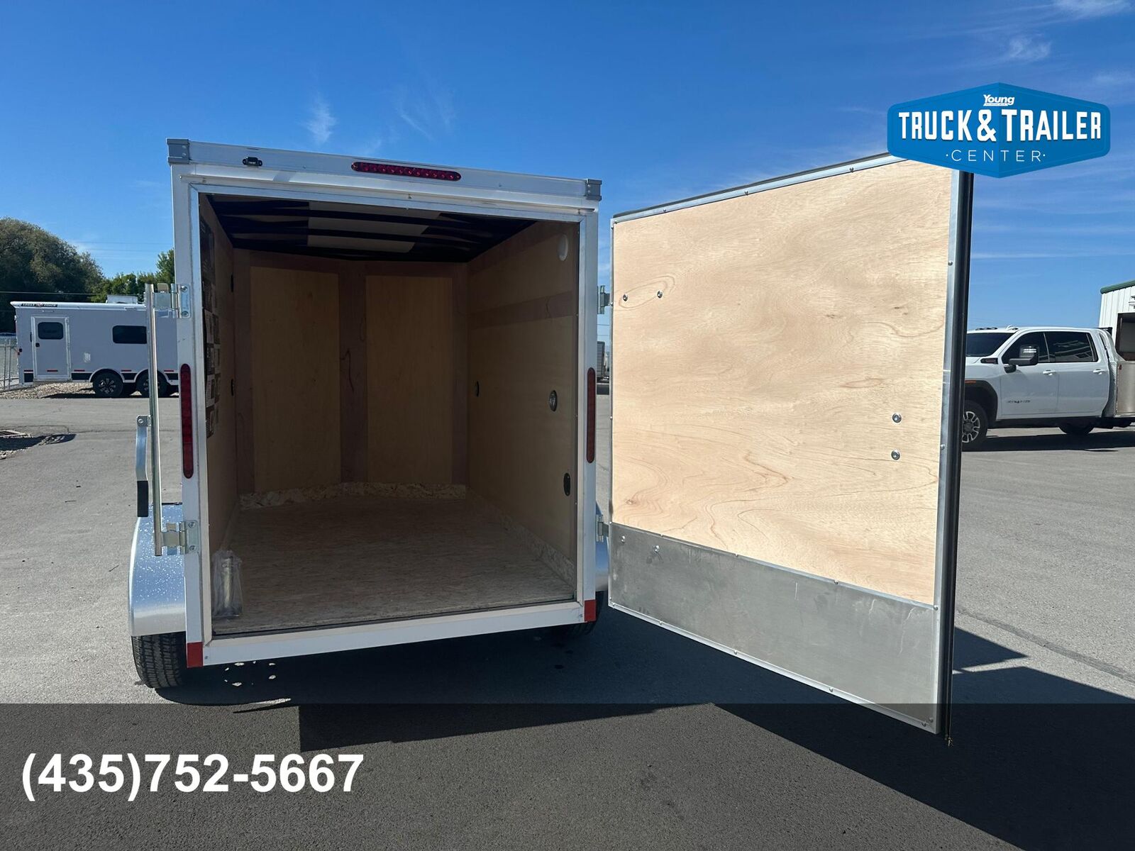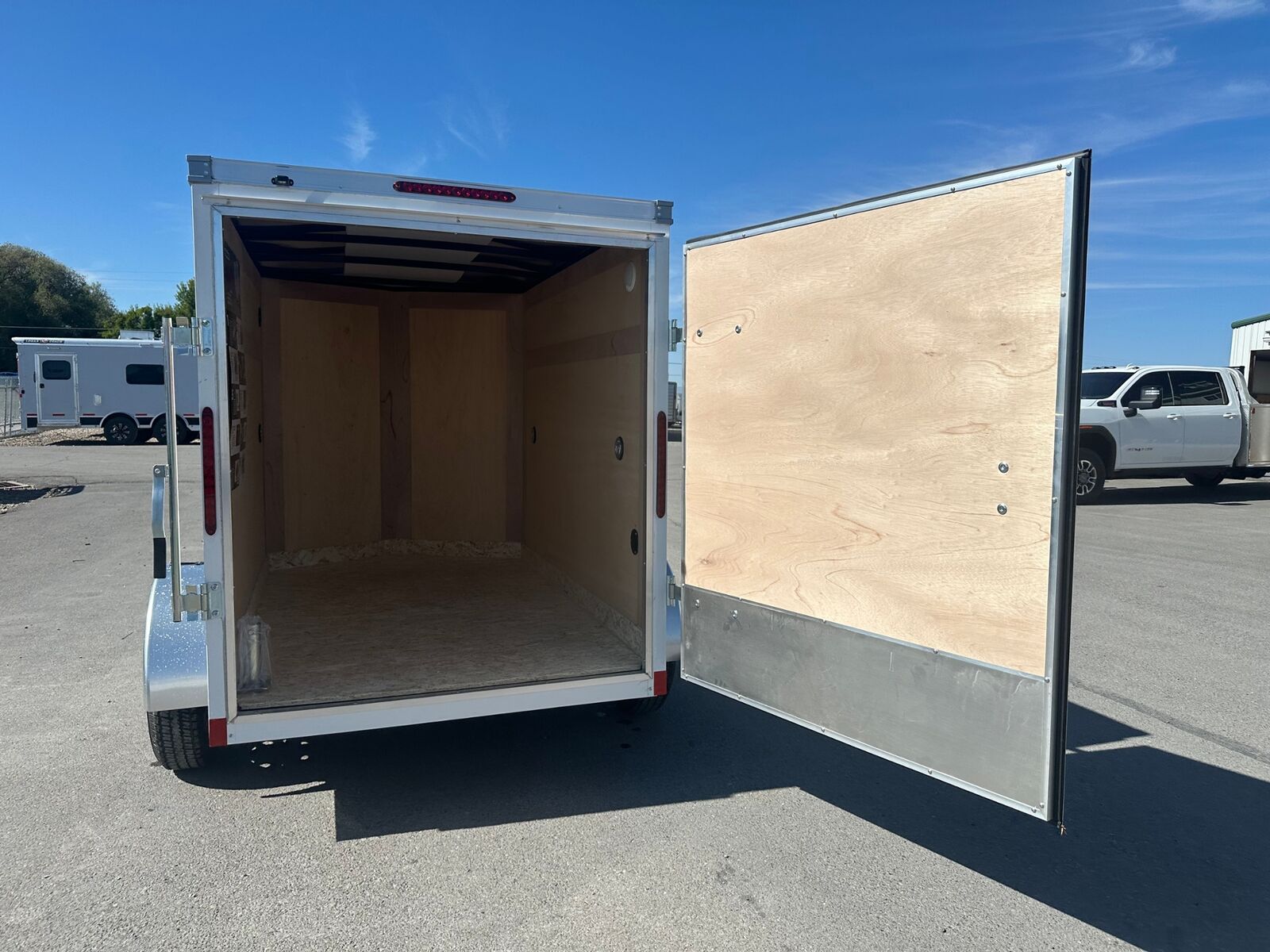 5X8 Barn Door Entire Chassis Undercoated White .024 Aluminum Exterior (With Screws) Safety Chains 3/4" PlexCore High Performance Decking Silver Mod Wheels E-Z Lube® Hubs Pass-Thru Side Door with Flush Lock & Dead Bolt Rear Ramp Door with Spring Assist Flow-Thru Sidewall Vents 12v LED Exterior Lighting 16" OC Floor Crossmembers 16" OC Vertical Posts 15" Radial Tires 16" Starbright Stoneguard Smooth Aluminum Radius Fenders 12v LED Dome Light Economy Sidewall Liner Spring Axles with 4" Drop 1-Year Limited Warranty 2" x 3" Tube Main Rails (Single Axle) 2" x 4" Tube Main Rails (Tandem Axle) 24" OC Tube Roof Structure 500 lb. Surface Wall Mounted Rope-Ring (4) *5' Wide Models Feature Single Swing Rear Door and NO Side Door as standard.