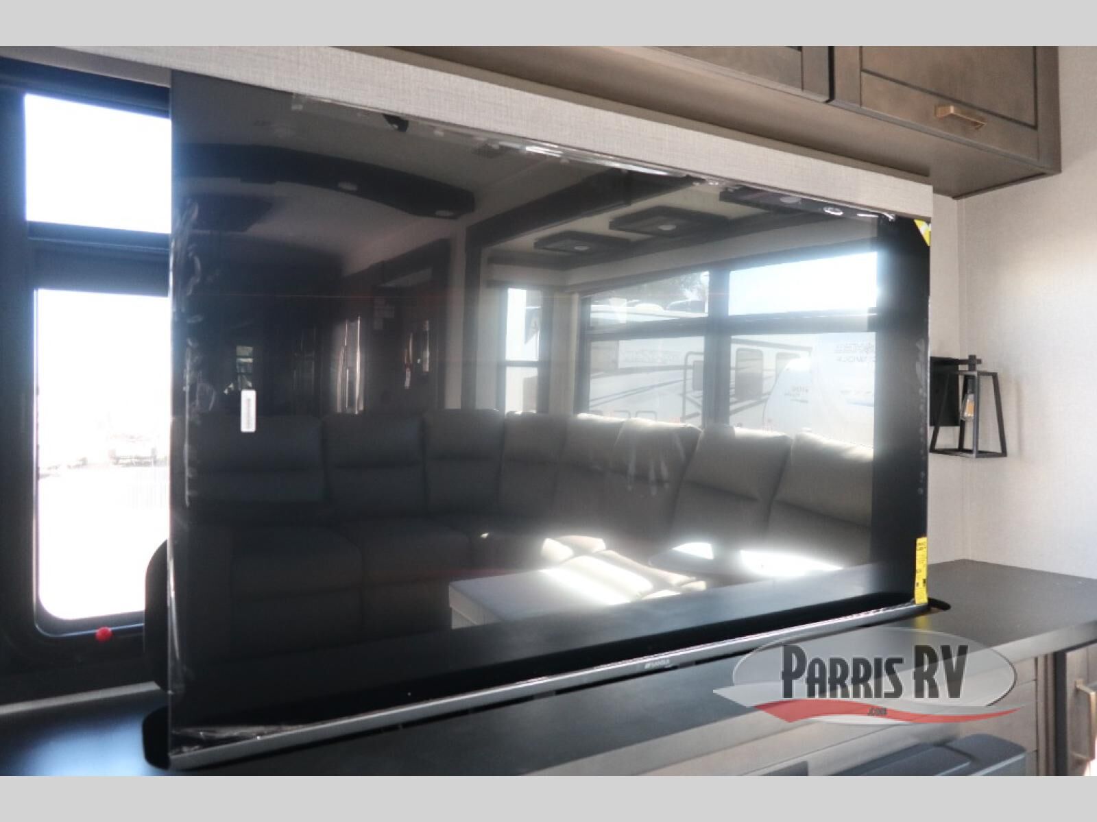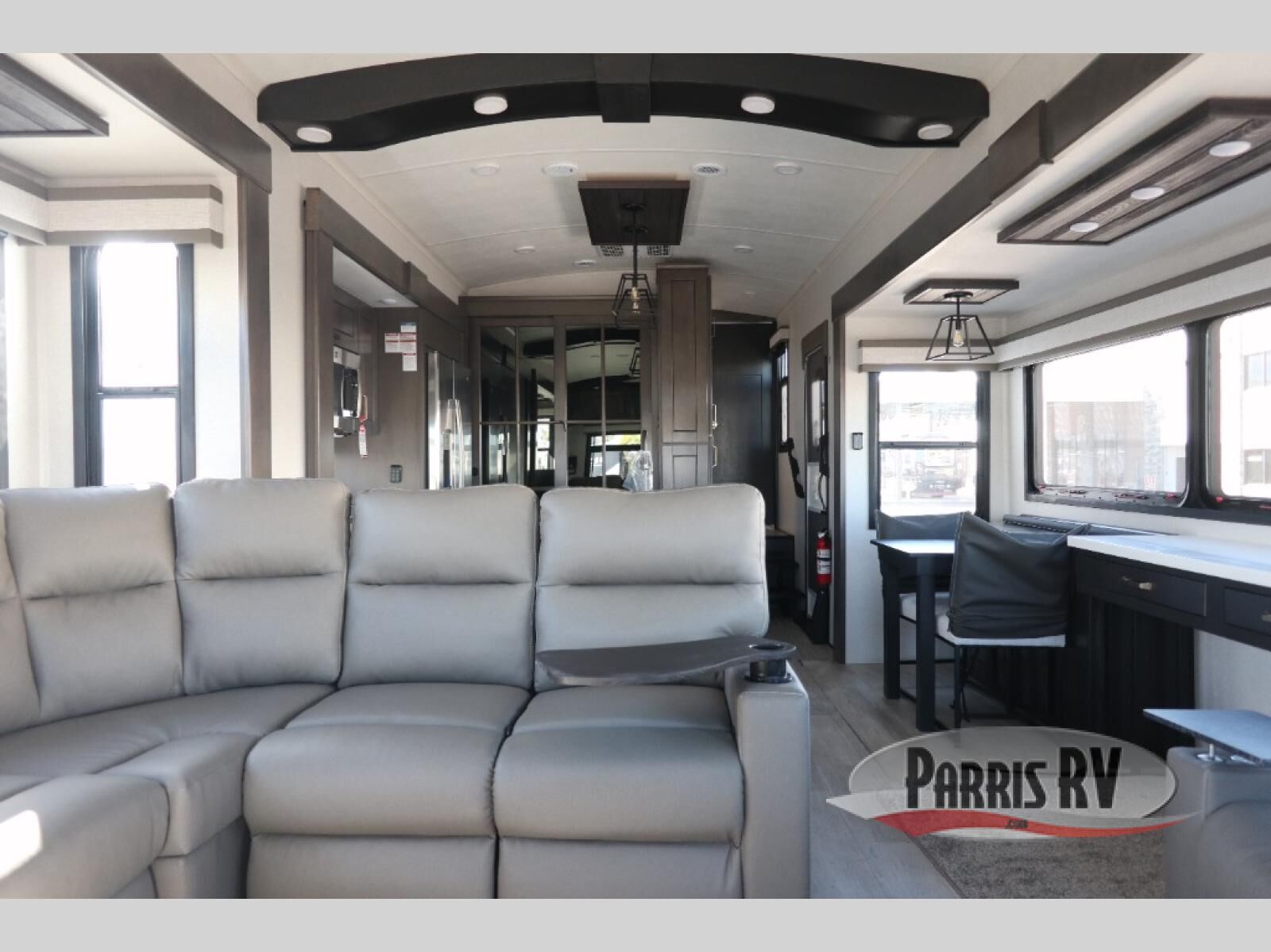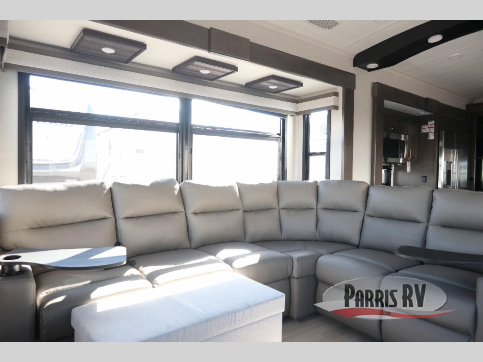 At the front of this 38RE layout, you'll find a private bedroom featuring a spacious 72" x 80" king bed slide-out, creating a comfortable retreat to rest and recharge. The room also includes a wardrobe and dresser with a TV above, providing ample storage for clothing and essentials. Moving down the hall, the full bathroom offers both comfort and convenience with its 36" x 48" shower complete with a built-in seat for accessibility, plus linen shelves for added storage. At the heart of the unit, the kitchen is thoughtfully designed with everything needed to cook in comfort, including a pantry, a pull-out cutting board in the island, and a 21-cu. ft. refrigerator. Meal preparation is a breeze with the 24" range or the convection microwave featuring a built-in air fryer. Across from the kitchen, the large slide-out hosts a roll-out table perfect for dining or game nights, as well as a desk/coffee bar and cozy theater seating. At the rear, the entertainment center stands out with a TV lift and fireplace, while the L-shaped lounge and additional theater seat create the ultimate space to relax and enjoy movie nights in style.