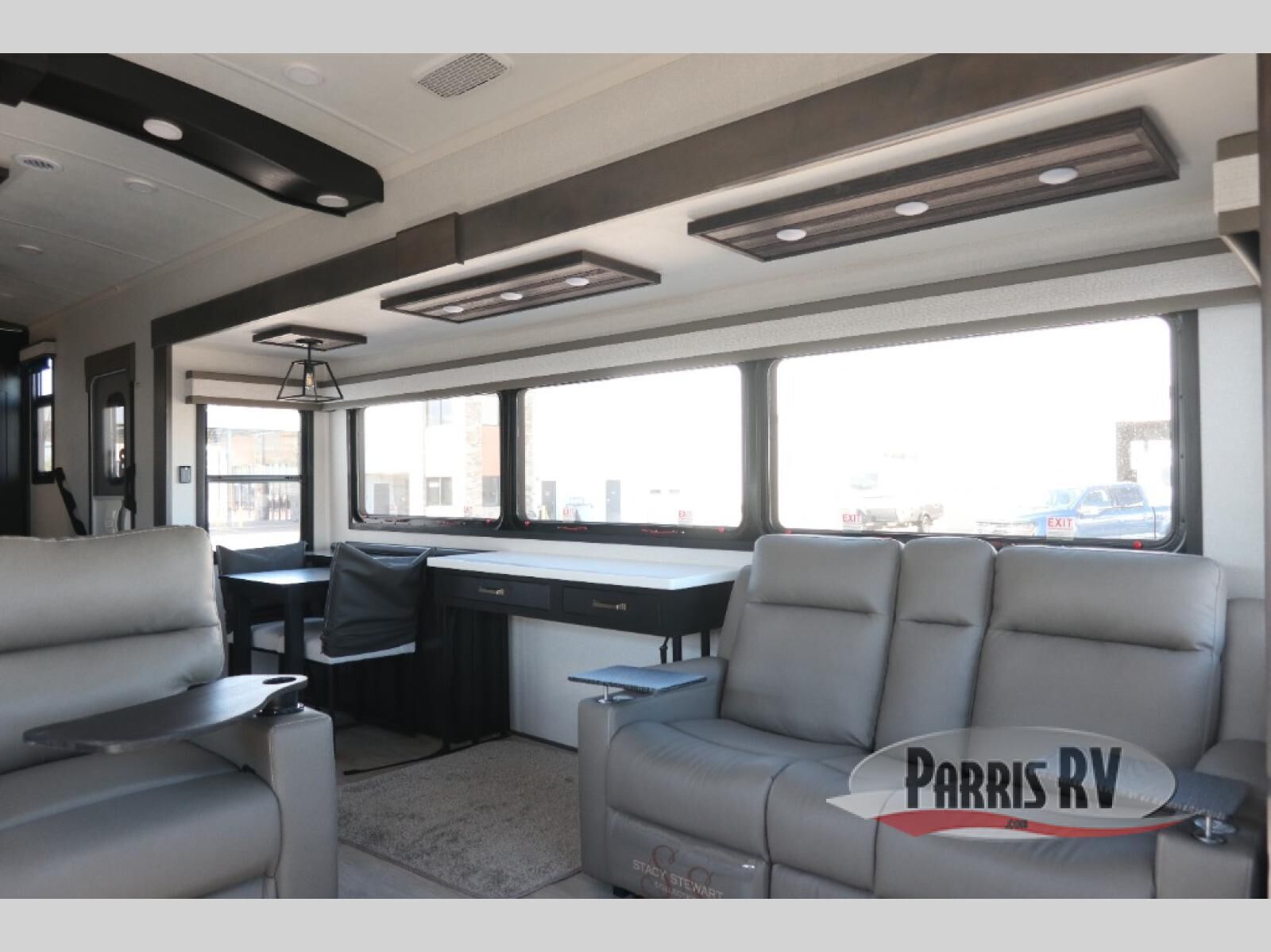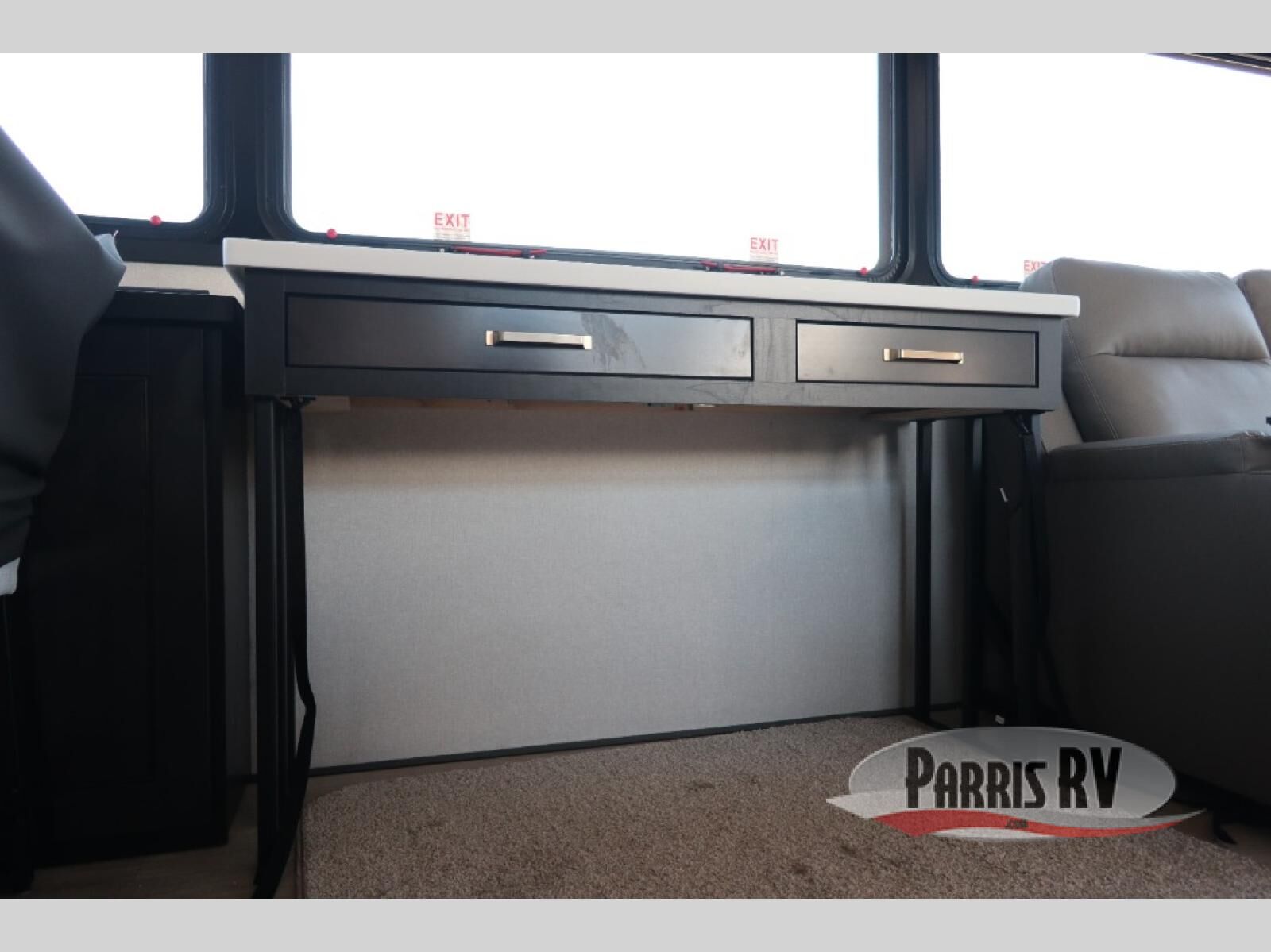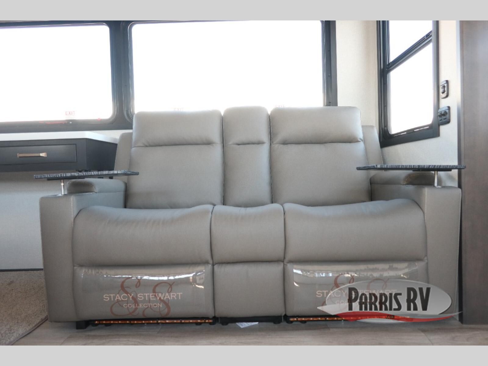 At the front of this 38RE layout, you'll find a private bedroom featuring a spacious 72" x 80" king bed slide-out, creating a comfortable retreat to rest and recharge. The room also includes a wardrobe and dresser with a TV above, providing ample storage for clothing and essentials. Moving down the hall, the full bathroom offers both comfort and convenience with its 36" x 48" shower complete with a built-in seat for accessibility, plus linen shelves for added storage. At the heart of the unit, the kitchen is thoughtfully designed with everything needed to cook in comfort, including a pantry, a pull-out cutting board in the island, and a 21-cu. ft. refrigerator. Meal preparation is a breeze with the 24" range or the convection microwave featuring a built-in air fryer. Across from the kitchen, the large slide-out hosts a roll-out table perfect for dining or game nights, as well as a desk/coffee bar and cozy theater seating. At the rear, the entertainment center stands out with a TV lift and fireplace, while the L-shaped lounge and additional theater seat create the ultimate space to relax and enjoy movie nights in style.