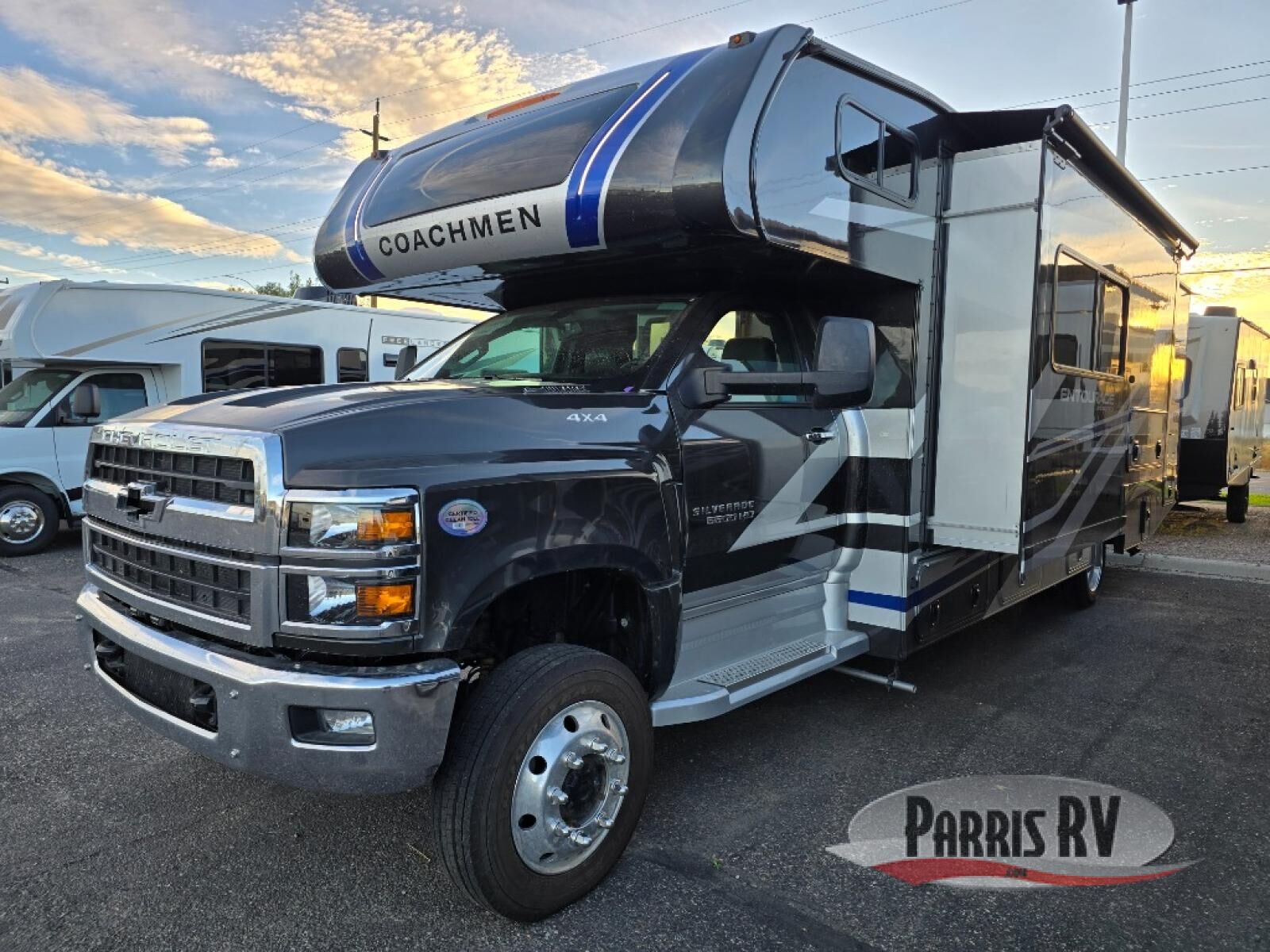 The Entourage is Coachmen's first super C diesel motorhome and it is packed with upscale appointments and solid construction so you can enjoy the RV lifestyle for years to come. This coach features a 4x4 diesel chassis (either a Chevy Silverado 5500 with a V8 6.6L diesel engine, or International CV chassis, depending on the model you choose), plus 50 amp service and a 2,000 watt inverter for all your power needs. The mandatory Icon Package includes a porcelain macerator toilet, auto generator start with dual batteries, 50 amp service, a tankless water heater, and more!