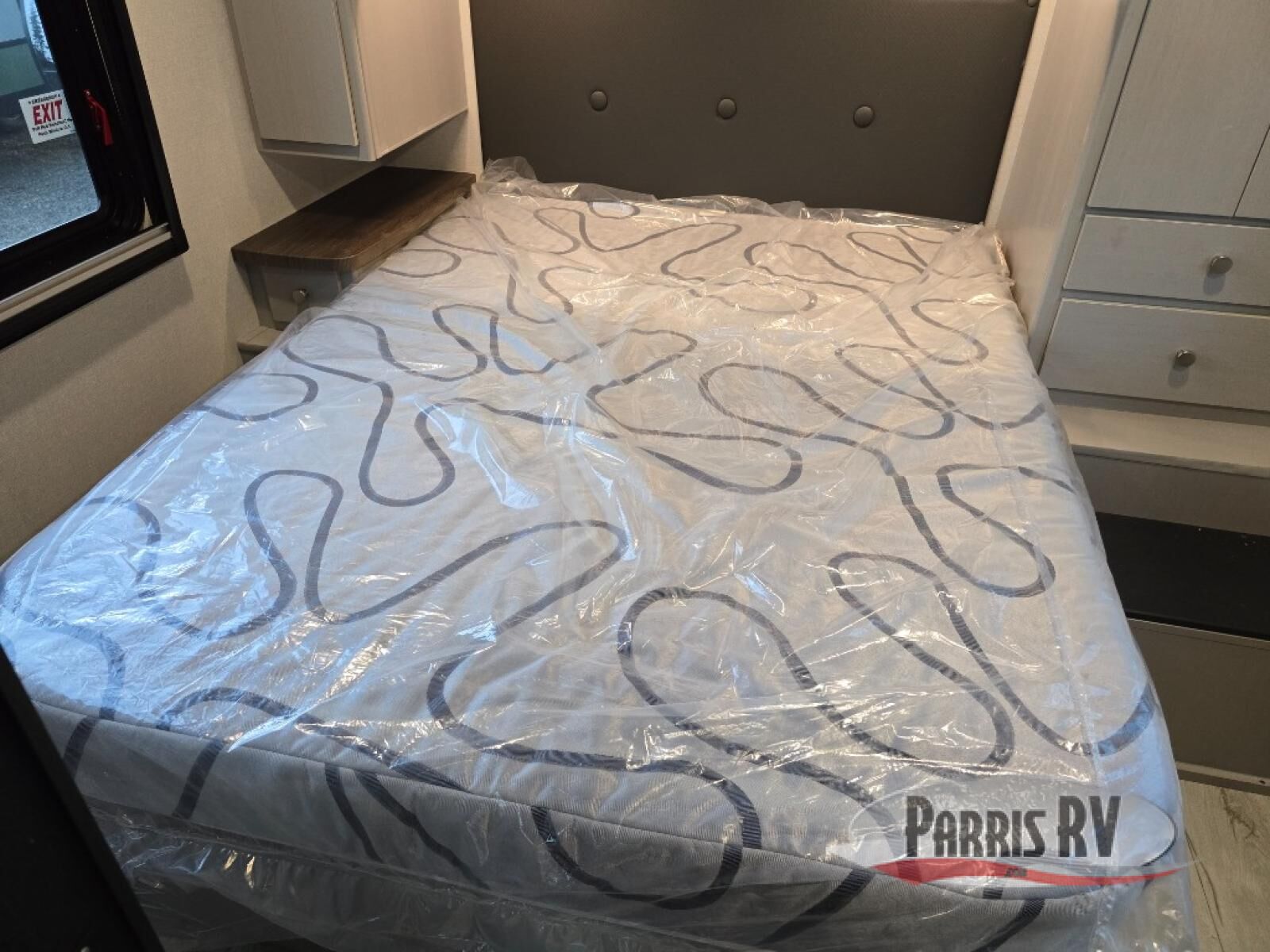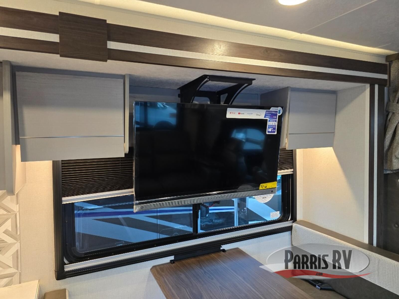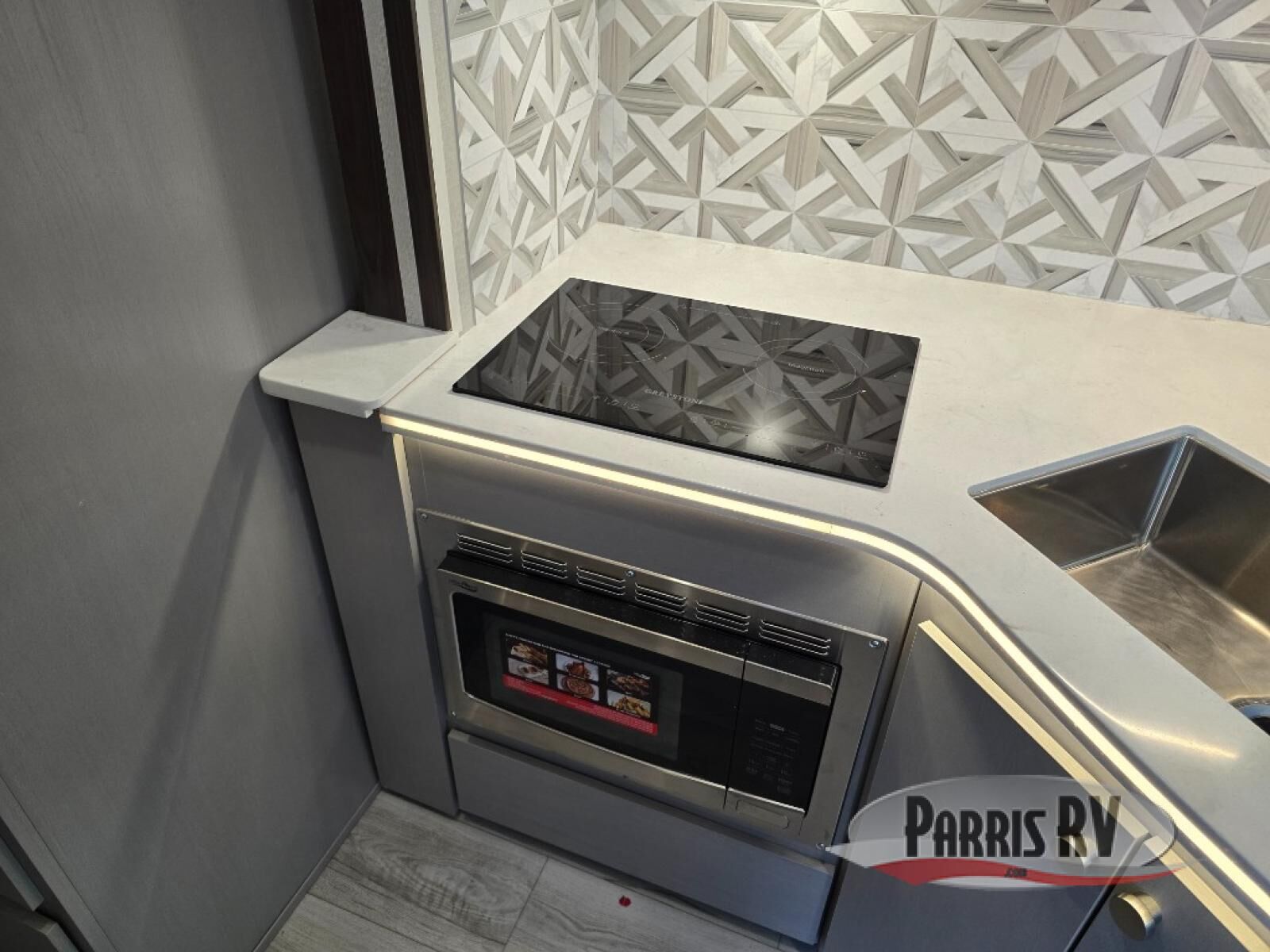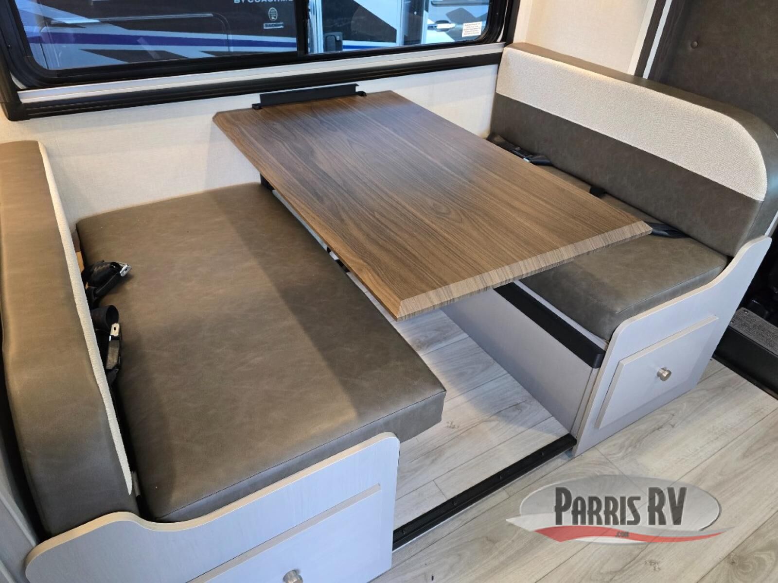 Pack your bags and head across the state in this durable coach. You can sleep five to six each night between the queen bed in the rear bedroom, the cab-over bunk, plus the booth dinette that will convert to sleeping space. The power recliners are sure to bring comfort after a day of traveling, or you can head outdoors to enjoy the outside TV and exterior grill table. When you get hungry, you can make lunch on the induction cooktop or in the convection microwave, and there is a 10 cu. ft. 12V double door refrigerator to keep your cold items fresh. A full bath is ready for you when you want to freshen up, and you'll find a wardrobe right across from the bath to keep clothes and linens ready to use. And the washer and dryer combo prep gives you the option to add these appliances if you choose!