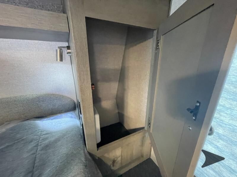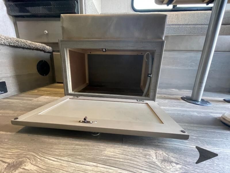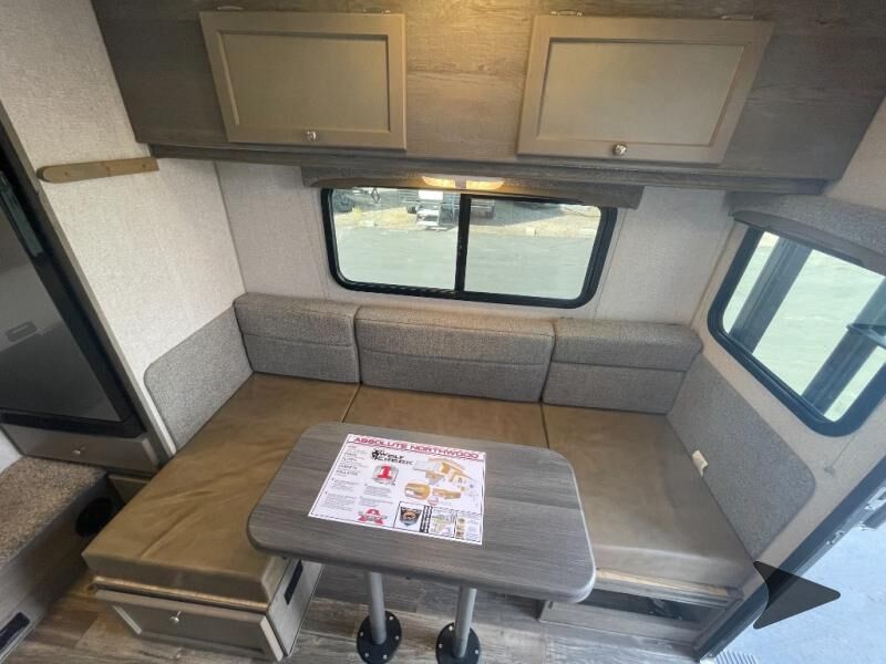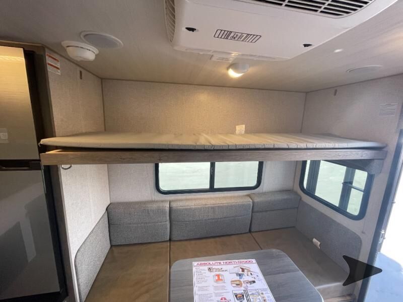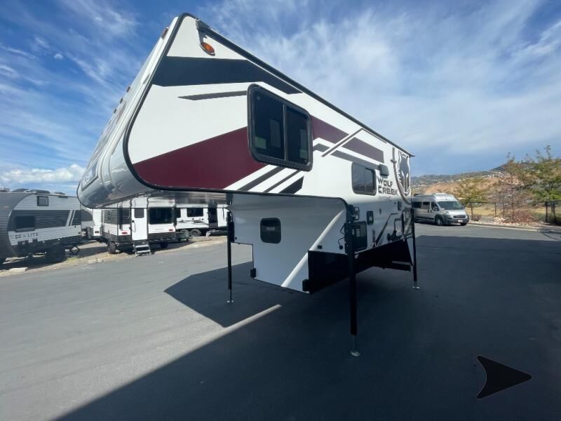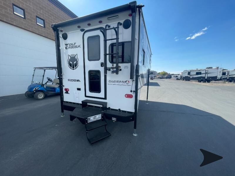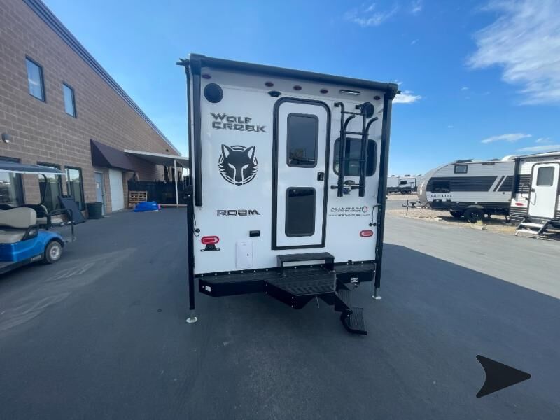 Northwood Wolf Creek truck camper 850 highlights: Wet Bath Pantry Three Wardrobes U-Shaped Dinette 8 Cu. Ft. 12V Refrigerator Head across the states in this comfortable truck camper for four. Once you find a campground to park for the night, start lunch on the three burner cooktop, or use the residential microwave with an air fryer for a quick meal. The U-shaped dinette will be the perfect place to dine at, or you can choose the optional roll-over sofa here. The dinette converts to a 38" x 77" sleeping area, plus there is an overhead bunk. You will enjoy the front 58" x 80" queen bed that includes three wardrobes and a nightstand for your things, and don't forget to add the optional 24" 12V LED TV for movies in bed. With any Wolf Creek truck camper by Northwood you can camp year around thanks to the high density block foam insulation, thermal pane windows, and the multi-layered substrate walls. The durable fully welded, thick-wall aluminum frame construction will add durability, and the Corona treated fiberglasswill help combat leaks so you can enjoy your camper for years to come. Each model includes fabric night shade window treatments, custom one-piece formed countertops and dinette table, hardwoodcabinet doors, and many more comforts. You will love the high value features included within the Wolf Pack, such as a Fox Landing ready rear bumper, a premium vent, electric jacks, and outside speakers.