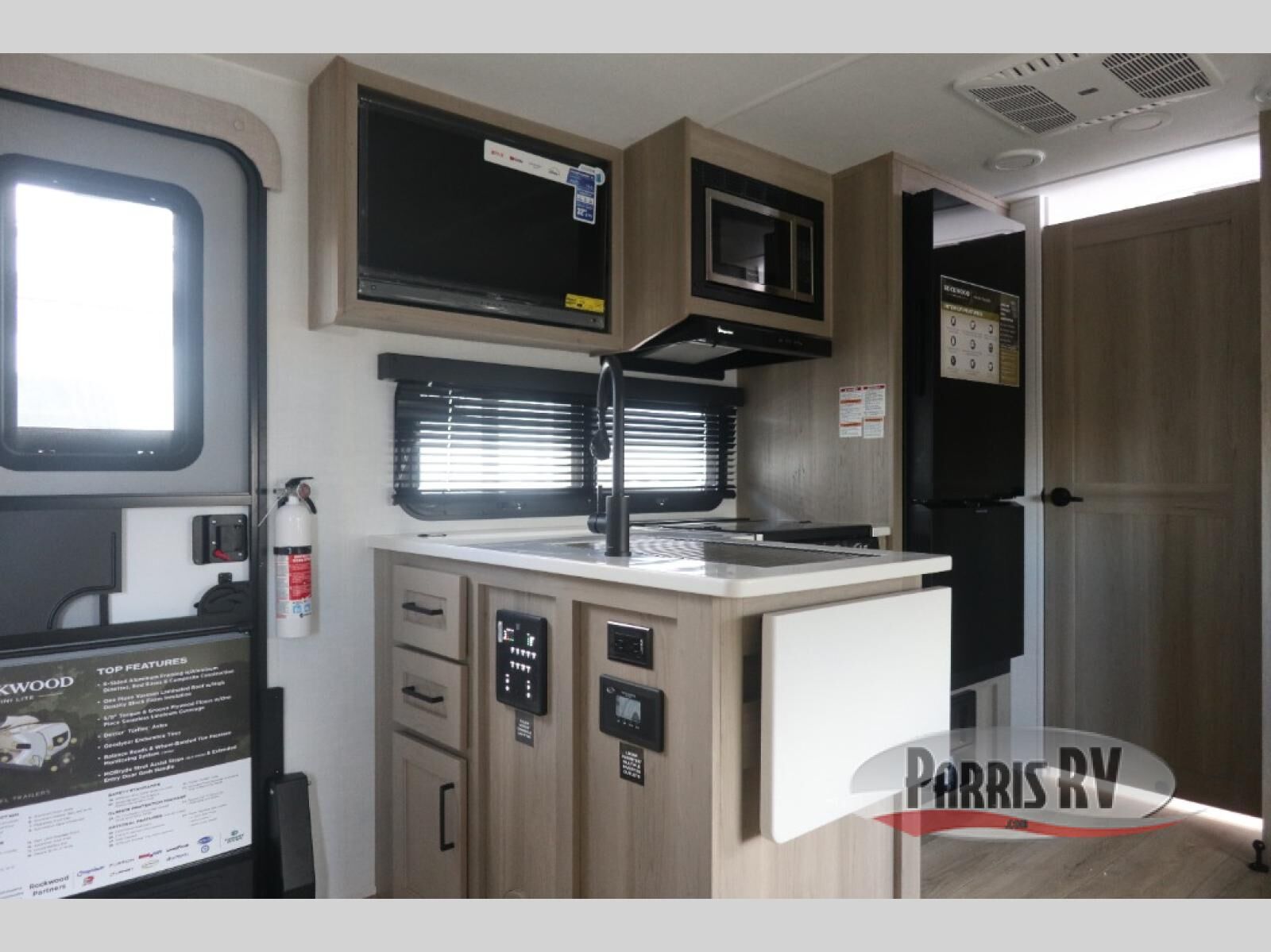 Each Rockwood Mini Lite travel trailer by Forest River is constructed with a fully laminated one-piece walkable roof, sleek frameless windows, and a six-sided full aluminum frame for strength and durability. The 12V thermostatically controlled heated tanks, plus radiant foil in the underbelly will allow you to camp well into the colder months, and the 200W roof solar panel will be perfect for a little off-gridding. Each model includes solid surface kitchen countertops, hidden hinge cabinet doors, roller shades, plus many more interior features. Having an AIR 360+ omnidirectional antenna with WiFi prep on board gives you the option to get some work done if it's needed, and the power tongue jack provides hassle-free set up, so you can enjoy more time relaxing!