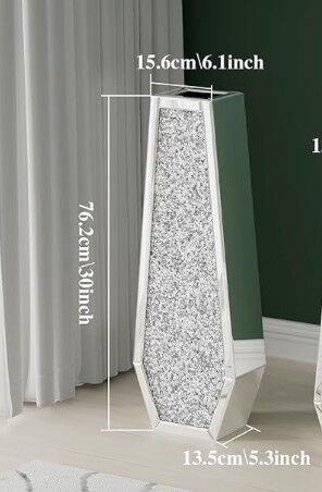 About this item Crushed Diamond Design: Add a touch of elegance to your home with this tall floor vase, featuring a stunning crushed diamond design. The shimmering accents create a luxurious look, making it a perfect centerpiece for your living room, entryway, or dining area. Material&Size: Crystal mirror and glass on the surface, lots of sparkly crushed diamond crystal sparkle glaring on the front and back, inside MDF construction. Thick and strong, elegant and stable. We offer pink, gold and silver color styles with sizes 24",30"and 36" available. Versatile Floor Vase: Beautiful anywhere indoors as an artistic display on its own or paired with dried flowers. Whether placed in your living room, bedroom or dining area, the diamond mirrored floor-standing vase will undoubtedly become the focal point of your space. In addition, it is also a good choice for weddings, party decorations or heart-warming gifts for family or friends. Please note that the diamond vase can't hold water. Application: This large floor flower vase is grand and luxurious. It can be used to decorate living rooms, bedrooms, dining rooms, and offices, as well as exhibition halls, entrances, corridors, restaurants, hotels, bars, festivals, and weddings.