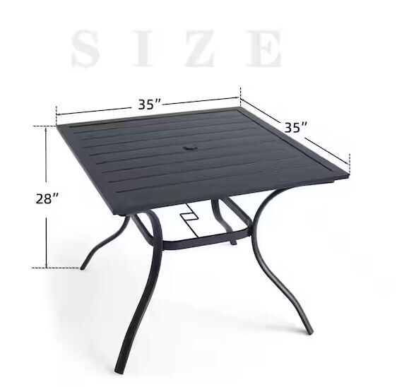 Highlights Standard dining height Weather-resistant powder coating Premium alloy steel frame 1.6 in. umbrella opening with cap Table size W 35 in. x L 35 in. x H 28 in. Seats 4