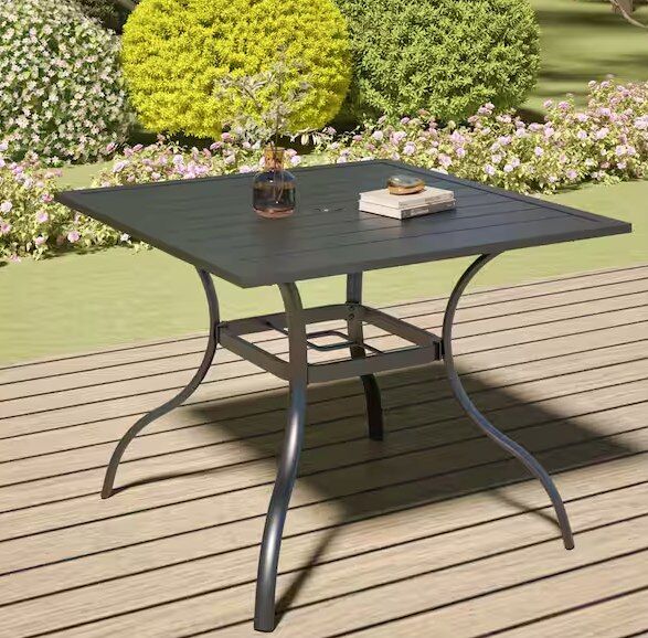 About This Product Basic, essential, and timeless, this traditional outdoor dining table sets steel slats within a sturdy metal frame. Outfitted with a 1.6 in. umbrella hole in the center, this table holds most 9/10 ft. umbrellas. Pair with any dining chairs for an enjoyable leisure experience.