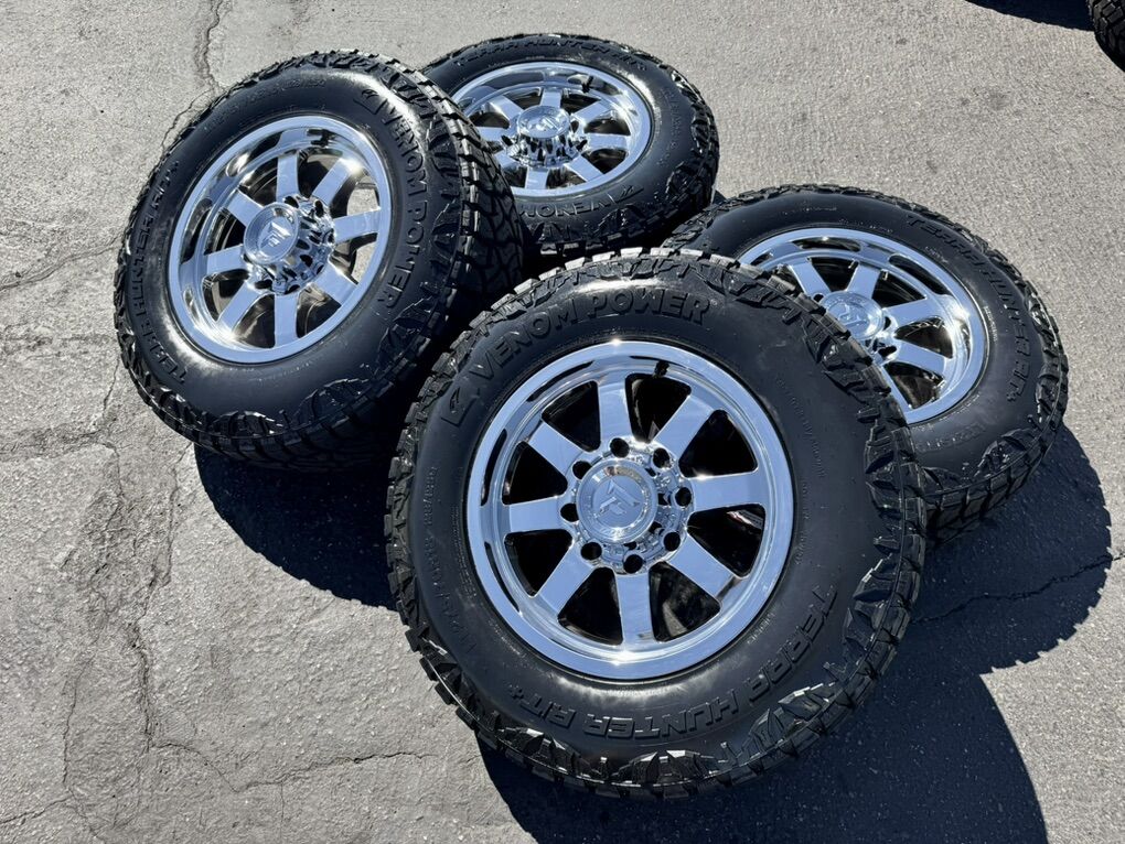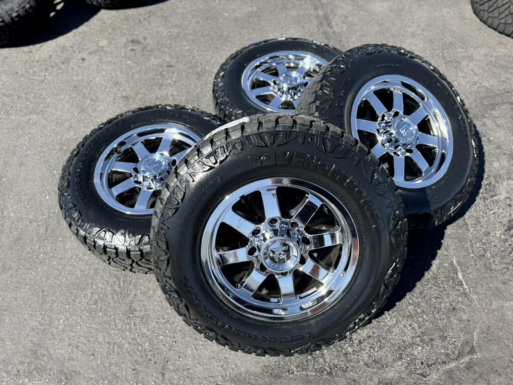 ZelleLocated in SLC On Special! Brand new package! 18x9 Chrome Fittipaldi FA16 wheels +12 et offset. Mounted and balanced on 33” LT275/70r18 Venom RT+ tires. Load range F 12ply 80 psi with 128/125Q load and speed index. 8x180 bolt pattern, these fit 2011 and newer chevy silverado and gmc sierra duramax trucks. HUGE Savings