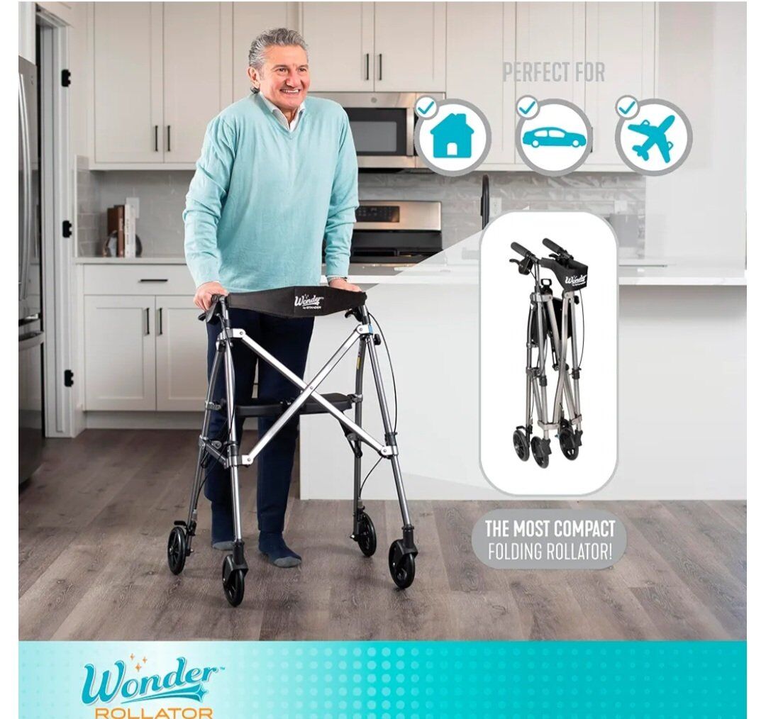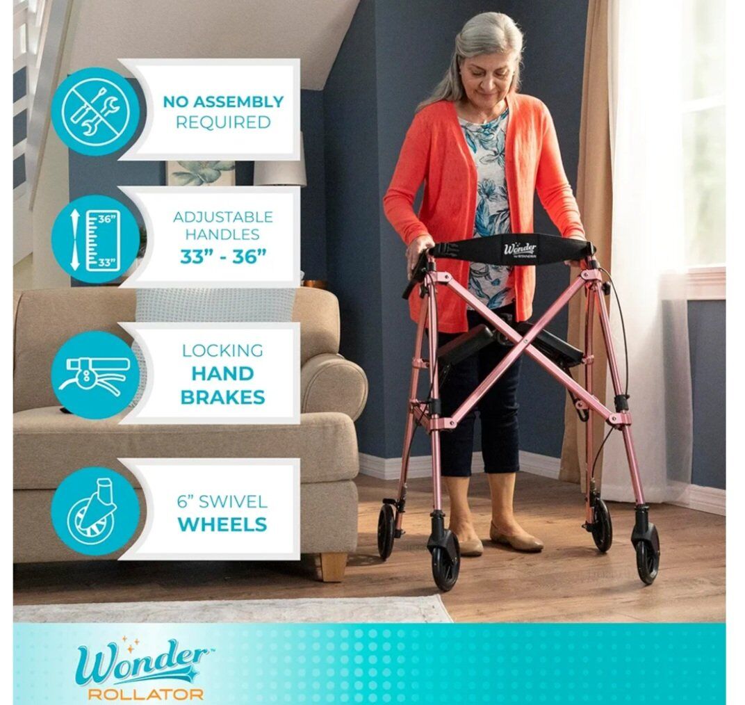 Stander Space Saver Rollator, Lightweight Folding Rolling Walker with Seat for Seniors & Adults, 4-Wheel Mobility Aid with 6-inch Wheels, Locking Brakes & Padded Seat with Backrest, Black Walnut