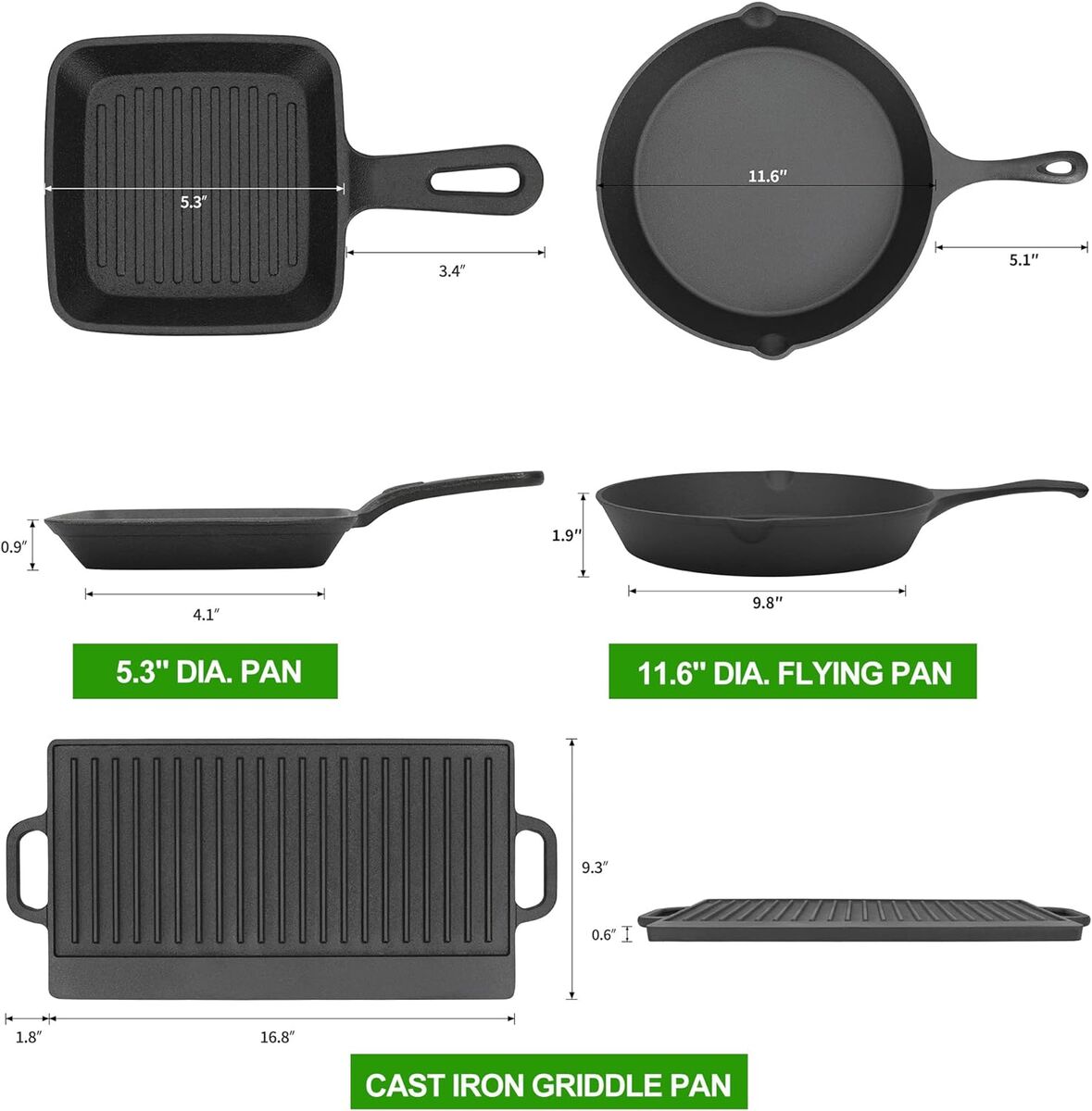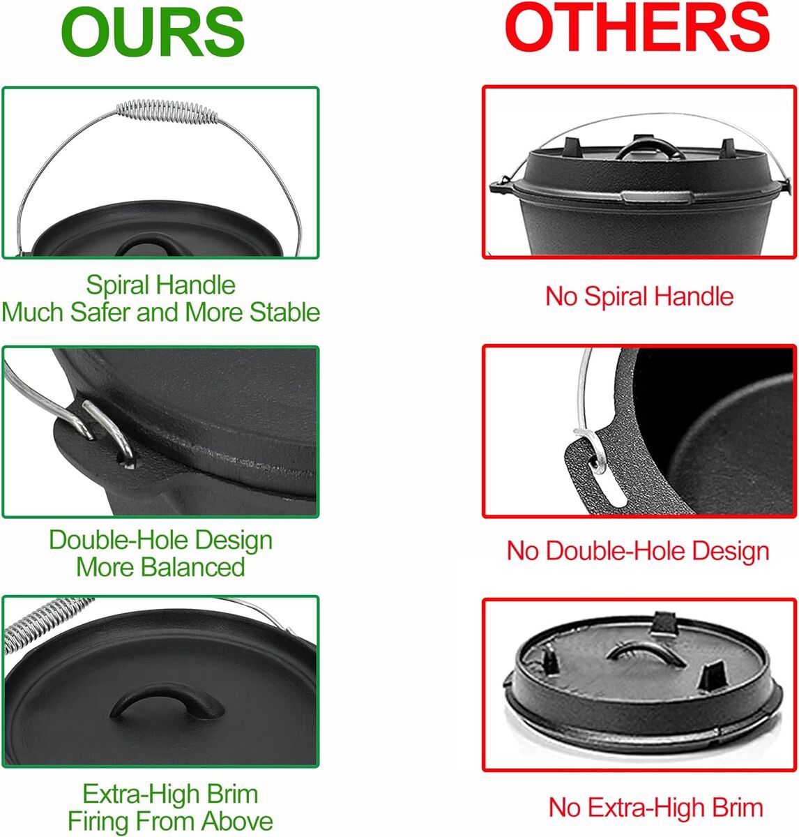 Lifetime DurabilityDutch oven,well known as a lifetime pot,it is made of high-quality cast iron which makes it robust to indestructible,your dutch oven set will last a lifetime if cared for properly!Eco-friendly materials are non-toxic and pollution-free,the surface is coated with specialized electrophoretic chip resistant coating to offer enjoyable cooking without safety worries,food can be directly placed on the grill,even under high temperature,it will not produce hazardous substances 8 Piece Dutch Oven Cooking SetThe 8-piece camping cookware set has kitchen utensils for each meal:1x4.5qt dutch oven pot;1x2.1qt saucepot;1x 20.4L x 9.3W cast iron griddle pan with heat grooves and raised edge;1x 16.7 lid and pot lifter to easily open the lid or carry the cookware from fire to serving area safely;1x 5.3 dia. dutch oven stand to act as pot stand and lid holder,also act as an additional cooking surface;1x5.3 dia. Pan;1x 11.6 dia. flying pan;1xwooden carrying storage box 4.5qt Dutch Oven Pot4.5 quarts casserole pot is large enough for all of your camp’s cooking needs,suitable for 5-7 people.Equipped with a tight-fitting lid with extra-high brim that allows holding coals on the top for firing from above.Thanks to the tight-fitting lid,the oudoor camping dutch oven pot can better collect heat and accelerate cooking effectively.The spiral stainless steel wire handle effectively prevents heat from transferring to the handle,protect your hands from being burned! Pre-seasoned Cast Iron Dutch OvenWe’ve done the pre-seasoning work,you can start cooking directly!The dutch oven cooking set features superior heat distribution and heat retention thanks to the sturdy cast iron,make it particularly suitable for cooking and baking outdoors!It is ideal for stewing,simmering,roasting,frying,braising delicious meal directly over an open fire or a campfire or with burning ash,you aslo can use the dutch oven as real ovens to make cookiesbread,pizza and even cakes Perfect Outdoor ExperienceMaking camping cooking easier and more enjoyable than ever before with the 8-piece cast iron dutch oven cooking equipment when you're outdoors!This is perfect gift for outdoor enthusiasts and people who enjoy camping,RV lifestyle,hiking,fishing,hunting,camp fire cooking and outdoor cooking!The cookware set is also ideal for home cook who discover the allure of cast iron;for the guy with a penchant for cooking;for the grandmother who would like to go back to nature
