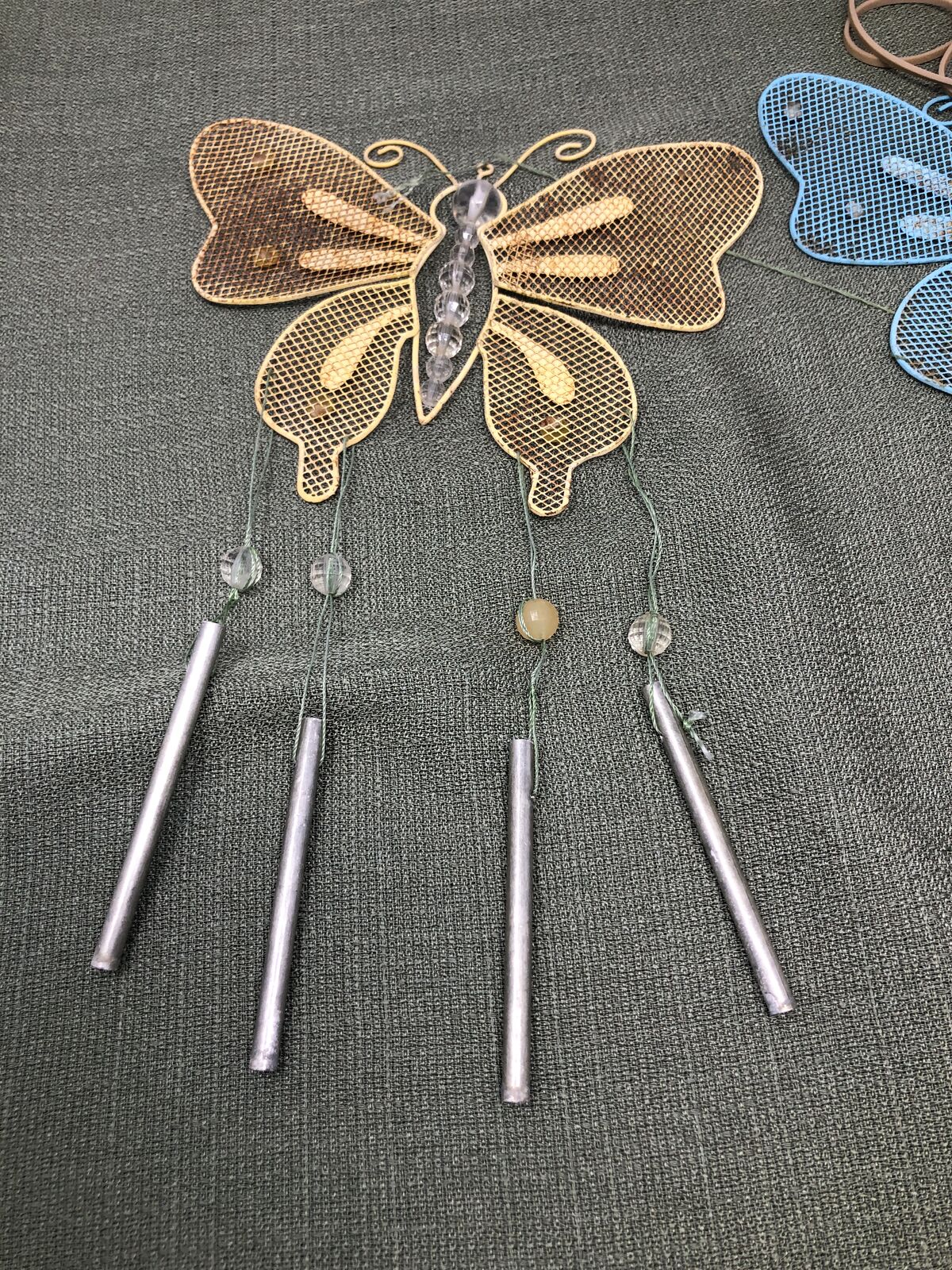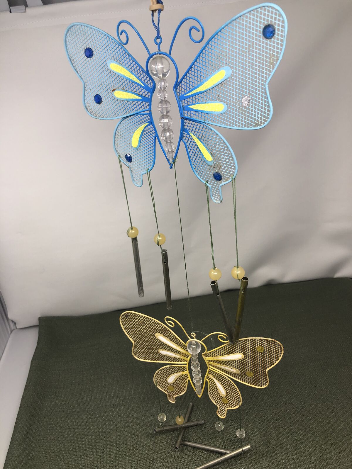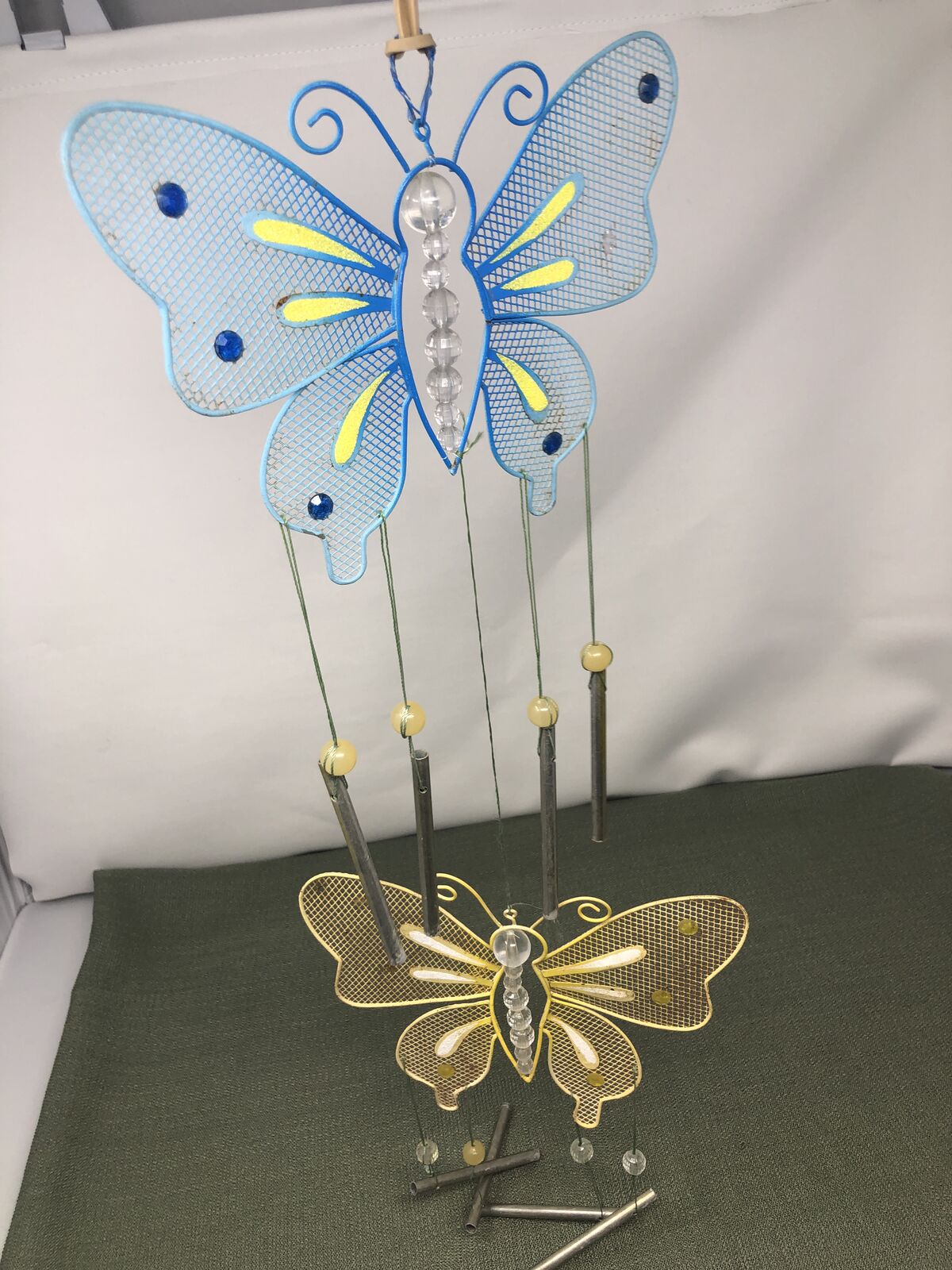 We are selling this beautiful butterfly windchime for $18! The windchime contains 2 butterflies and 8 chimes both with beautiful beaded design. The butterflies are connected and will hang beautifully from your porch, garden, patio, or even any trees that you may have! Features a delicate butterfly design Produces a light, calming chime in the breeze Perfect for porches, patios, gardens, or as indoor décor Makes a thoughtful gift for nature lovers Measurements (while stacked): W 7 1/8 x L 10 x H